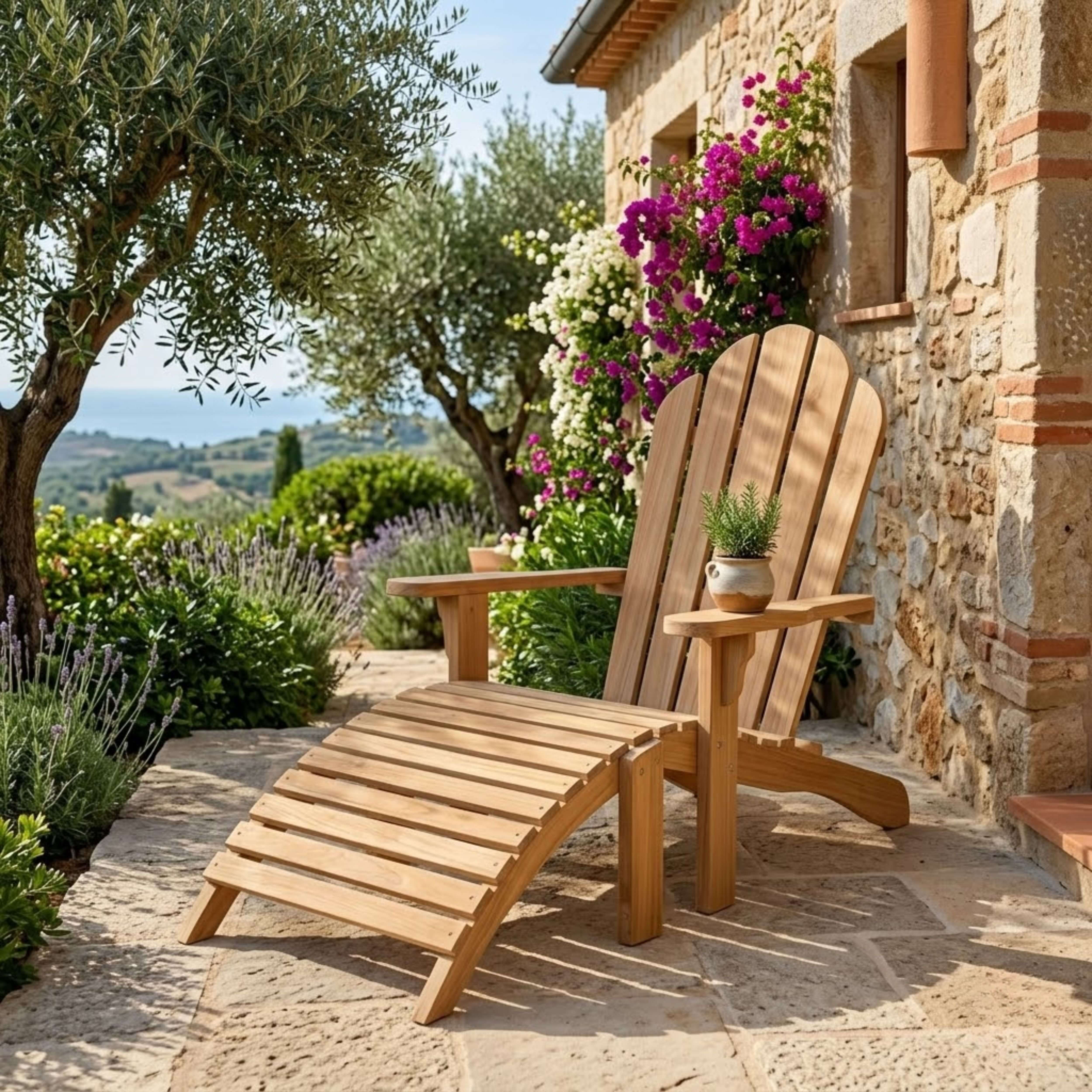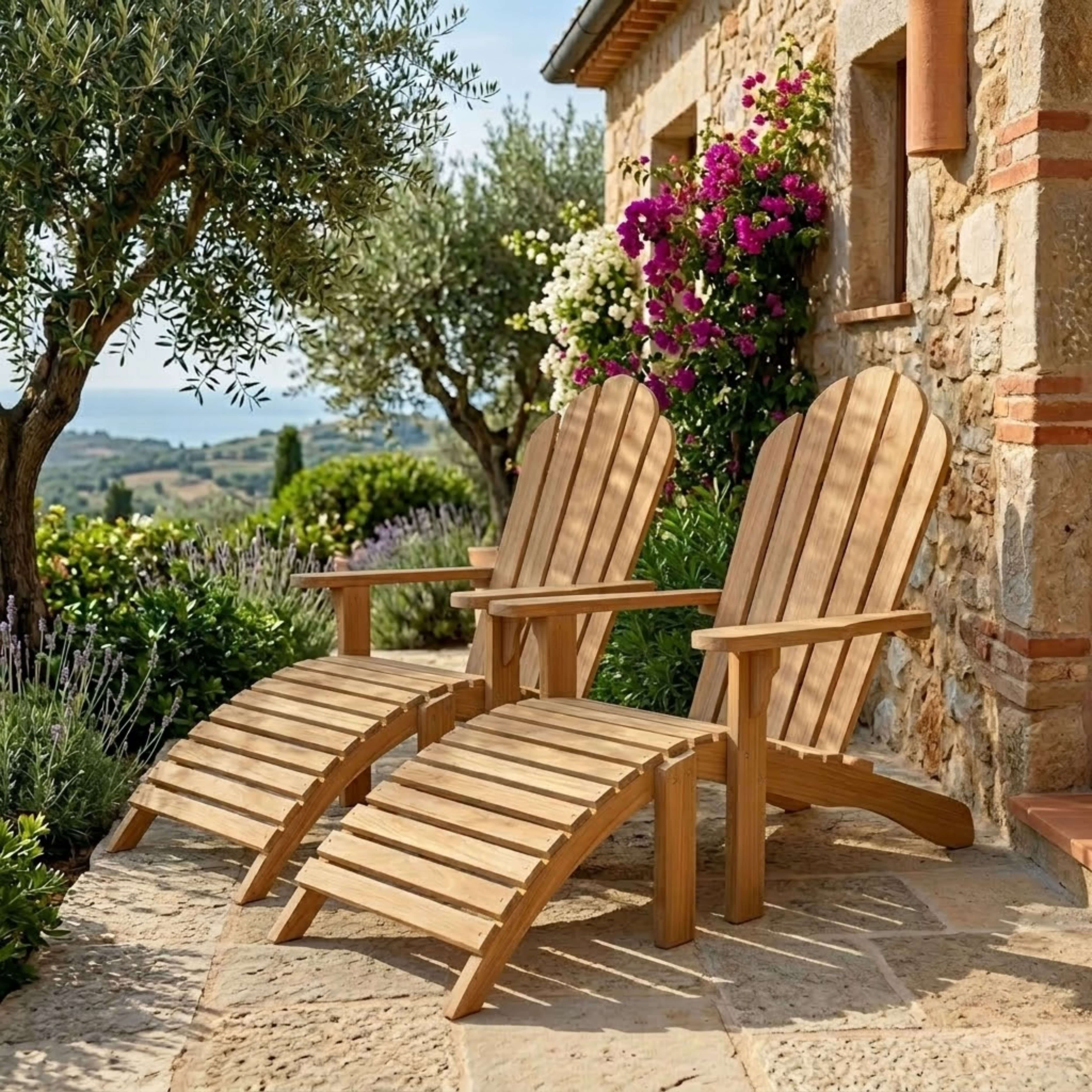Recline in comfort as you rest your weary legs and arms with the Adirondack and Ottoman from Anderson Teak. Perfect for the porch, patio or yard, this Adirondack with Ottoman features a deep curved seat, low flat arms, and a perfectly matched ottoman that makes this the most comfortable and finest teak Adirondack anywhere. Don’t compare Teak wood with redwood, pressed wood, mahogany or even cedar! Teak means highest durability, maximum beauty and maintenance free! More comfort, beauty, and durability. Over time, the wood will weather to a beautiful silver gray patina, or occasionally scrub down with soap and water to keep in pristine condition. Made from Genuine Grade-A Teak, it is sanded smooth without any finish in its natural form and color.