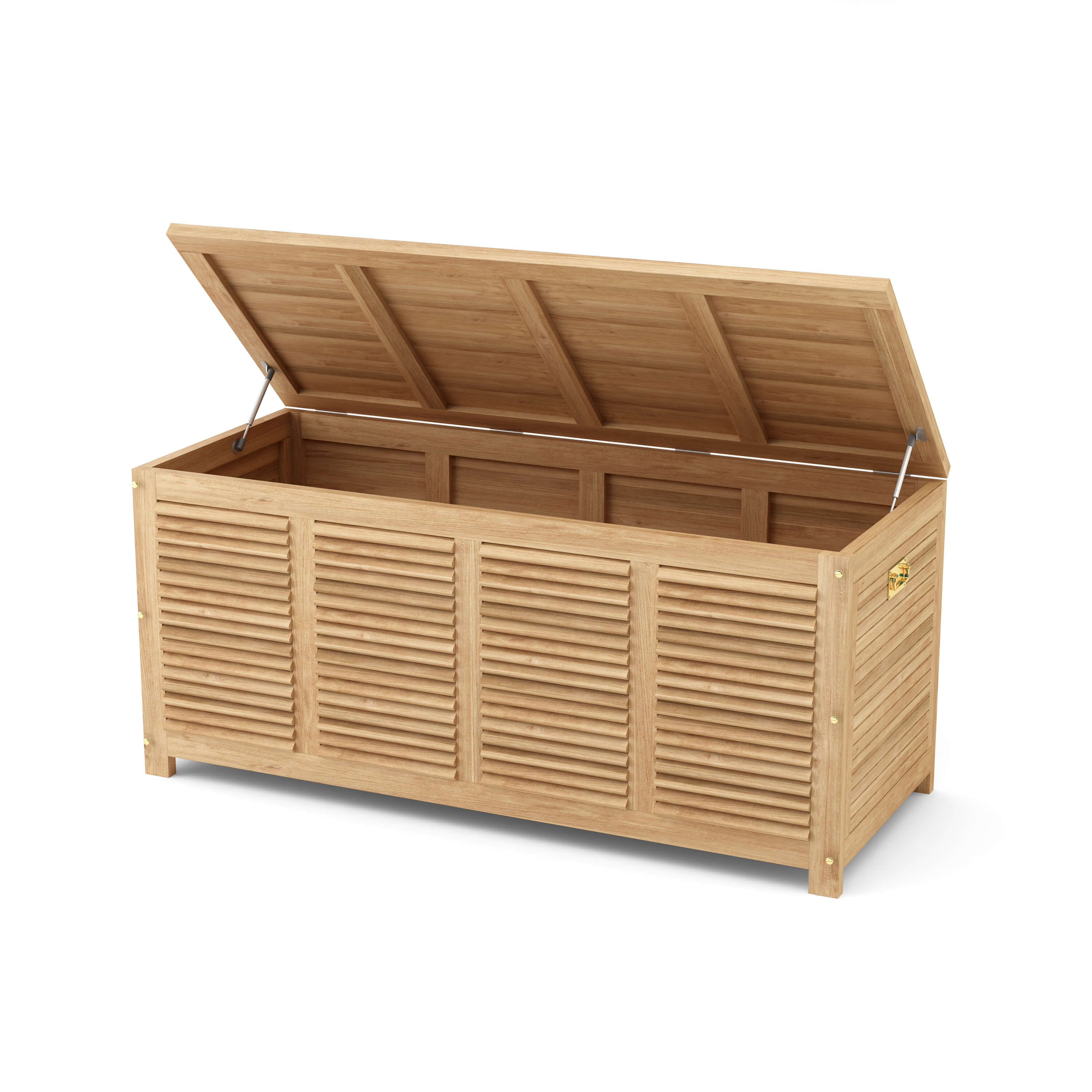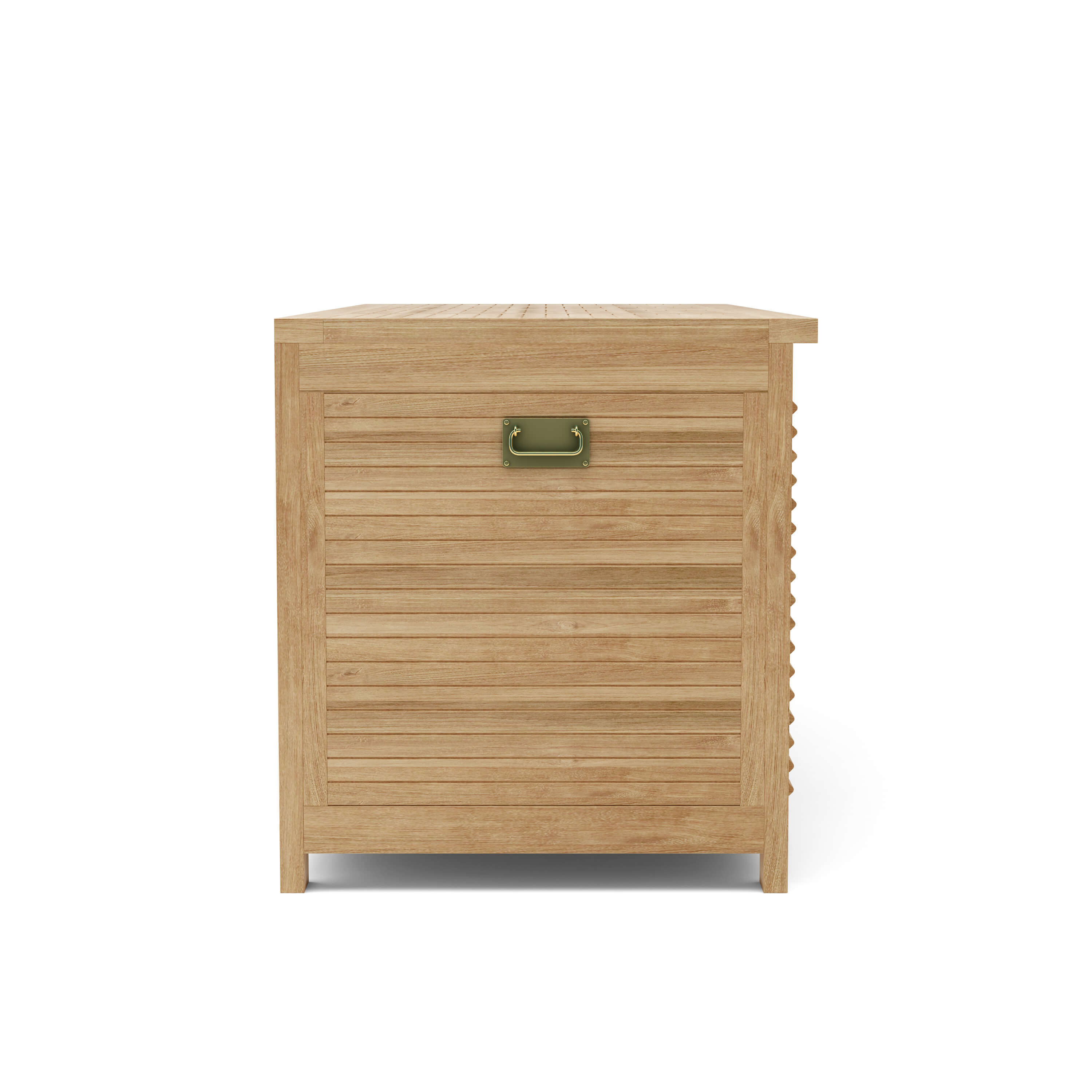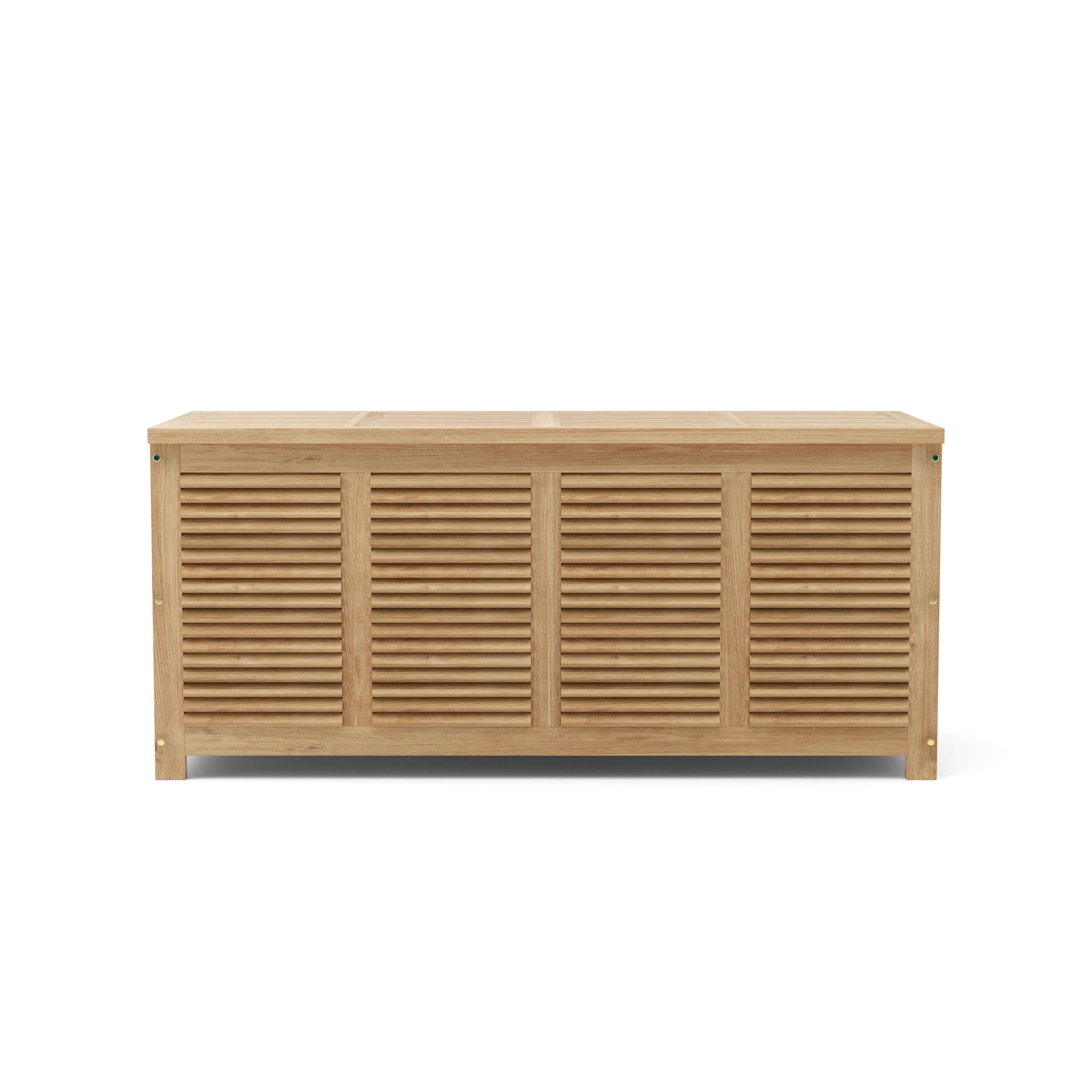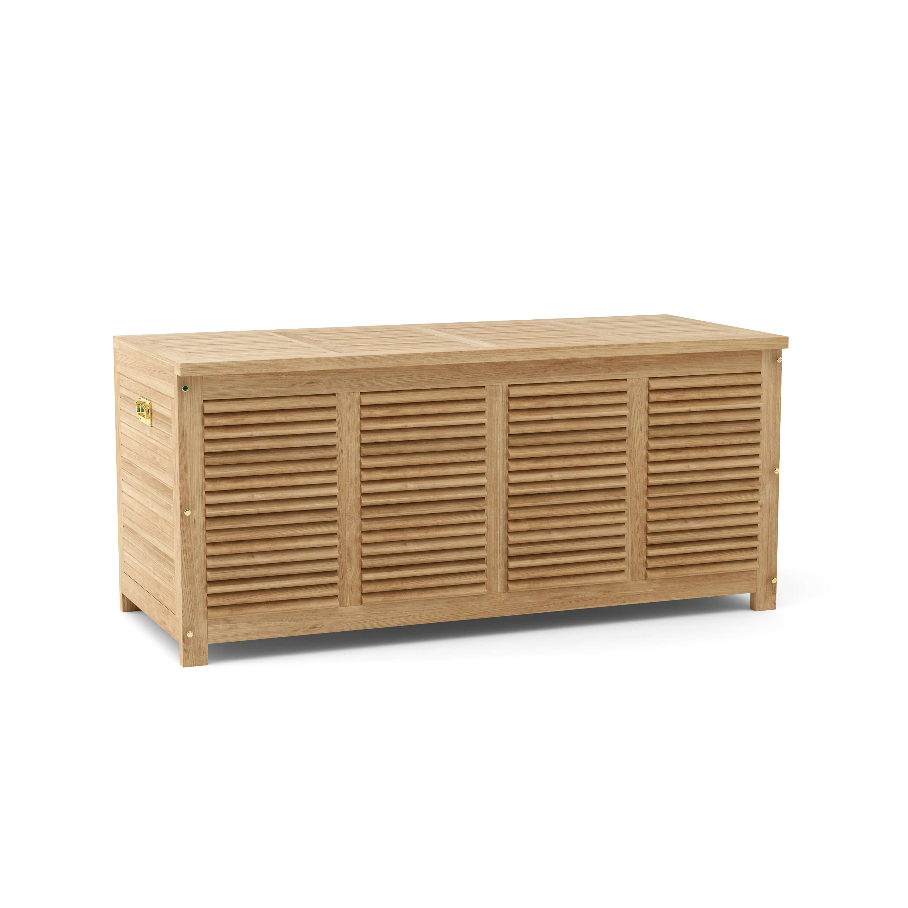 This solid teak Amberly Storage Box is a stylish way to store things on your backyard, deck, and pool area. It is the perfect teak furniture accessory to place your outdoor furniture cushions, sport equipment, or pool equipment. Featuring built in ventilated sides to keep your belongings free of mold and mildew, the Amberly storage box can be used to compliment any room in your home for additional storage such as a children toy box, towels, and is sturdy enough to be used for temporary seating. Made from All Premium Unfinished Teak wood, it is designed to withstand the weathering sun, rain or hail of the outdoors. Hardware includes Solid brass fixtures, sized 62”W 26”D 28”H.
