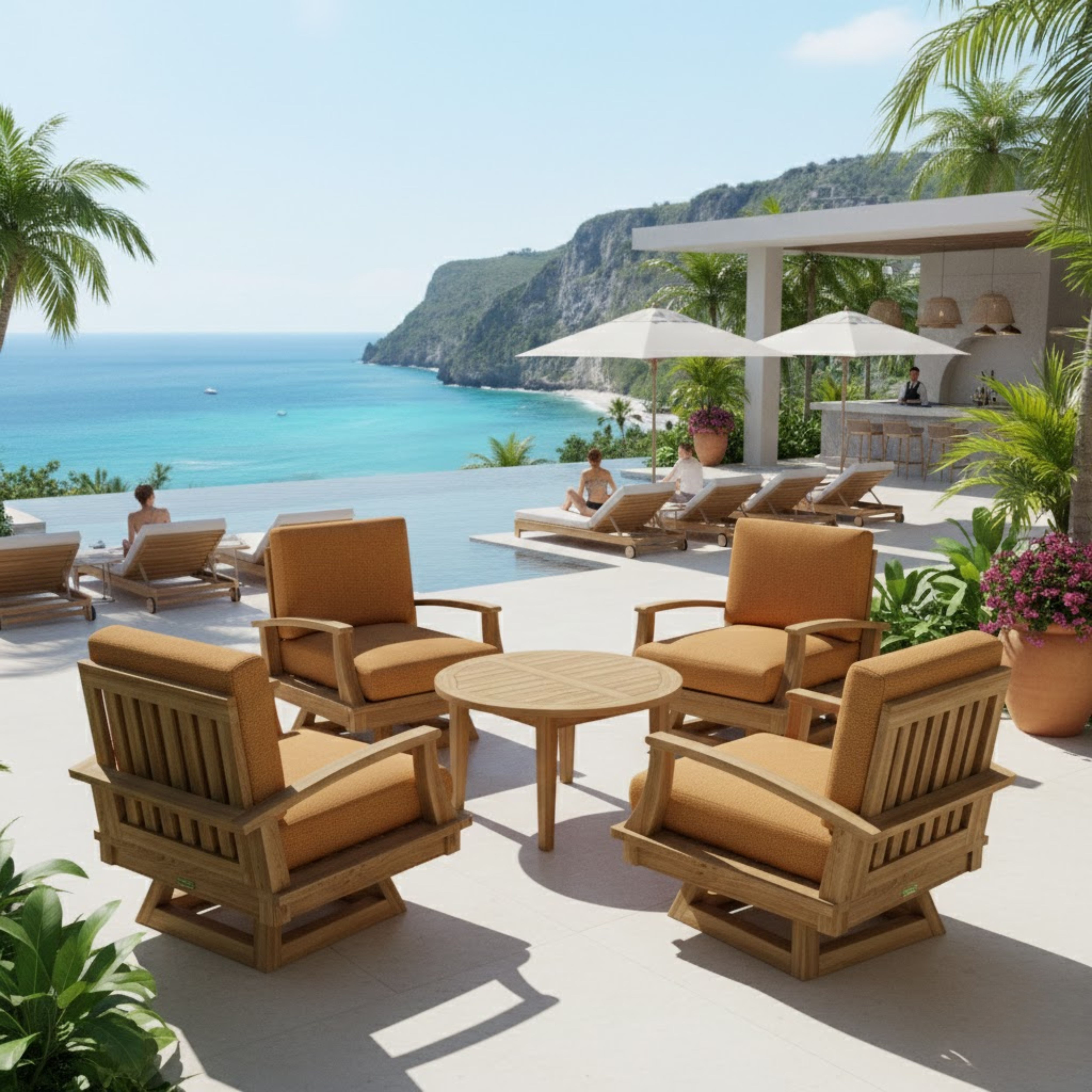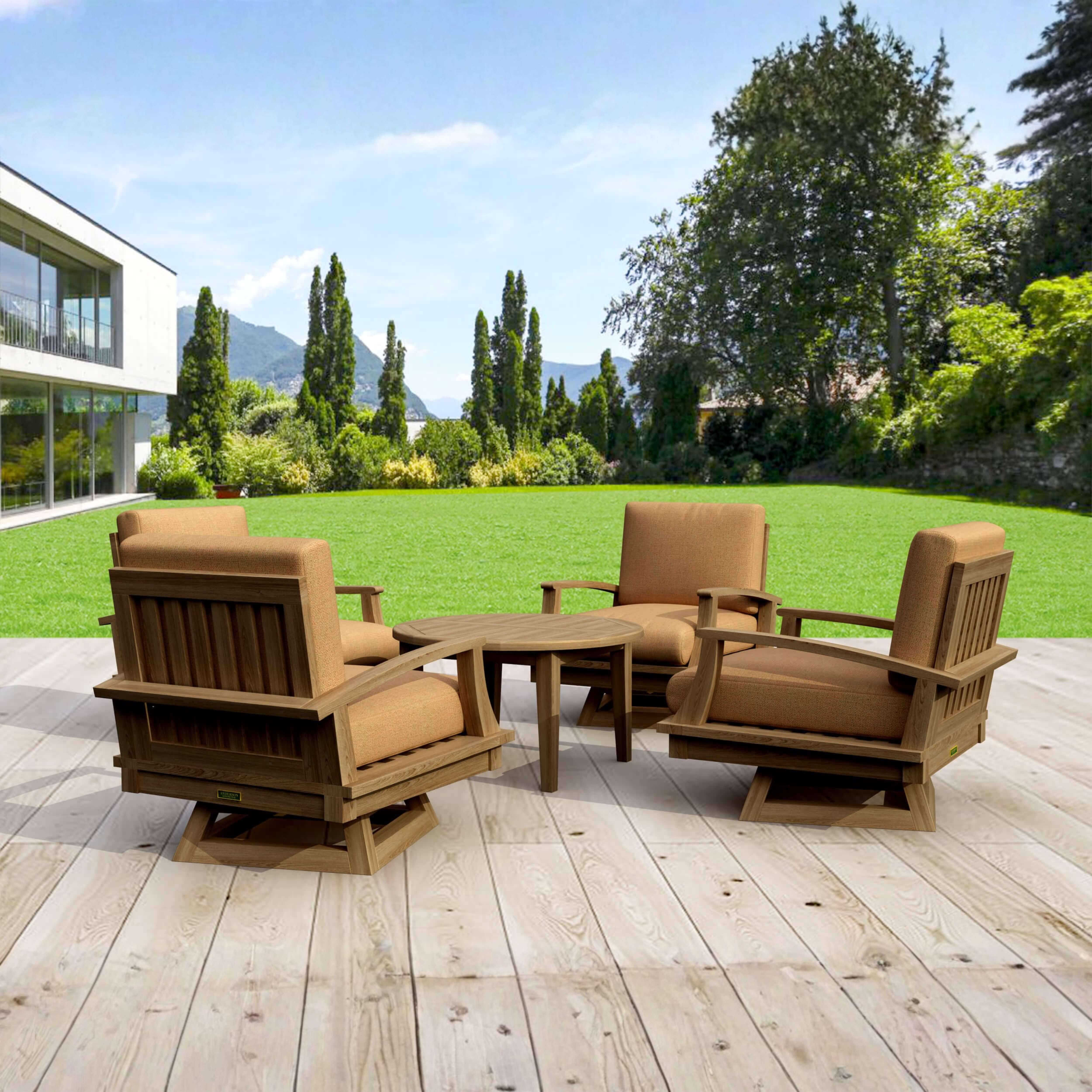 The Brianna Deep Seating collection design is inspired by the modern, luxury, comfort casual lifestyle that blends between the easy going and carefree style. The Brianna deep seating swivel armchair is big and deep enough to make you feel overwhelmed when you sit on it. With swivel deep seating armchair you will be delighted to have a relax conversation, have a snack while sitting in a soft chair in the evening. Furnish the 35” round table for magazines, drinks, snacks or even lay your legs on it. The table and swivel chairs are all constructed using mortise and tenon construction for strength and durability. The collection made of premium quality plantation grown teak. The cushion is made of all-weather water repellent fabric from Sunbrella with the color choice of yours to match with backyard environment. Deep seating come with cushions for your comfort. Quality built for generations.