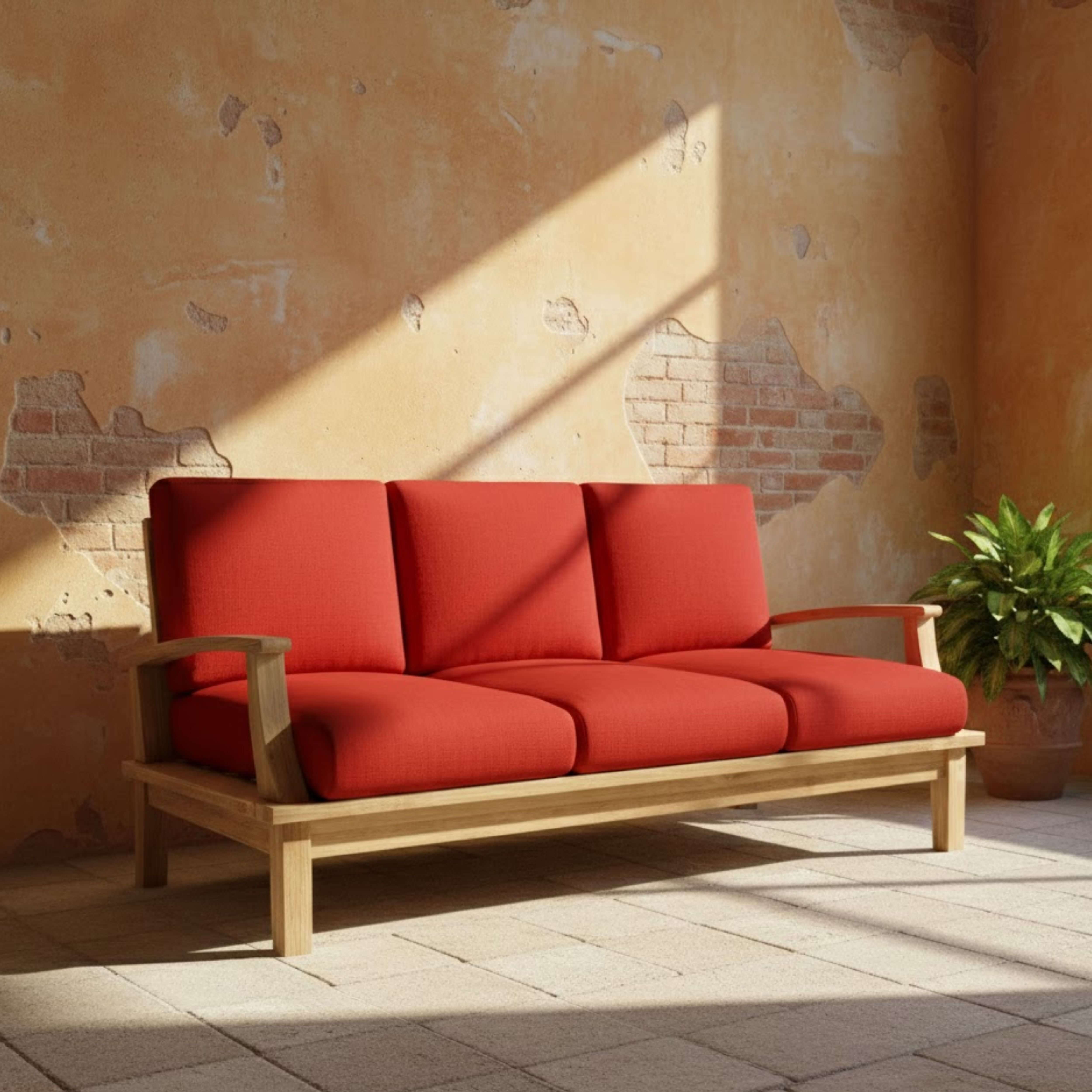 The Brianna Deep Seating Sofa with seating for three is the perfect addition for your teak patio furniture. With its comfortable teak design and thick wooden frame, you can be sure to entertain guests, family, and friends over a good chat. Add other items such as ottomans, coffee tables, or mix and match with other pieces of the Brianna Deep Seating Collection to create your ideal set. includes Sunbrella All-Weather cushions 27″ deep and 6″ thick saturated with UV stable pigments that resists color fade, water, mold and mildew. Fabric pattern and color options available. Made with kiln-dried Premium Teak wood, the chair is sanded smooth without finish in its natural form and color.