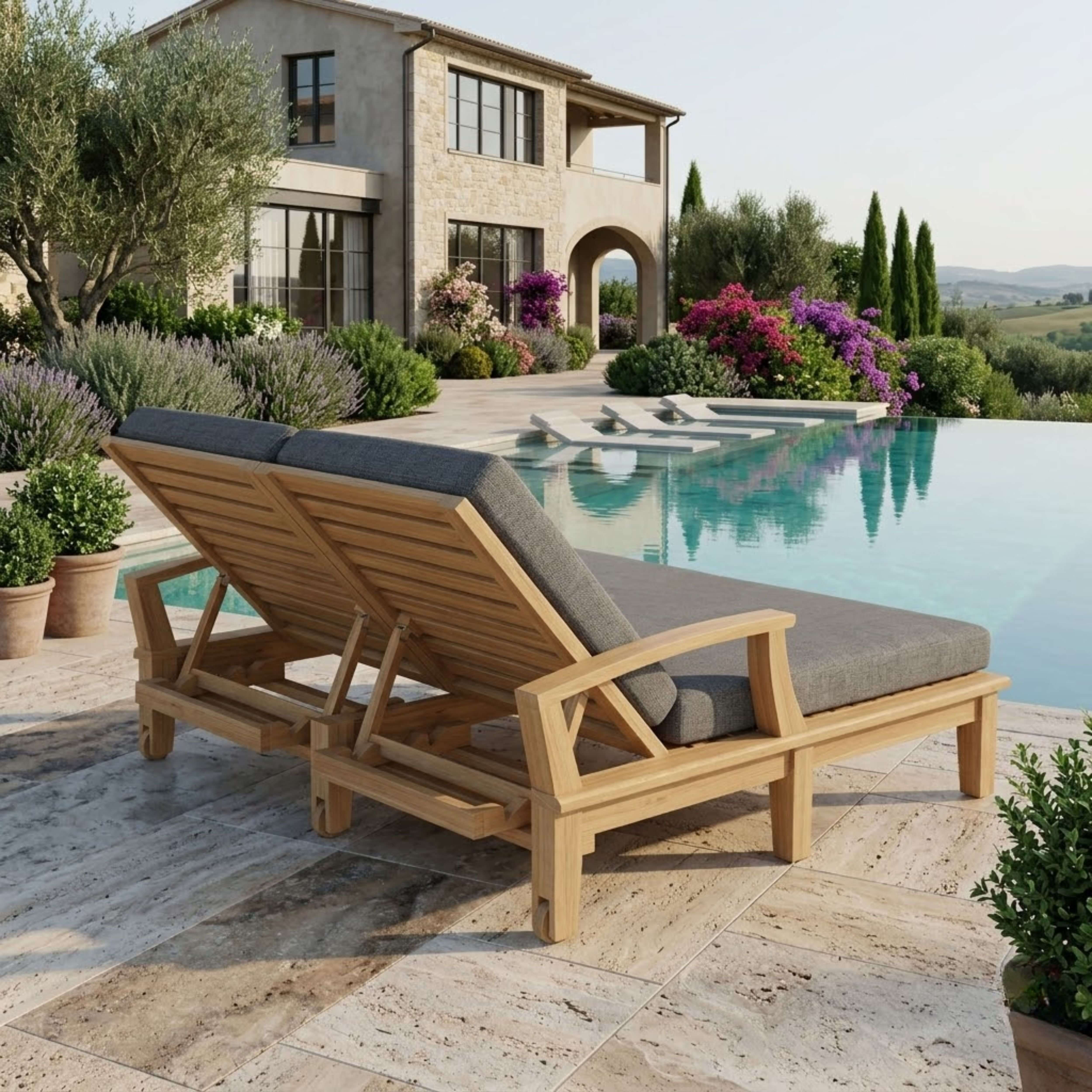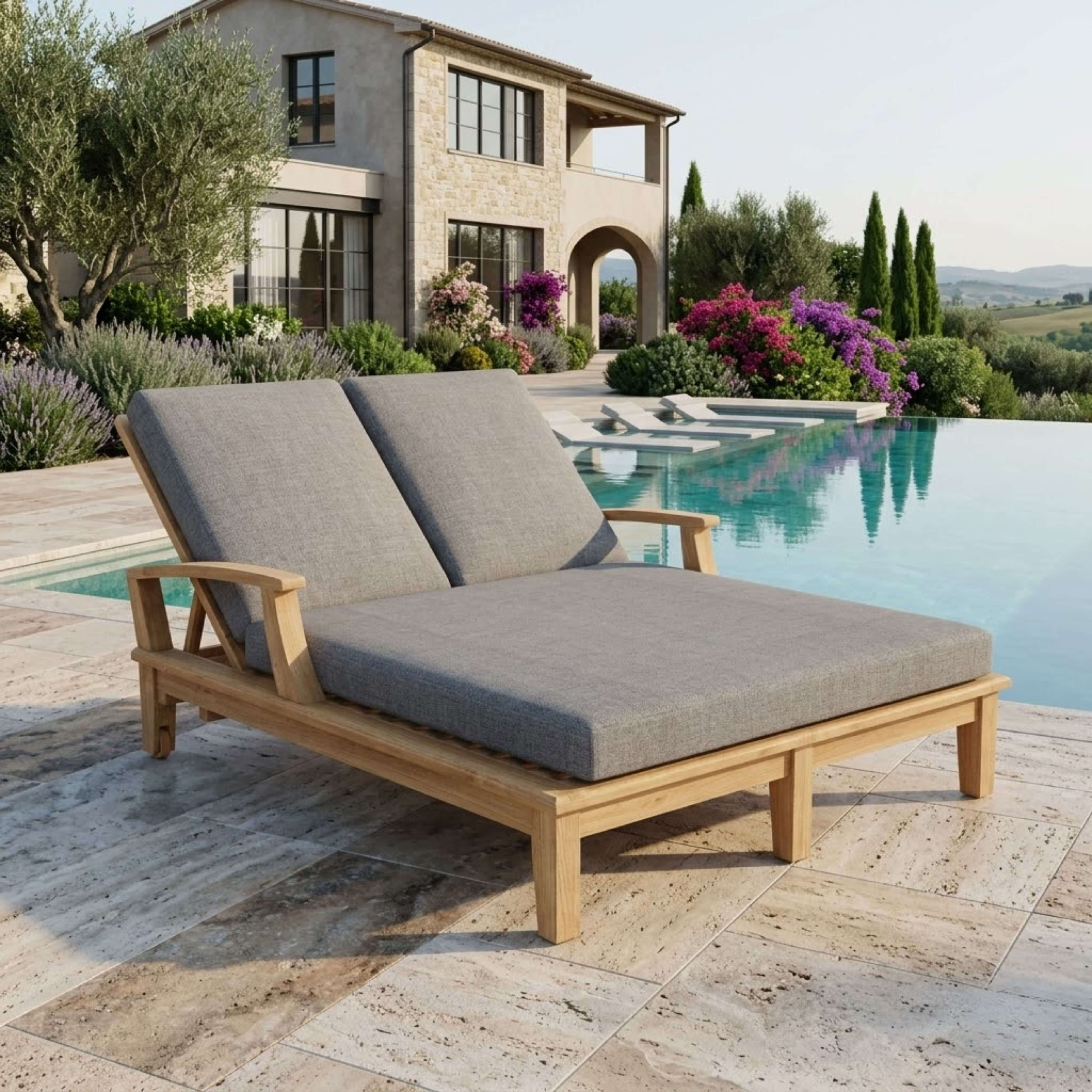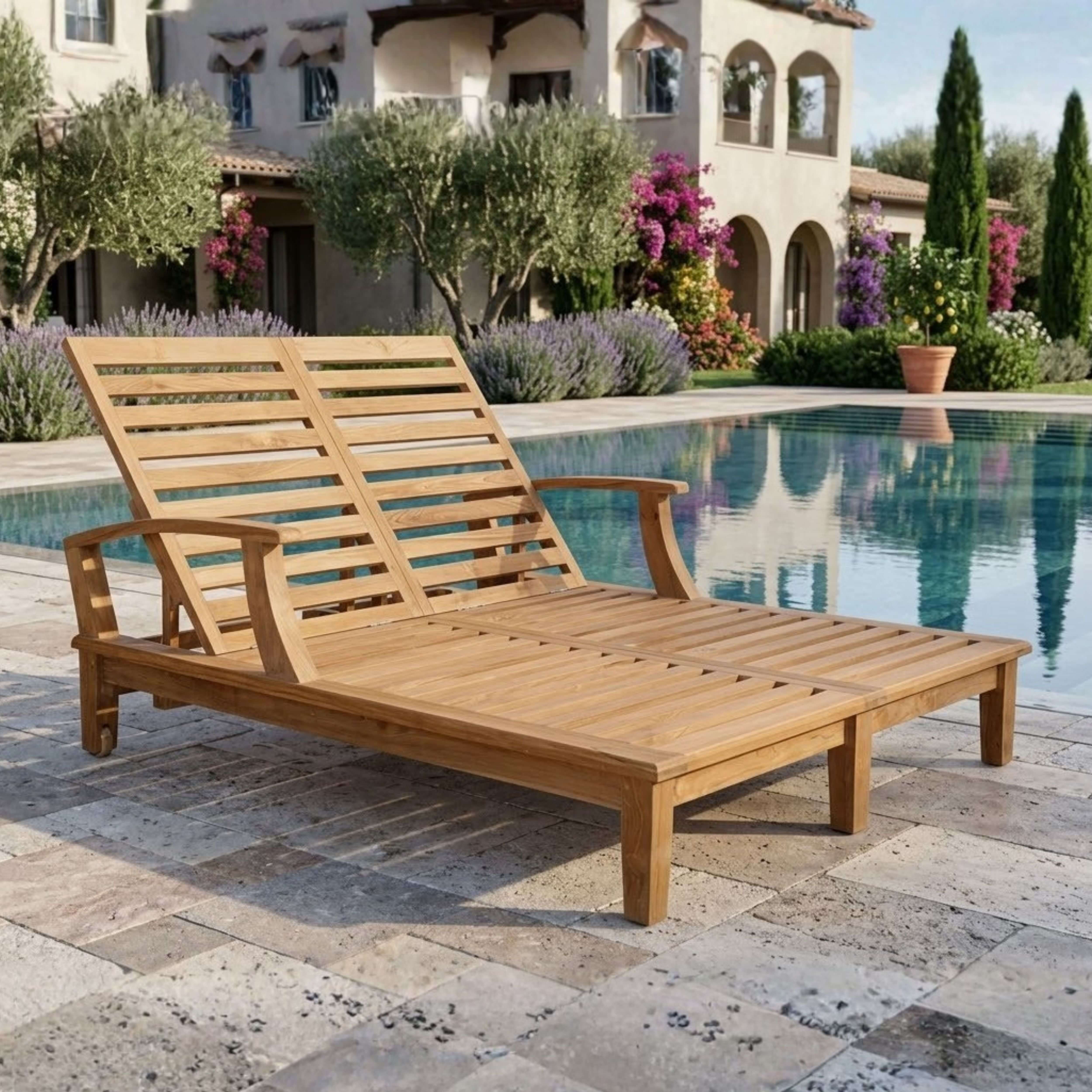 A spacious and bulky Sun Lounger for the pool and patio, the Brianna Double Sun Lounger is the perfect lounger under the sun for two. Perfect for poolside reading in the sun, this Lounger adjusts up to four individual positions, including completely flat. For added lounging comfort add cushions from Sunbrella All-Weather Cushions; saturated with UV stable pigments that resist color fade, water, mold and mildew. With its solid teak wheels, it can be easily moved for storage in and out of the sun. Made from genuine teak wood sanded smooth to the touch, it is the perfect material for weathering the outdoors through rain, hail, or shine