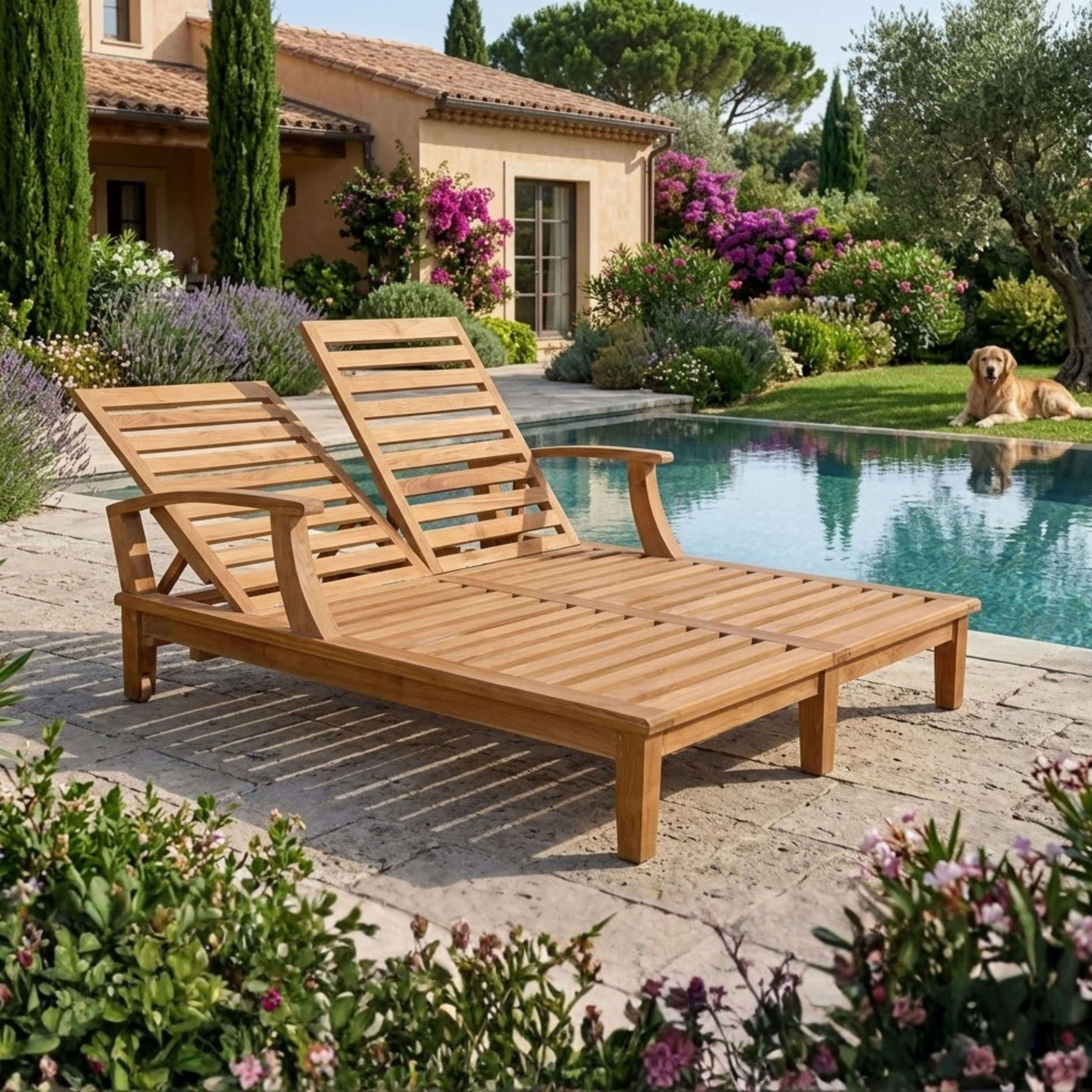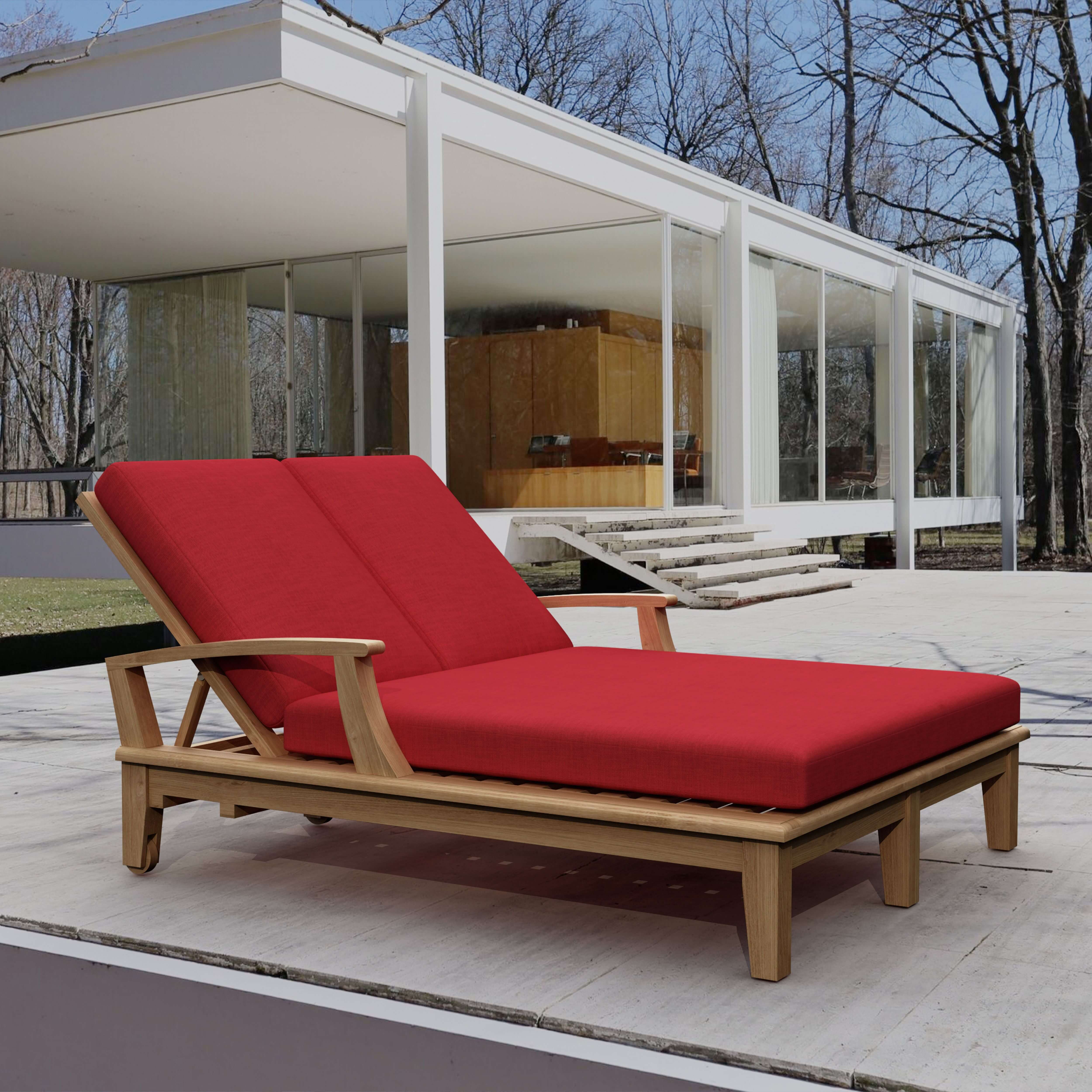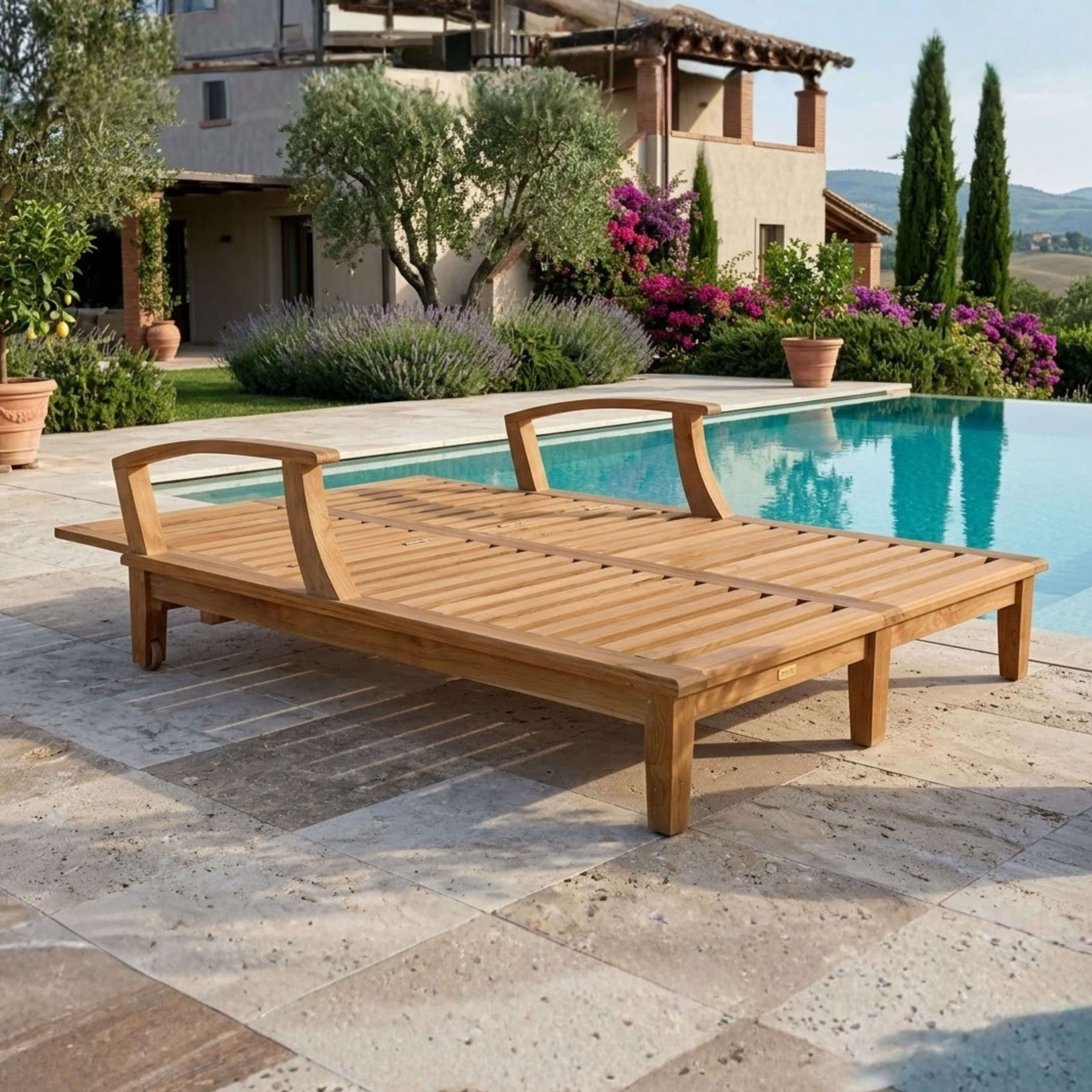 A spacious and bulky Sun Lounger for the pool and patio, the Brianna Double Sun Lounger is the perfect lounger under the sun for two. Perfect for poolside reading in the sun, this Lounger adjusts up to four individual positions, including completely flat. For added lounging comfort add cushions from Sunbrella All-Weather Cushions; saturated with UV stable pigments that resist color fade, water, mold and mildew. With its solid teak wheels, it can be easily moved for storage in and out of the sun. Made from genuine teak wood sanded smooth to the touch, it is the perfect material for weathering the outdoors through rain, hail, or shine