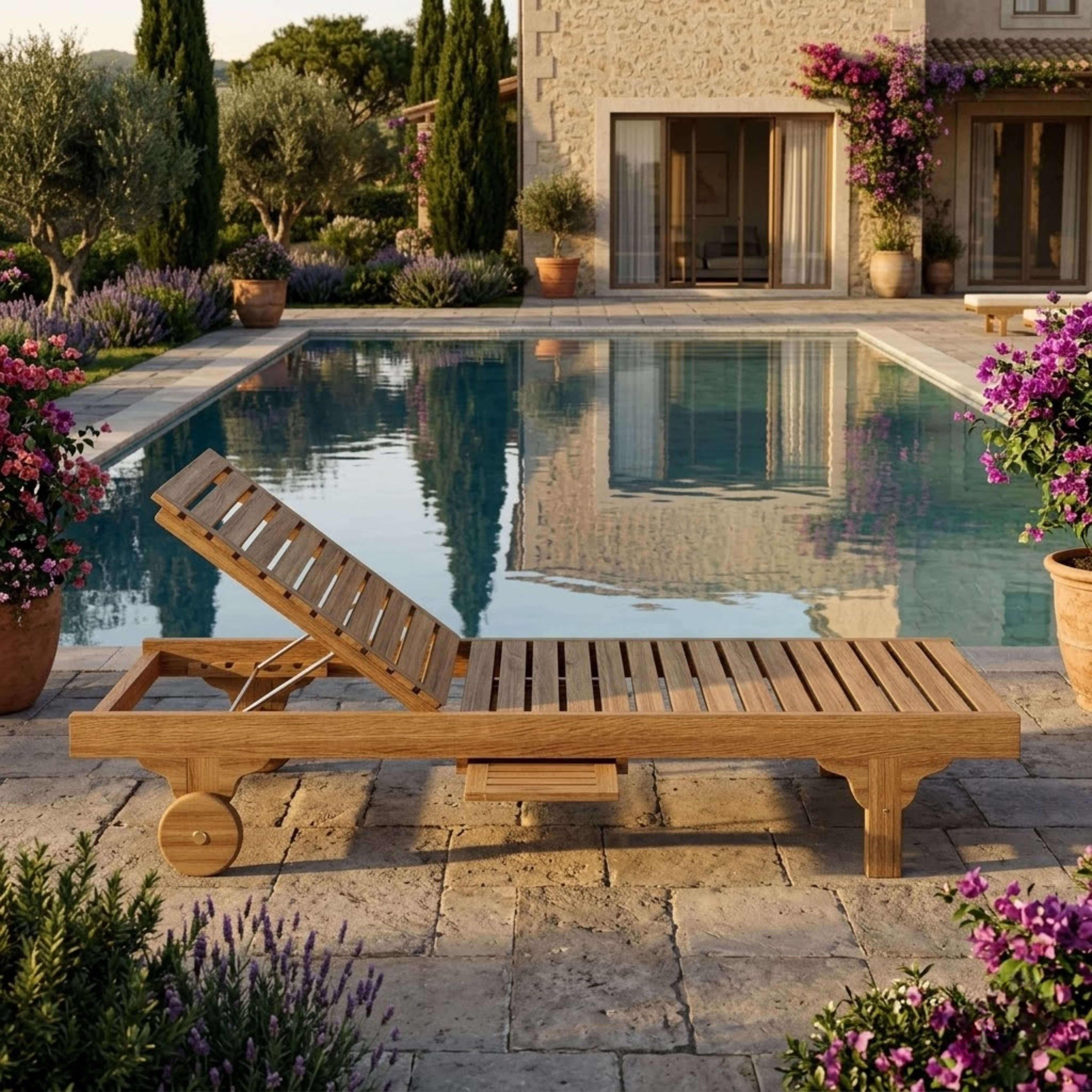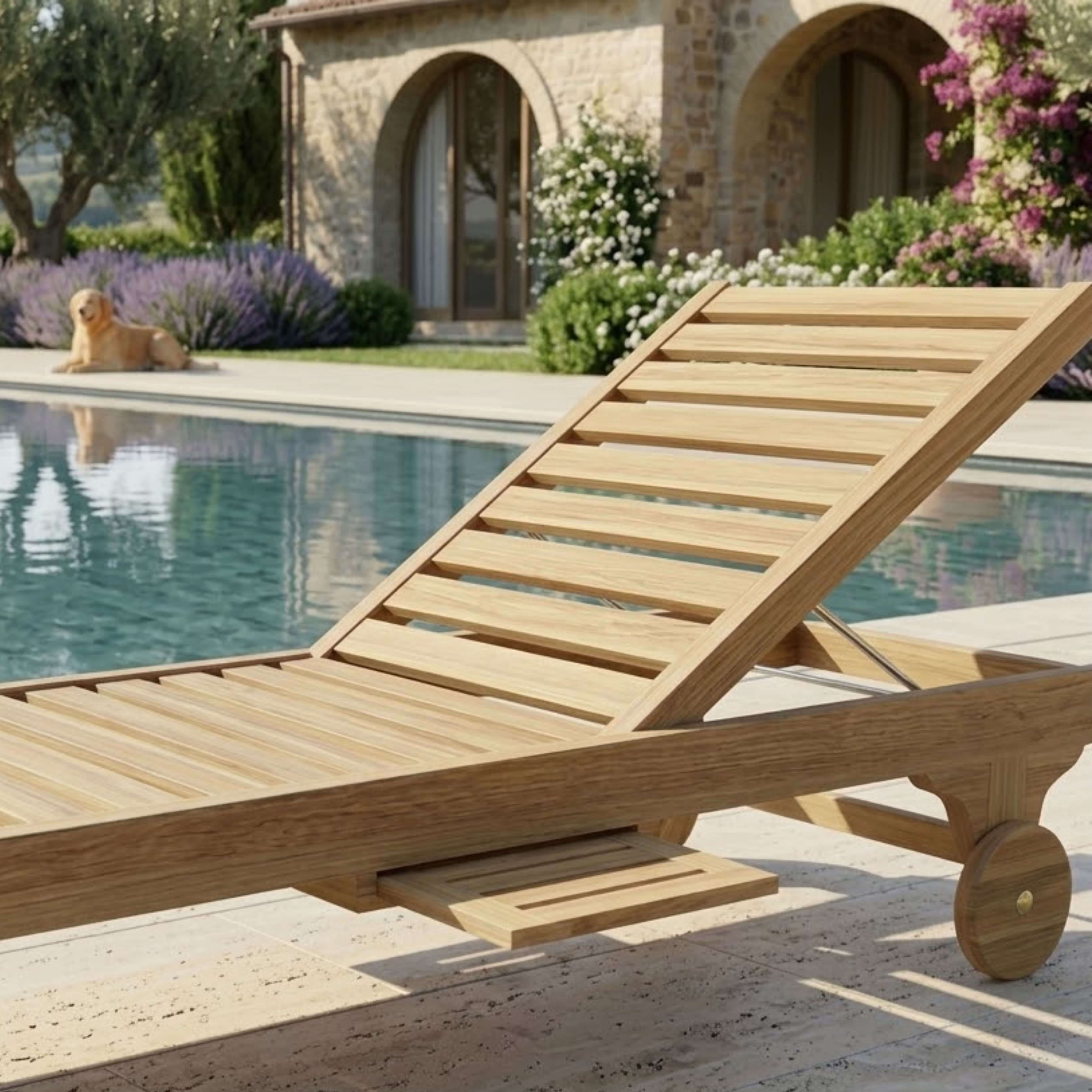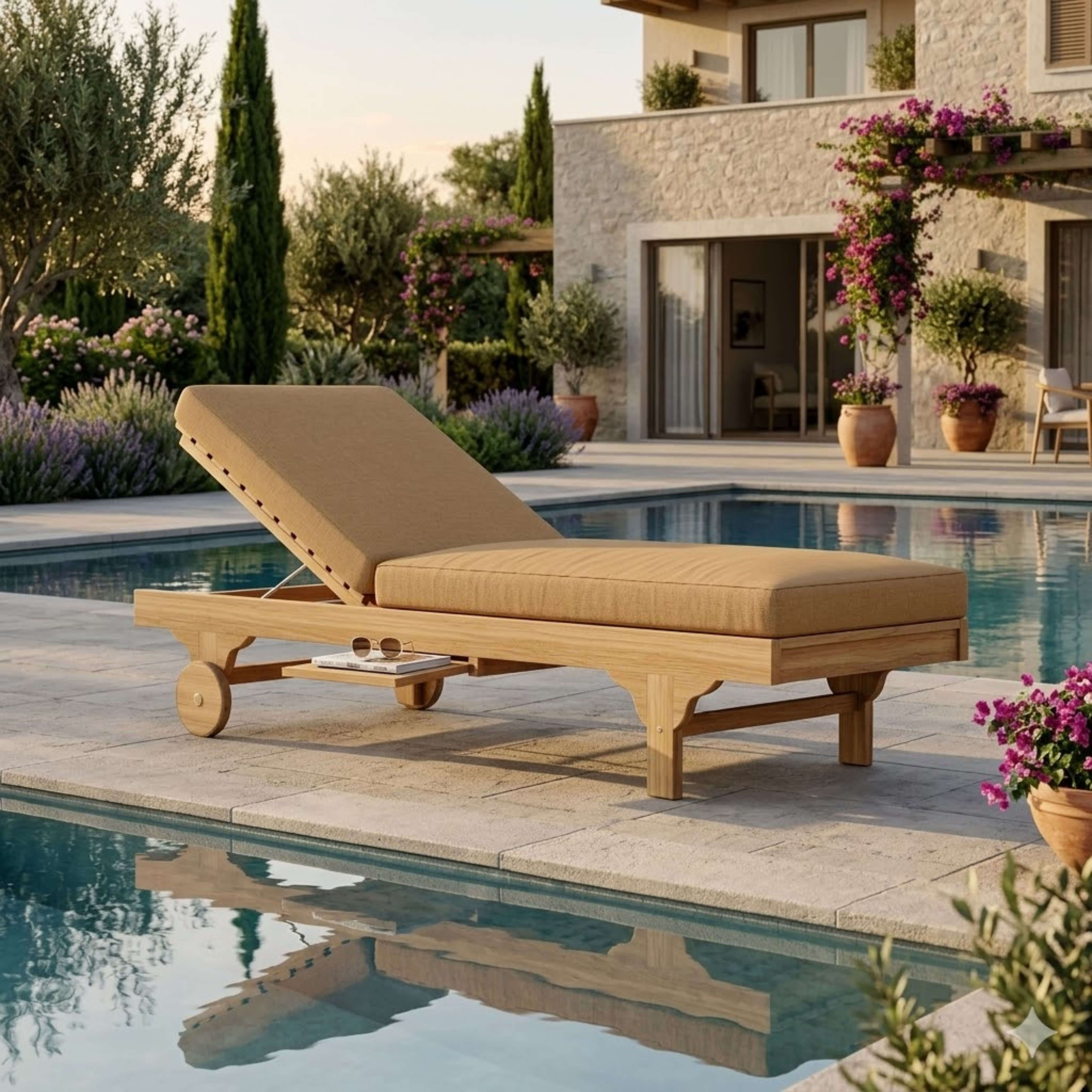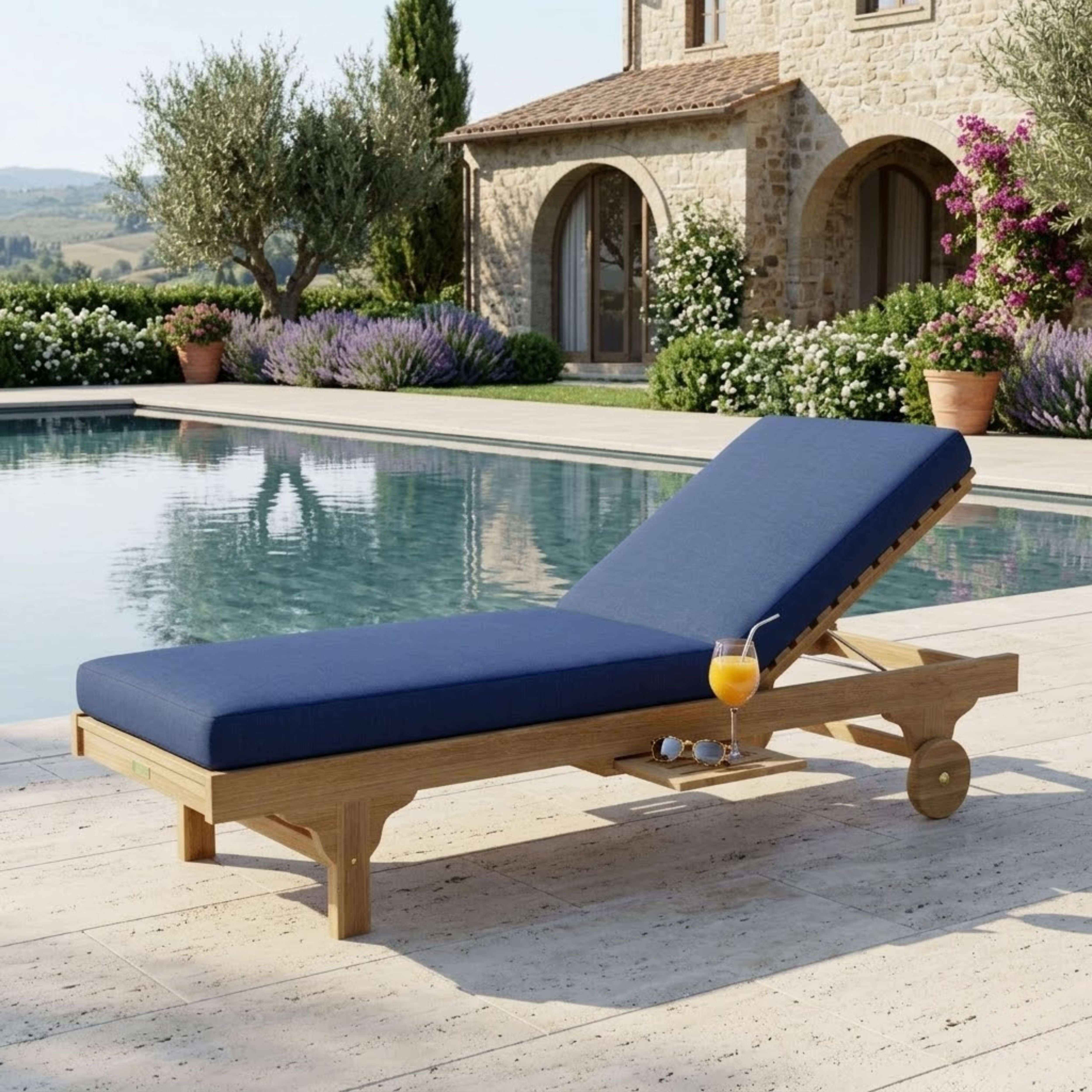 The Capri Classic Sun Lounger with Adjustable Back & Side Tray is the perfect sun lounger for your pool and patio. Our most popular piece, the Sun Lounger has been called by some “The most comfortable Sun Lounger they have ever relaxed in.” Perfect for poolside reading in the sun, the lounger features a convenient drawer that slides out, and when not in use they conveniently slide back into the Lounger. The Capri Lounger adjusts to four different seating positions, including completely flat. For added lounging comfort add cushions with Sunbrella All-Weather Cushions; saturated with UV stable pigments that resist color fade, water, mold and mildew perfect for the outdoors. With its solid teak wheels, it can be easily moved for storage in and out of the sun.