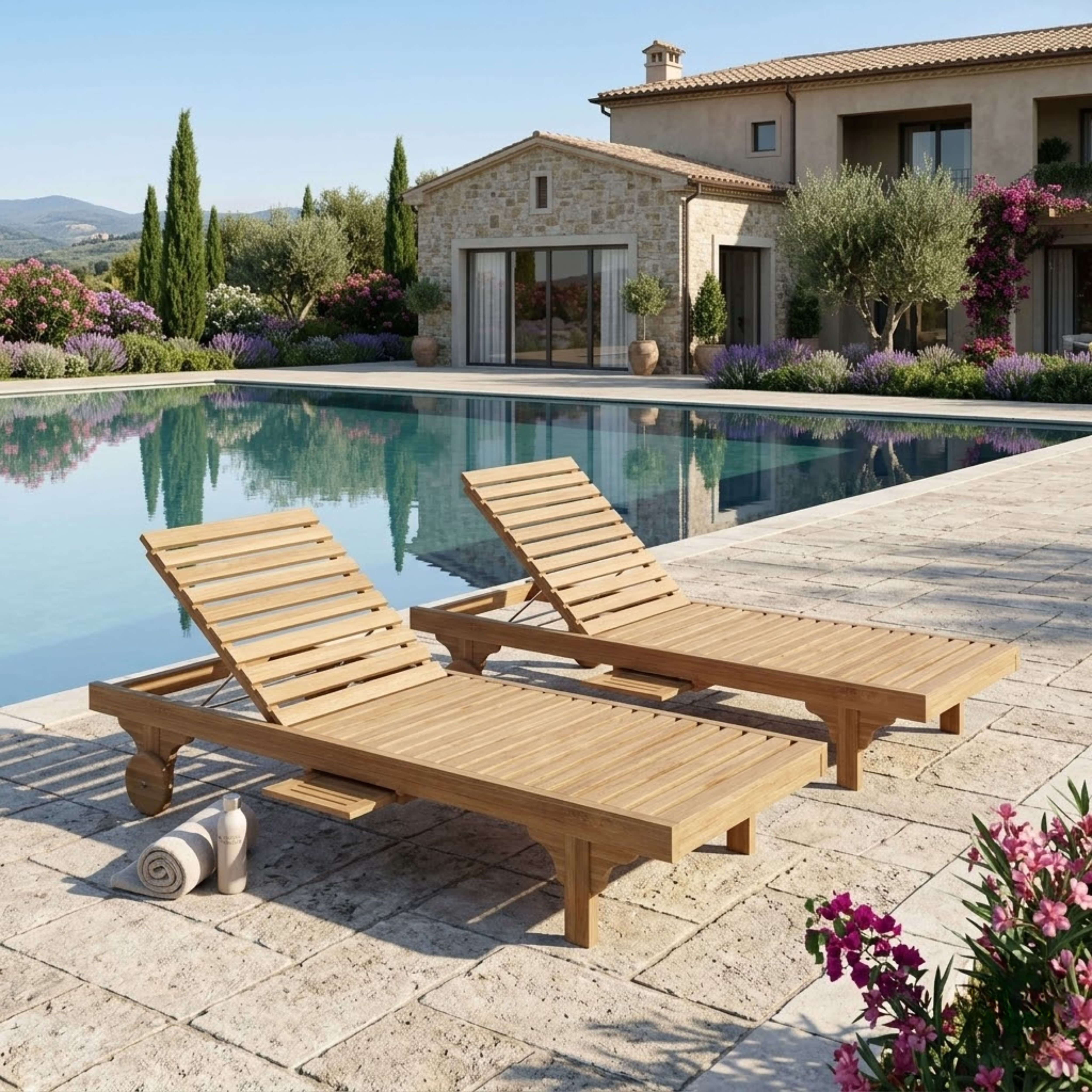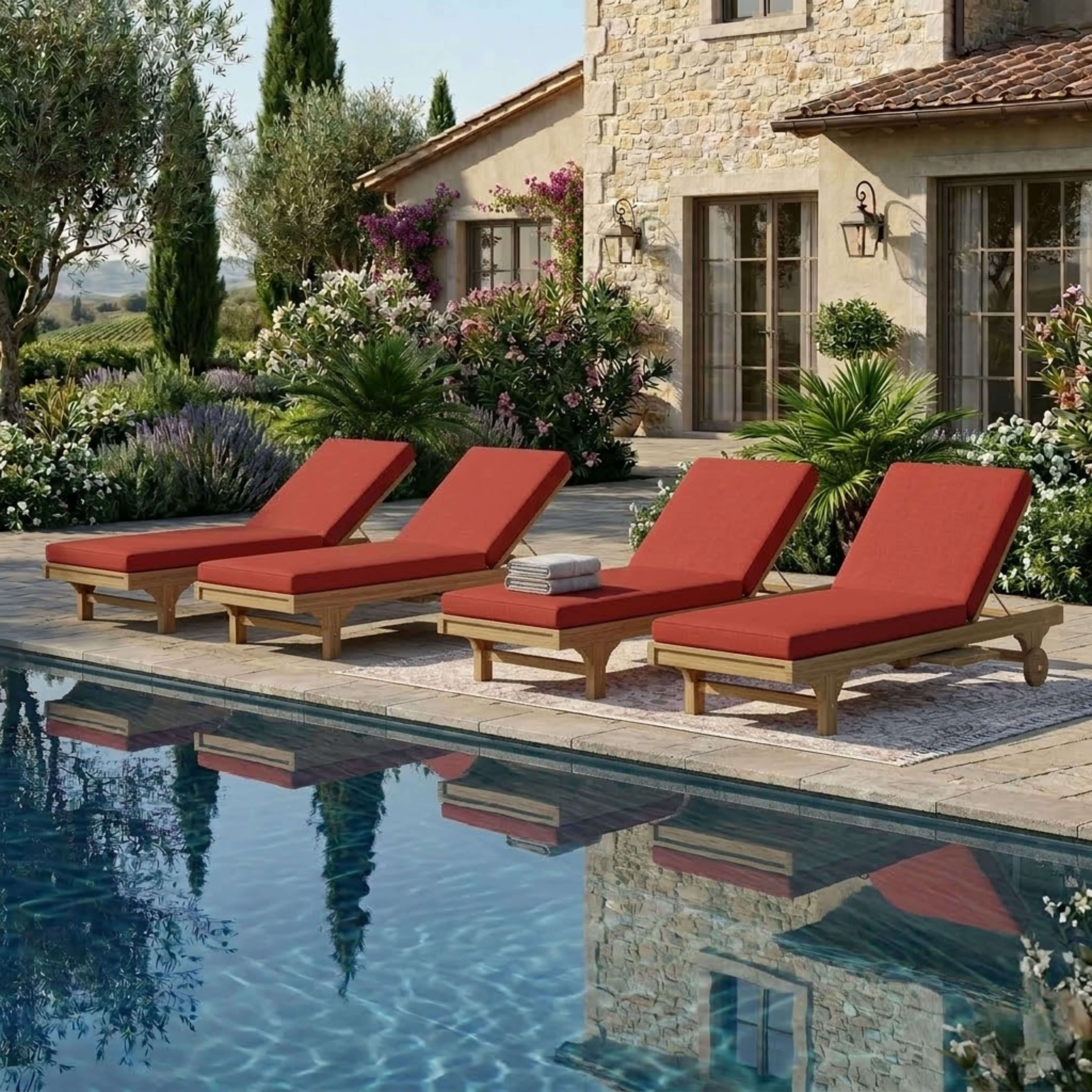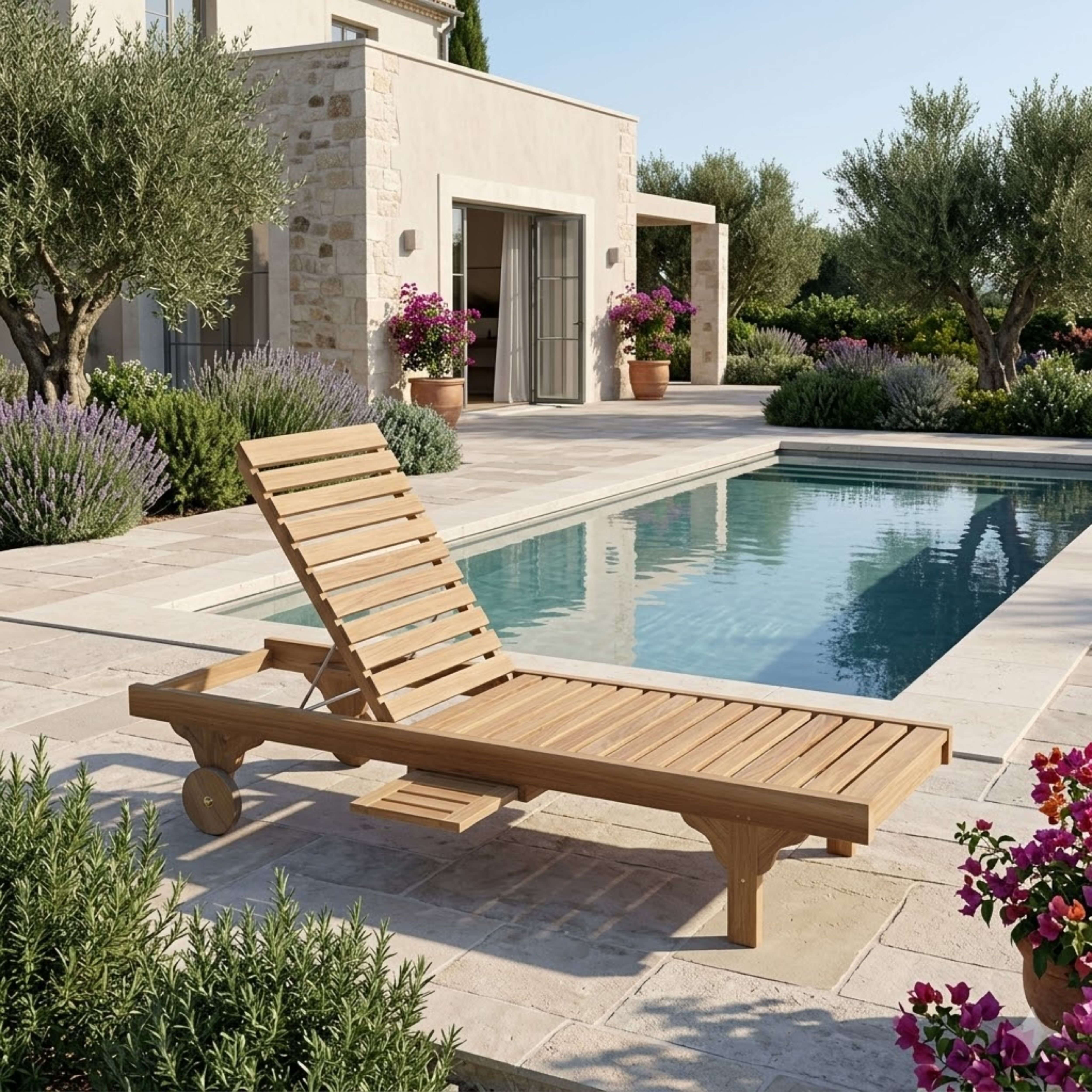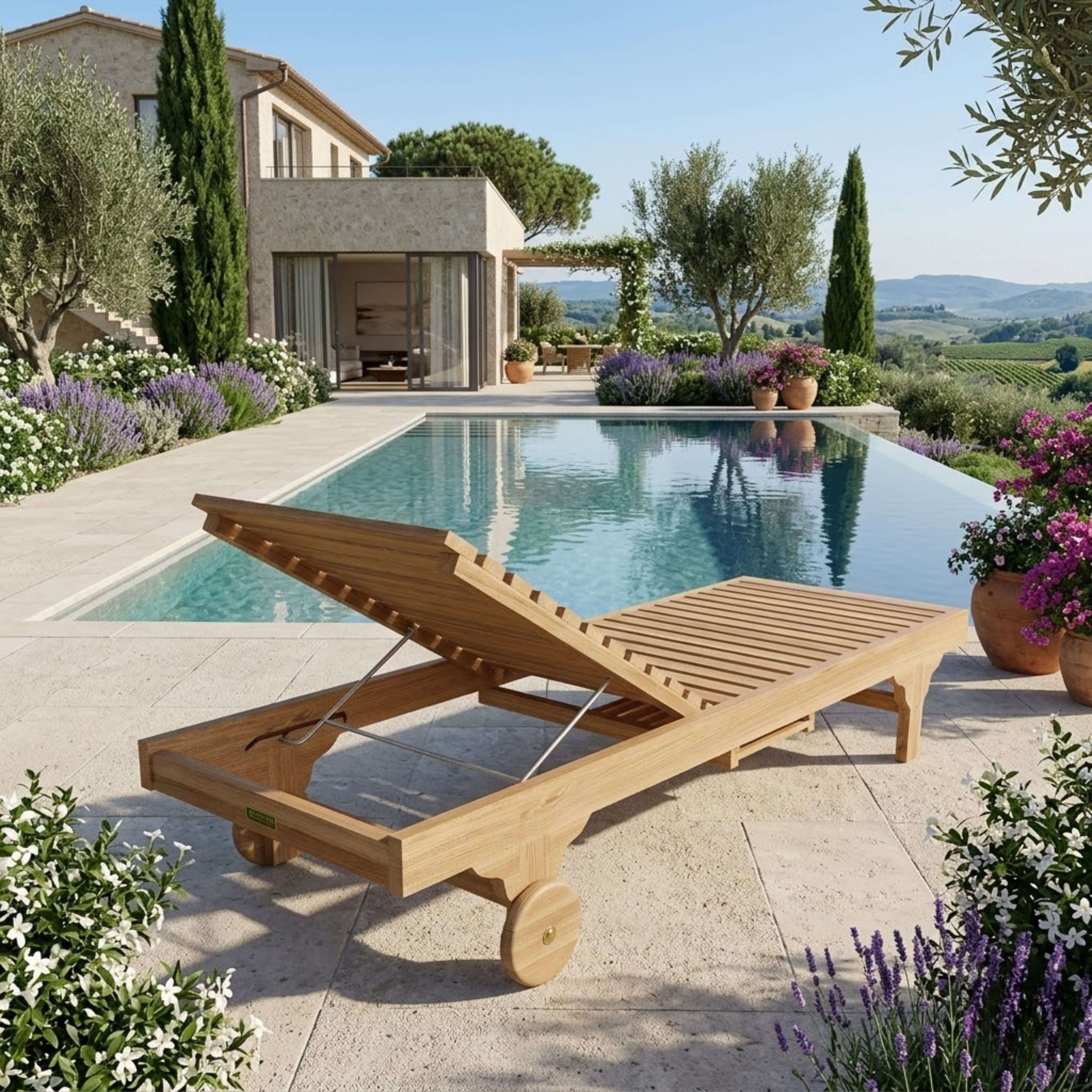 The Capri Classic Sun Lounger with Adjustable Back & Side Tray is the perfect sun lounger for your pool and patio. Our most popular piece, the Sun Lounger has been called by some “The most comfortable Sun Lounger they have ever relaxed in.” Perfect for poolside reading in the sun, the lounger features a convenient drawer that slides out, and when not in use they conveniently slide back into the Lounger. The Capri Lounger adjusts to four different seating positions, including completely flat. For added lounging comfort add cushions with Sunbrella All-Weather Cushions; saturated with UV stable pigments that resist color fade, water, mold and mildew perfect for the outdoors. With its solid teak wheels, it can be easily moved for storage in and out of the sun.