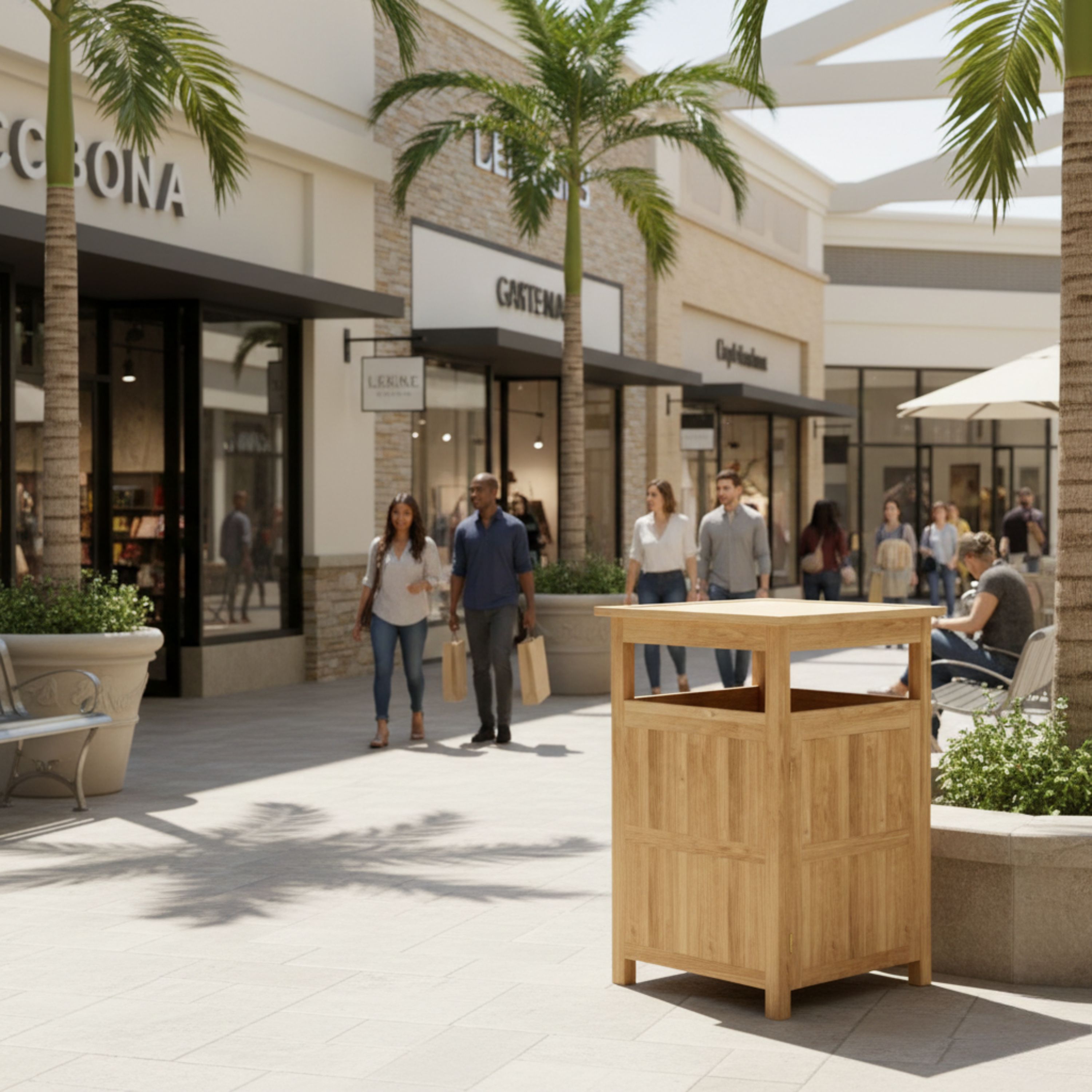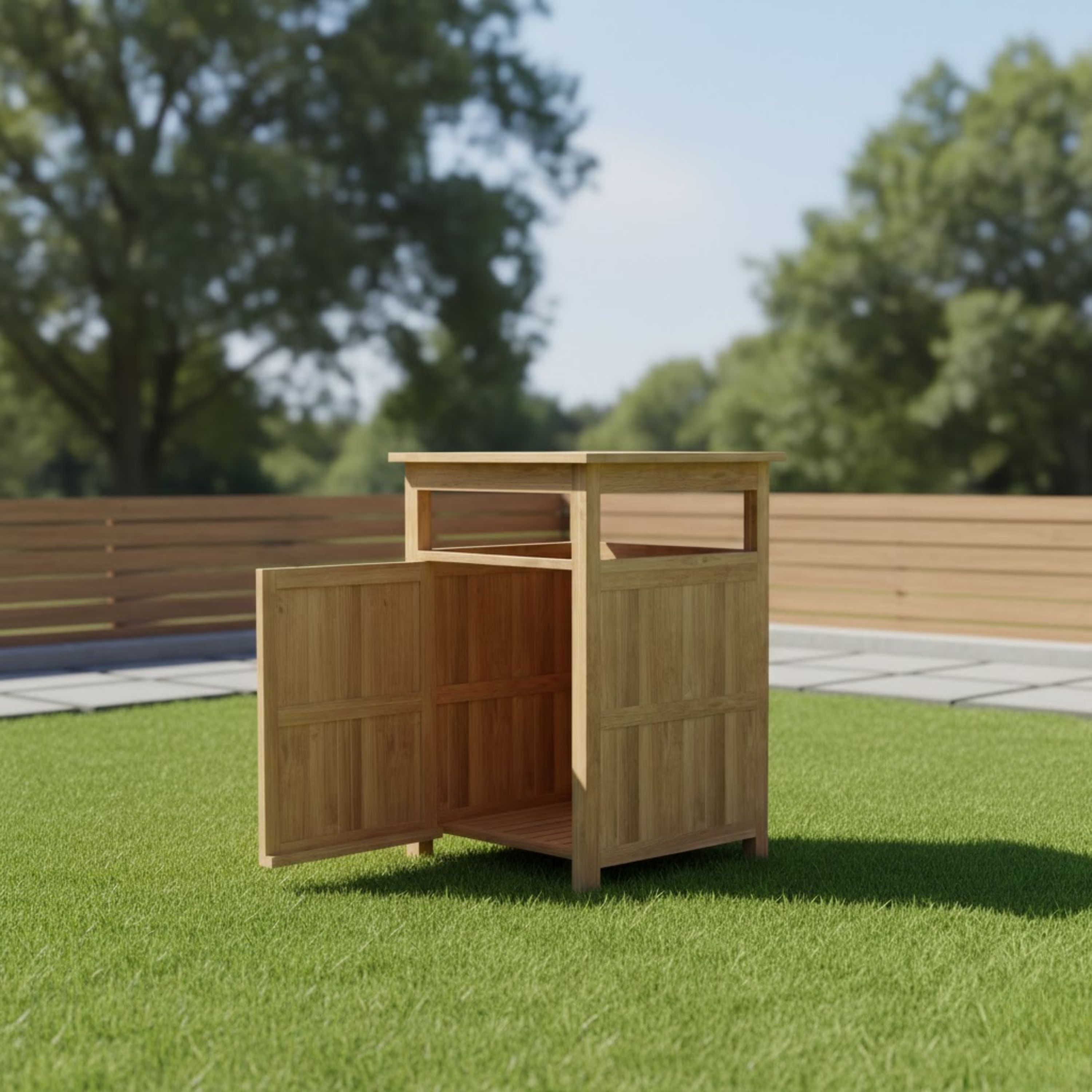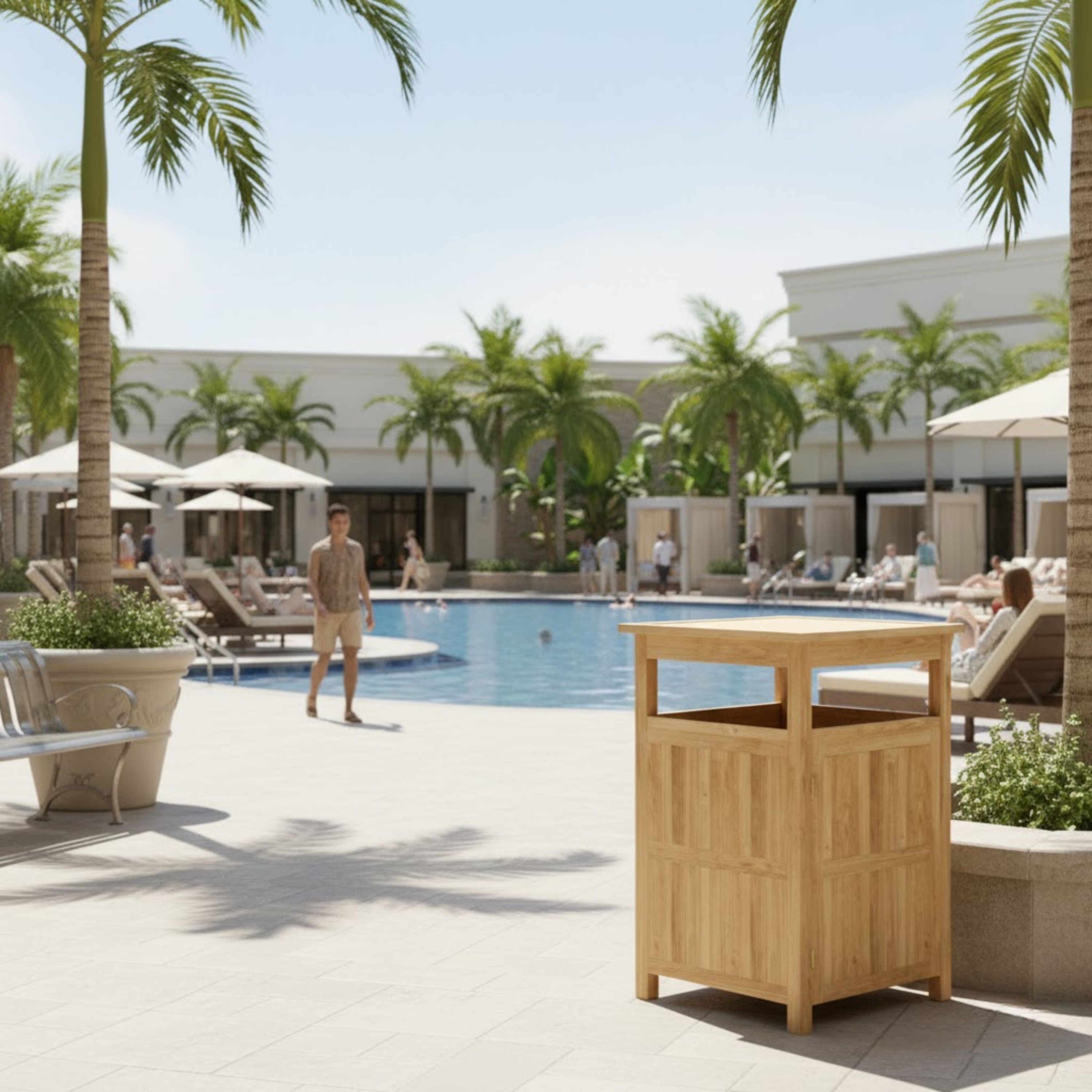 A large and sturdy trash bin made from natural unfinished teak perfect for prolonged outdoor exposure. Weathers to a patina grey when left untreated or use occasional scrub down with soap and water or teak oil to keep pristine condition. Features swinging door for easy trash removal with 4 sides of opening trash access. Product can be use as towel hamper trash box. Requires minimal assembly.