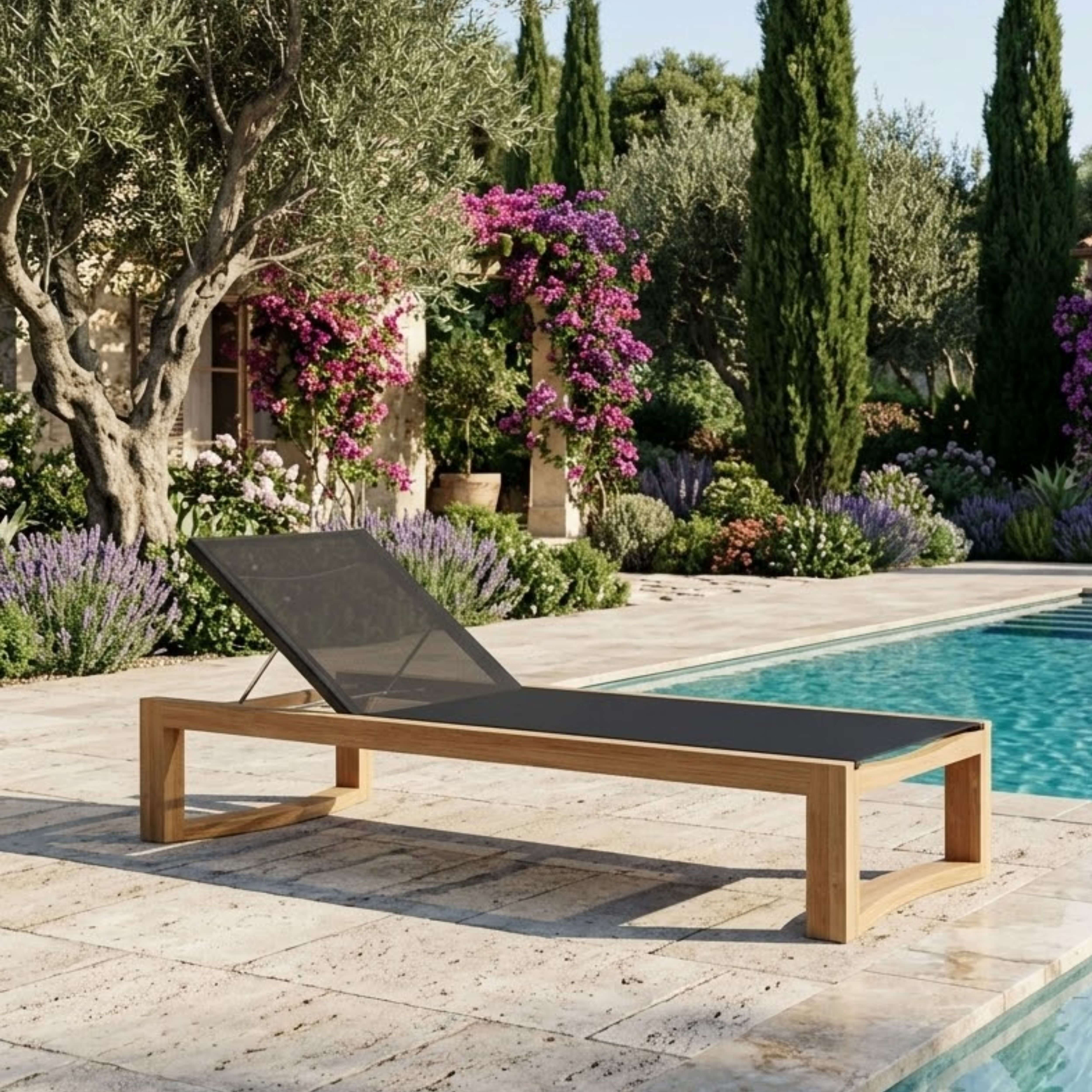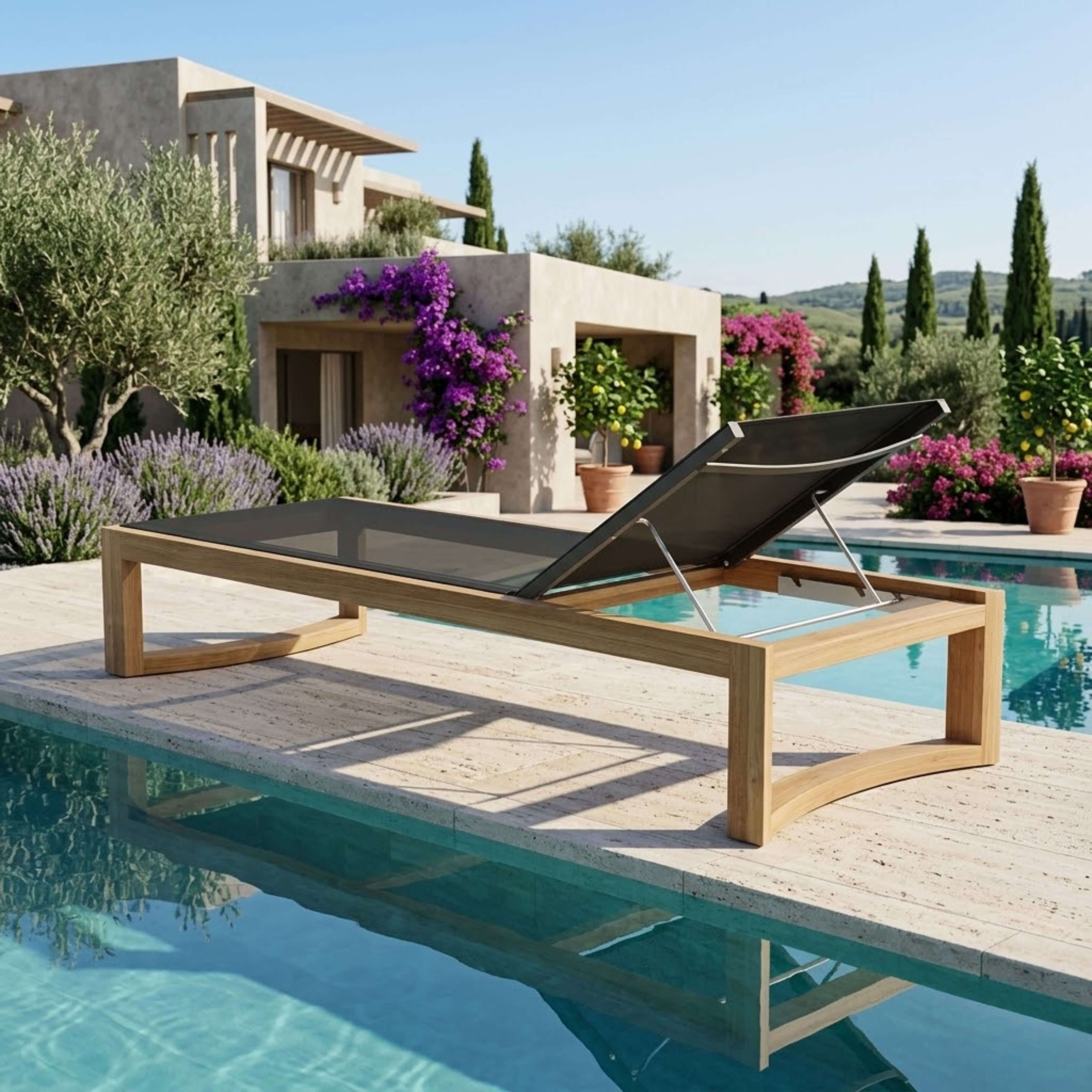 Made of premium grade unfinished teak and Serge Ferrari Batyline the Junus Sun Lounger is both sturdy and comfortable, perfect for the pool or patio. Featuring four positions including completely flat it’s easily adjustable with its stainless steel mechanism. Made from materials perfect for weathering the outdoors, this teak-batyline lounger with stainless steel hardware requires little to no maintenance. Cushions from Sunbrella Fabrics available as an add-on.