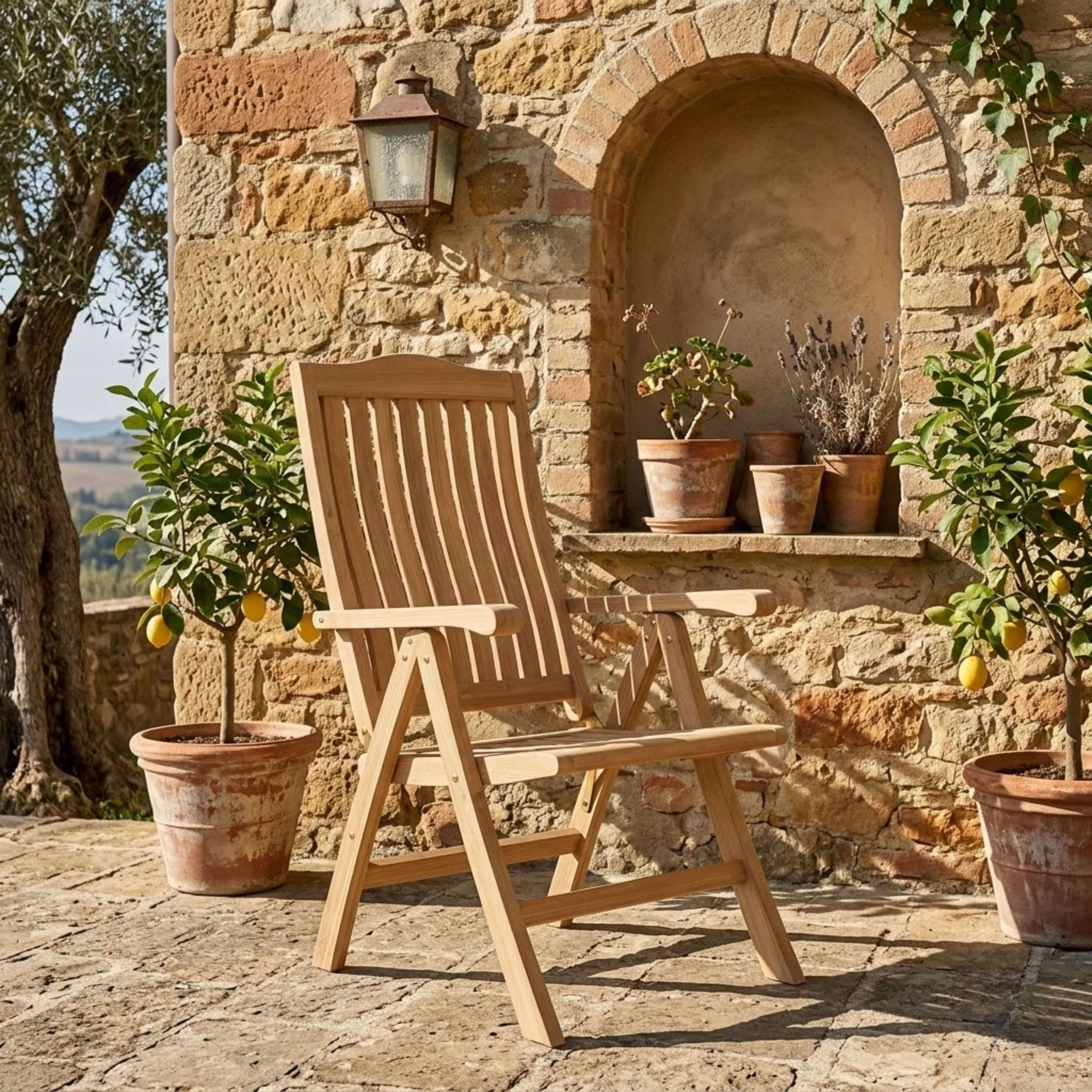 The Katana Five-Position Reclining Chair is easily adjusted from an upright dining position to a relaxed reading position to a reclined position to suit your pleasure. The chairs also folds easily for moving and storing so you can accommodate guests when you need to and hide the set when you don’t. With a 5-position adjustment, our recliners are very comfortable and versatile. A simple ratchet action makes adjustment quick and easy. Made from genuine grade teak, it is sanded smooth without any finish in its natural form and color.