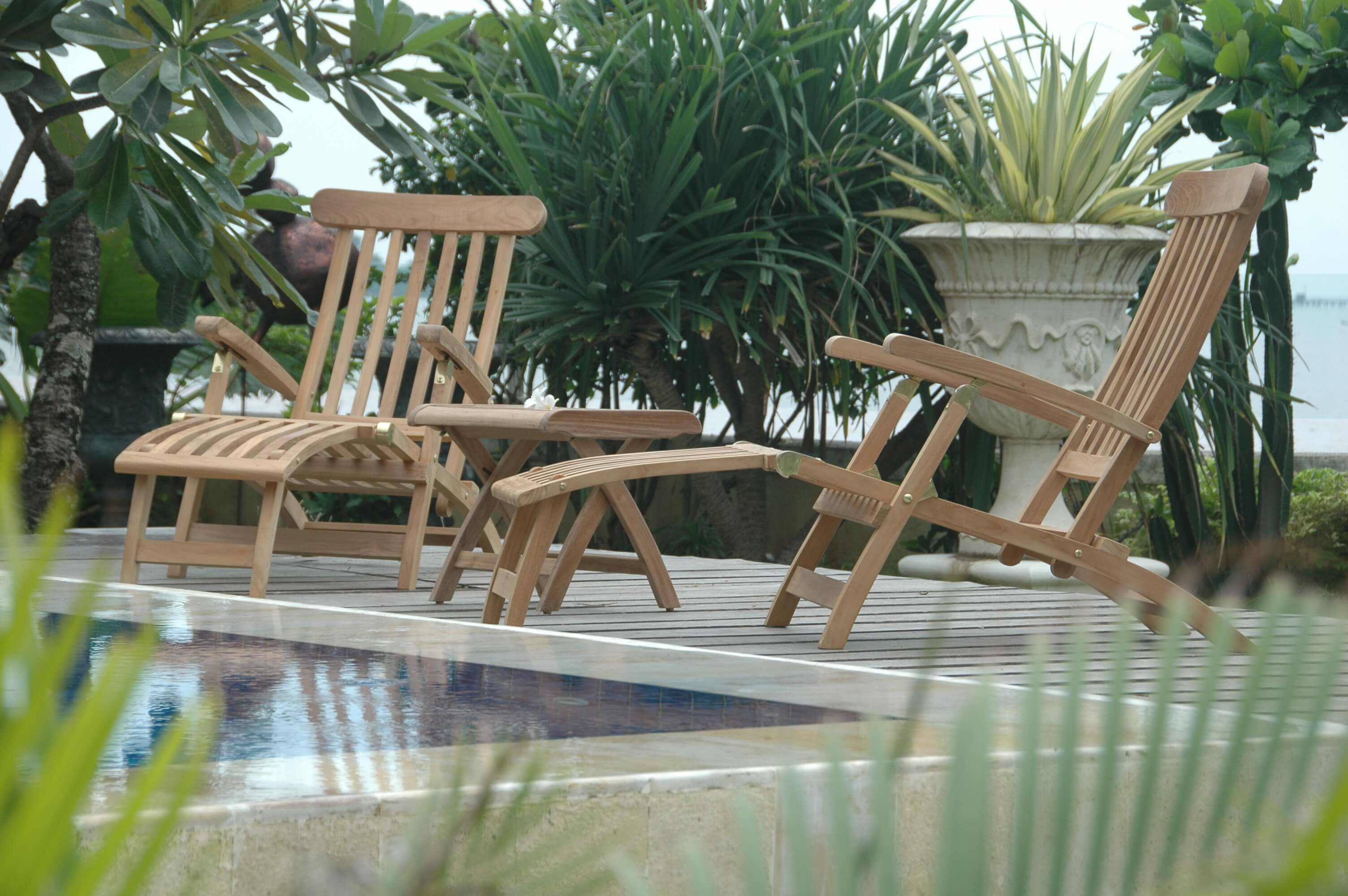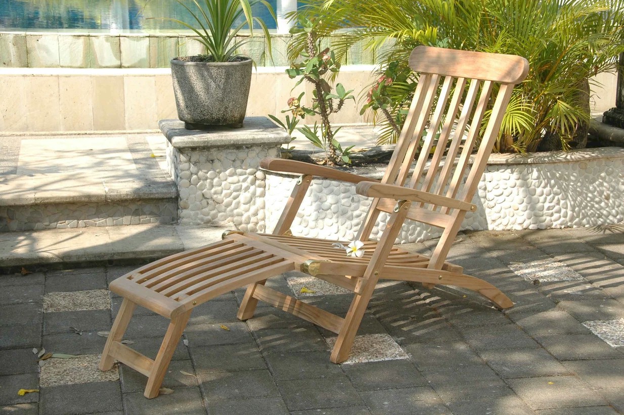 Relax in Titanic Style! Perfect for that backyard Patio, Pool, or Garden. Don't compare with redwood, pressed wood, mahogany, or even cedar for quality! Teak- means the highest durability and maximum beauty! More comfort, beauty, and durability! It comes with 2 Royal Steamer armchairs and a 1-footstool that can be used as a table as well.