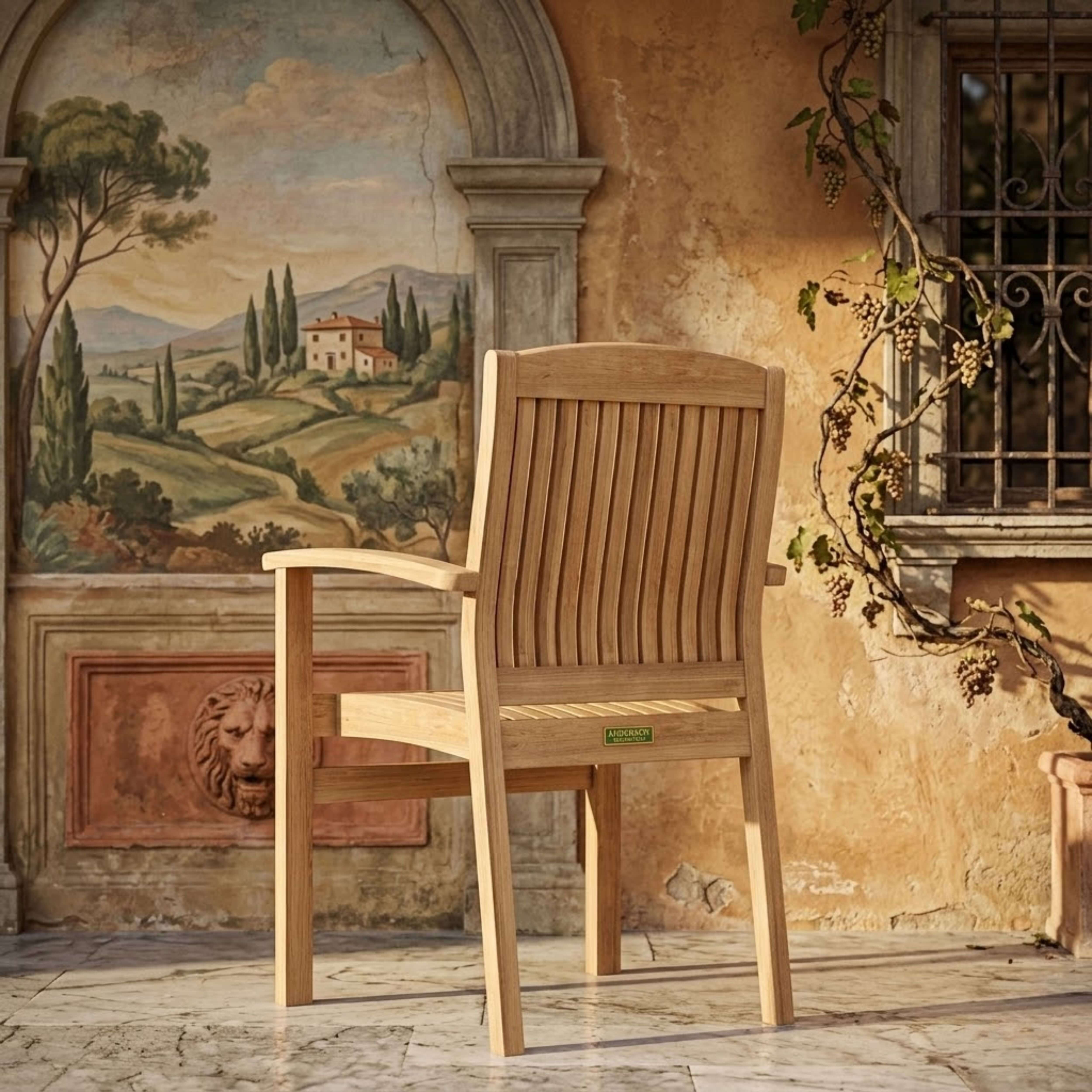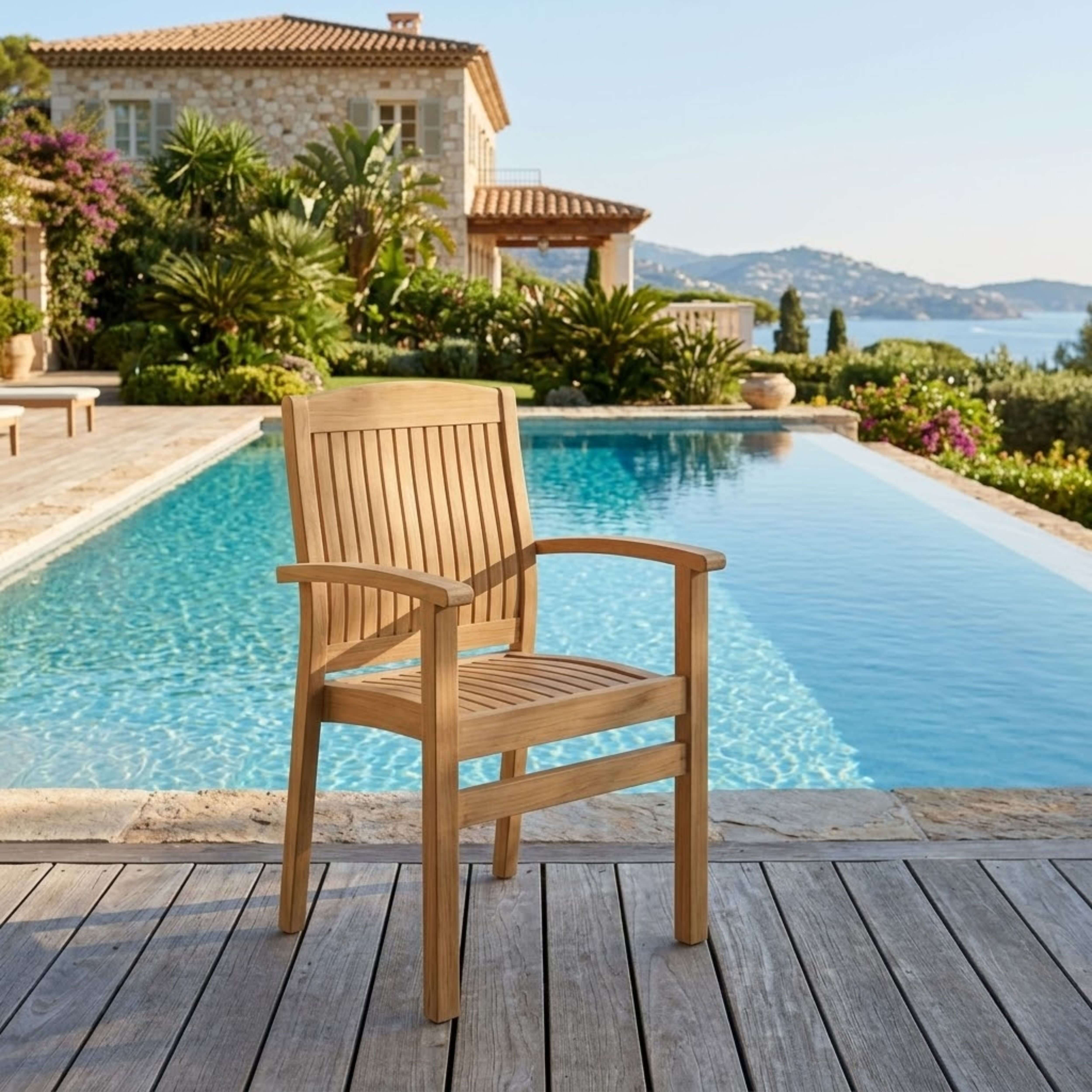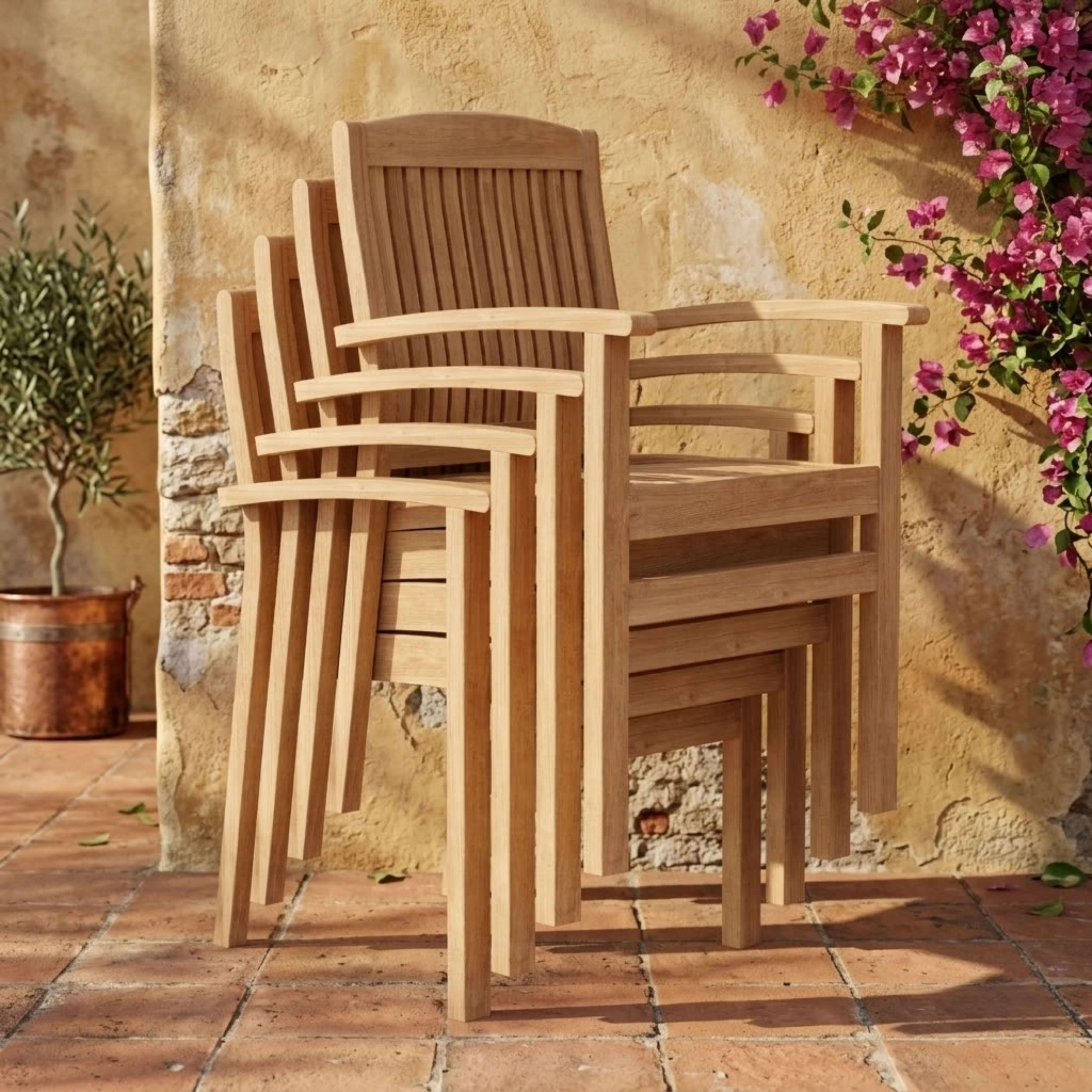 The Sahara Stackable Armchair is a versatile and stackable teak chair perfect for the patio or yard. Straight forward and sturdy, it features a curved seat and back support ensuring comfort with each use. Easy for storage and movement, it’s easily stackable up to four chairs high. Place this chair in your backyard with a dining table for an outdoor dining experience. Overtime, the chair will weather into a patina grey, or scrub down with soap and water to keep in pristine condition. Arrives fully assembled in a set of four pieces in its natural form and color without finish.