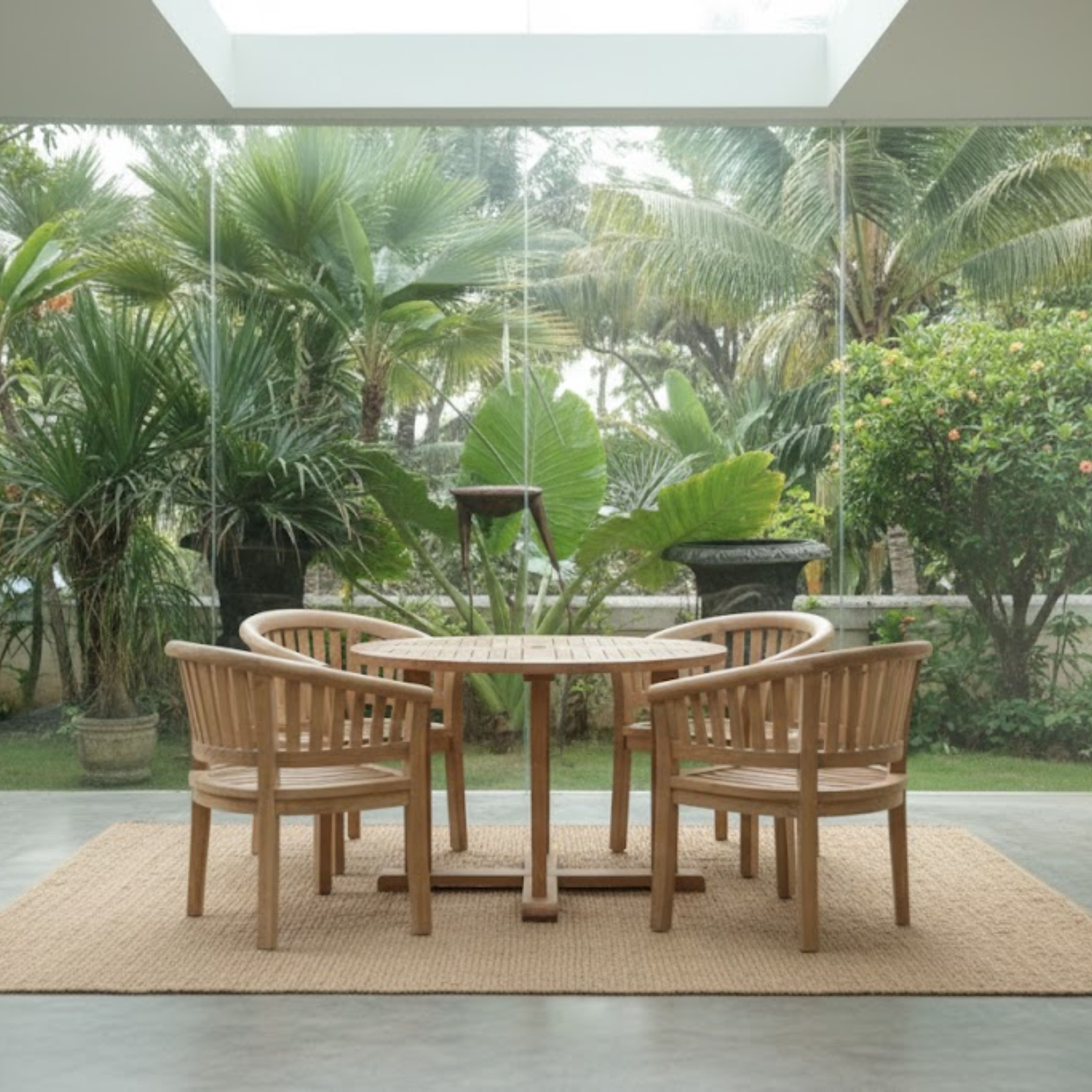 Our Simple yet sturdy, the Tosca dining tables are available in various sizes to accommodate all living space needs. Combine with the Curve dining armchairs make it perfect collection for your outdoor living furniture. This set includes a 47″ Round Table that fit for 4 people comfortably. Table and chairs are all constructed using mortise and tenon construction for strength and durability. The outdoor furniture made of premium quality plantation teak. This set will provide decades of enjoyment for family and friends. Umbrella hole is available standard comes with the table. Additional all weather cushions from Sunbrella can be applied for extra comfort.