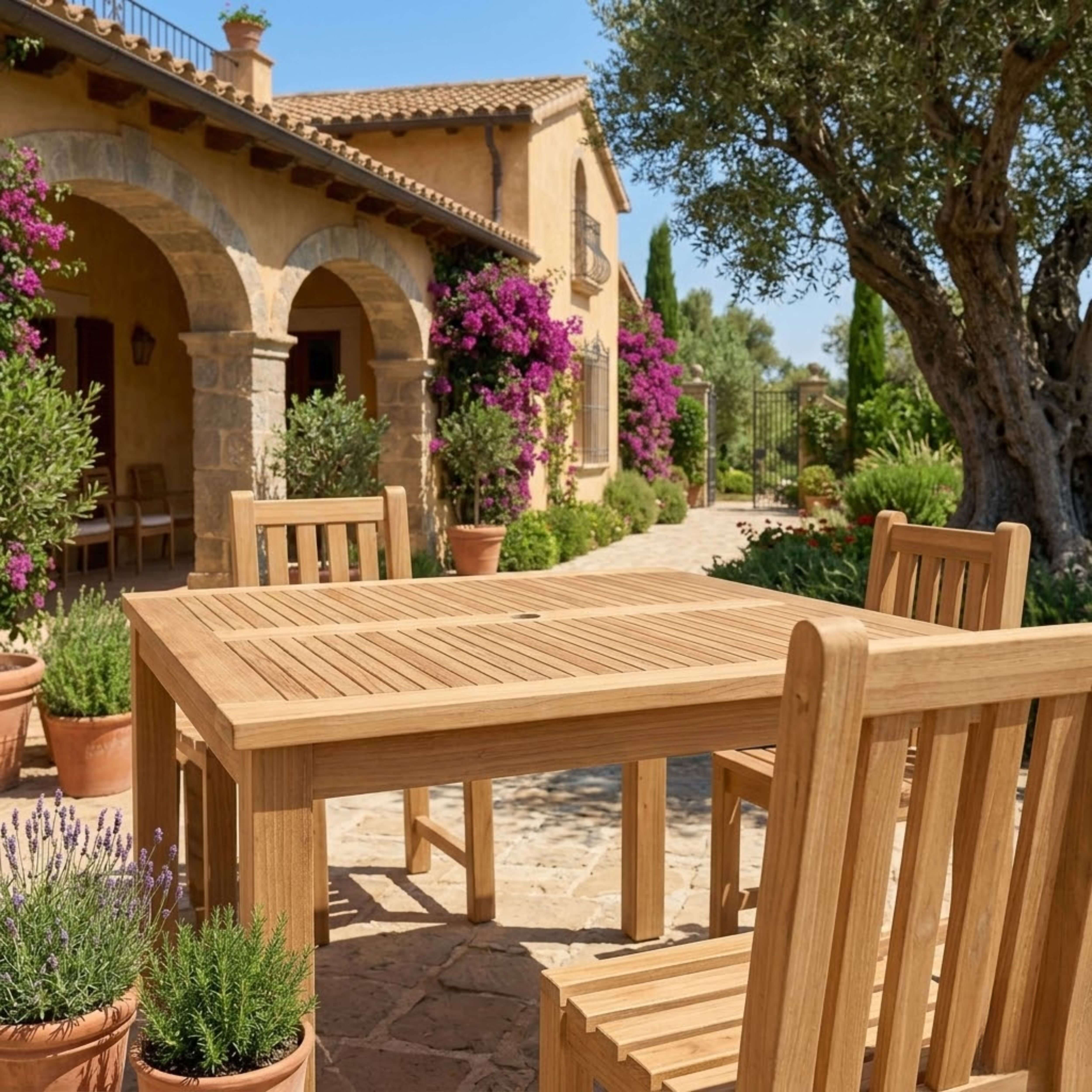 A spacious and durable teak outdoor dining set for the patio or yard, this set includes a Windsor 47” Square Table with four Classic Dining chairs. Made of solid teak wood sanded smooth without finish, the Windsor 47” Square Dining Table is a bulky and quality sized table that’s durable and stable; while the Classic Dining Chair features curved and countered seating for a comfortable seating experience. The perfect table set for outdoor dining or a game of cards, guests will be amazed by its quality built frame and size as well as the smoothness and touch of the authentic teak wood. Table includes an umbrella hole with brass plug when not in use.