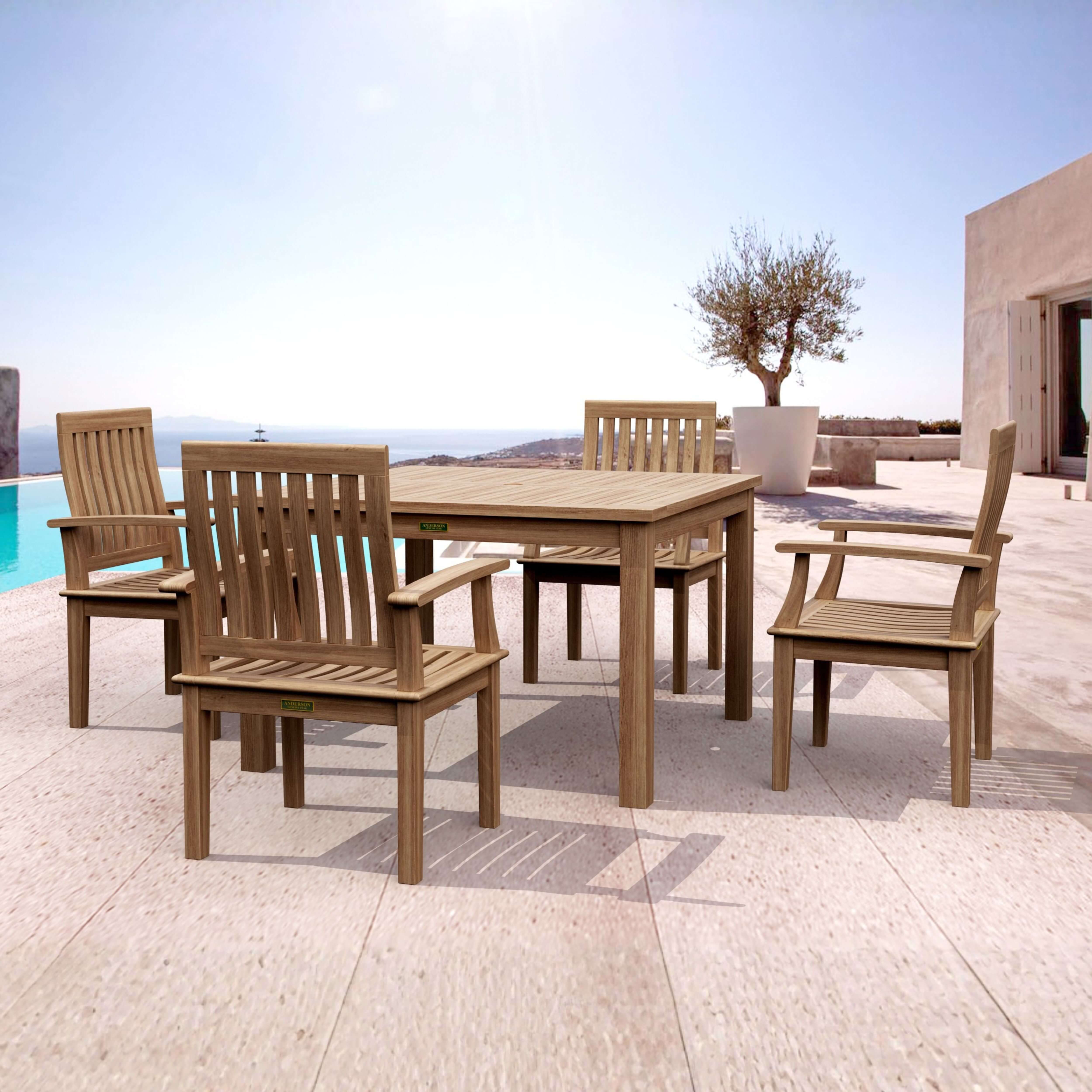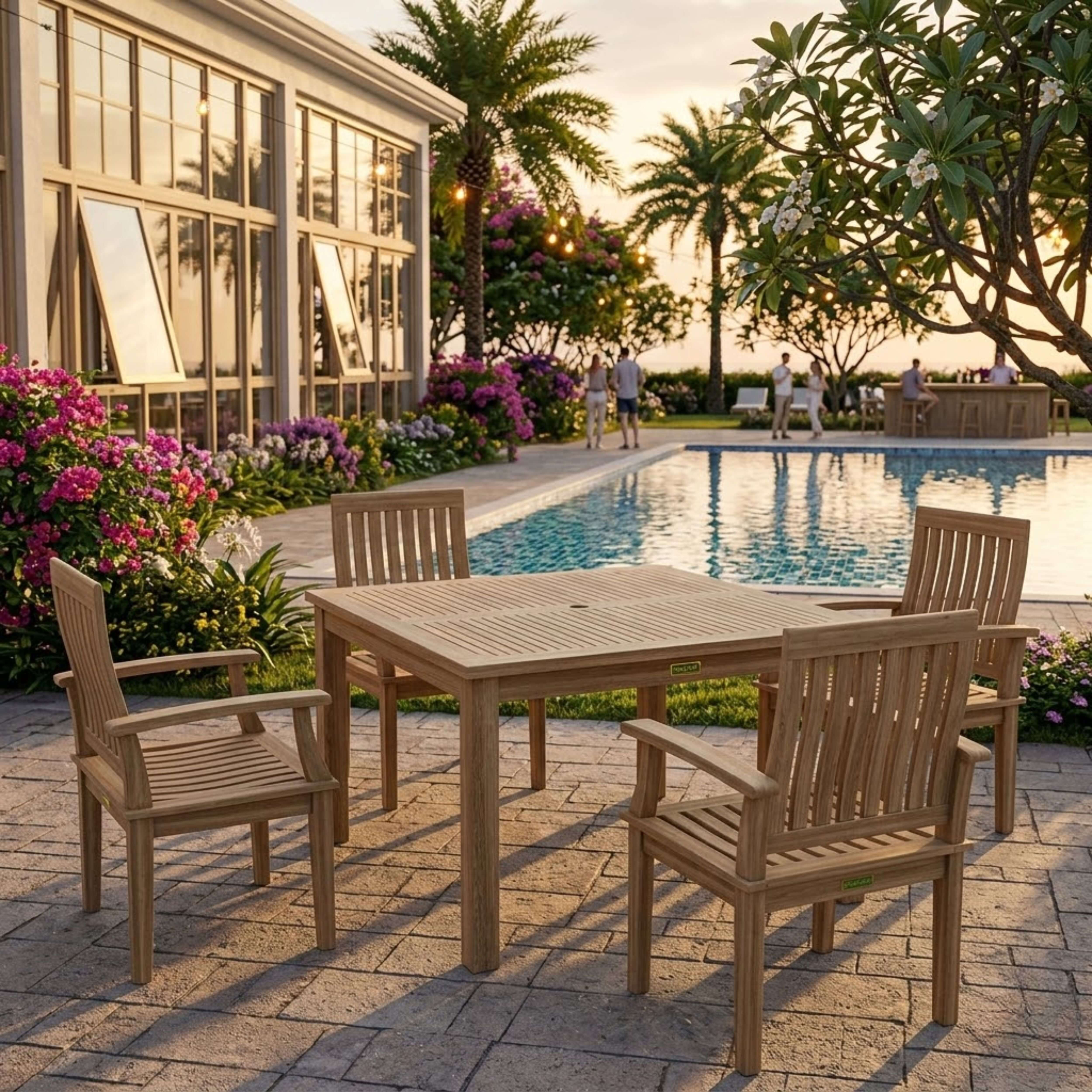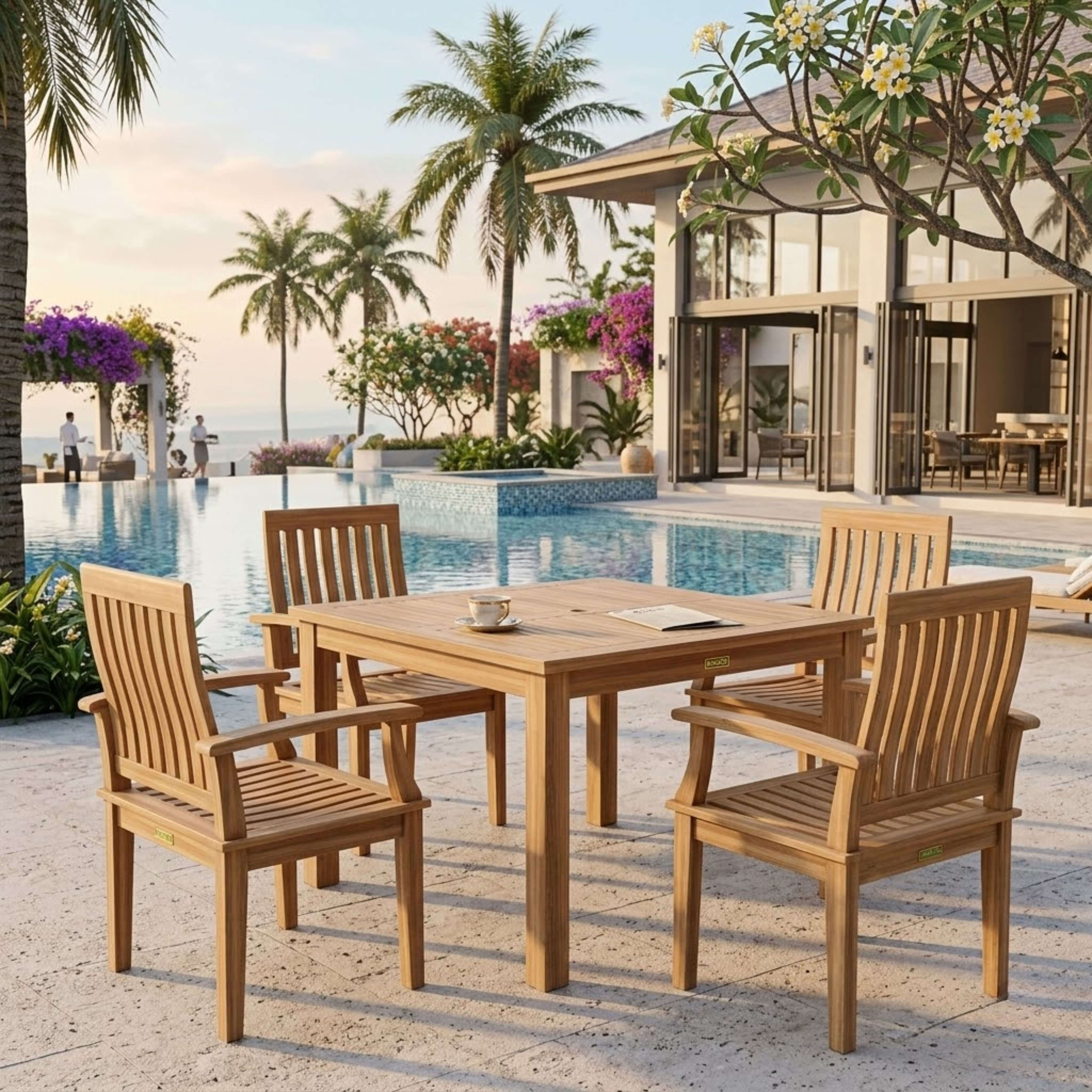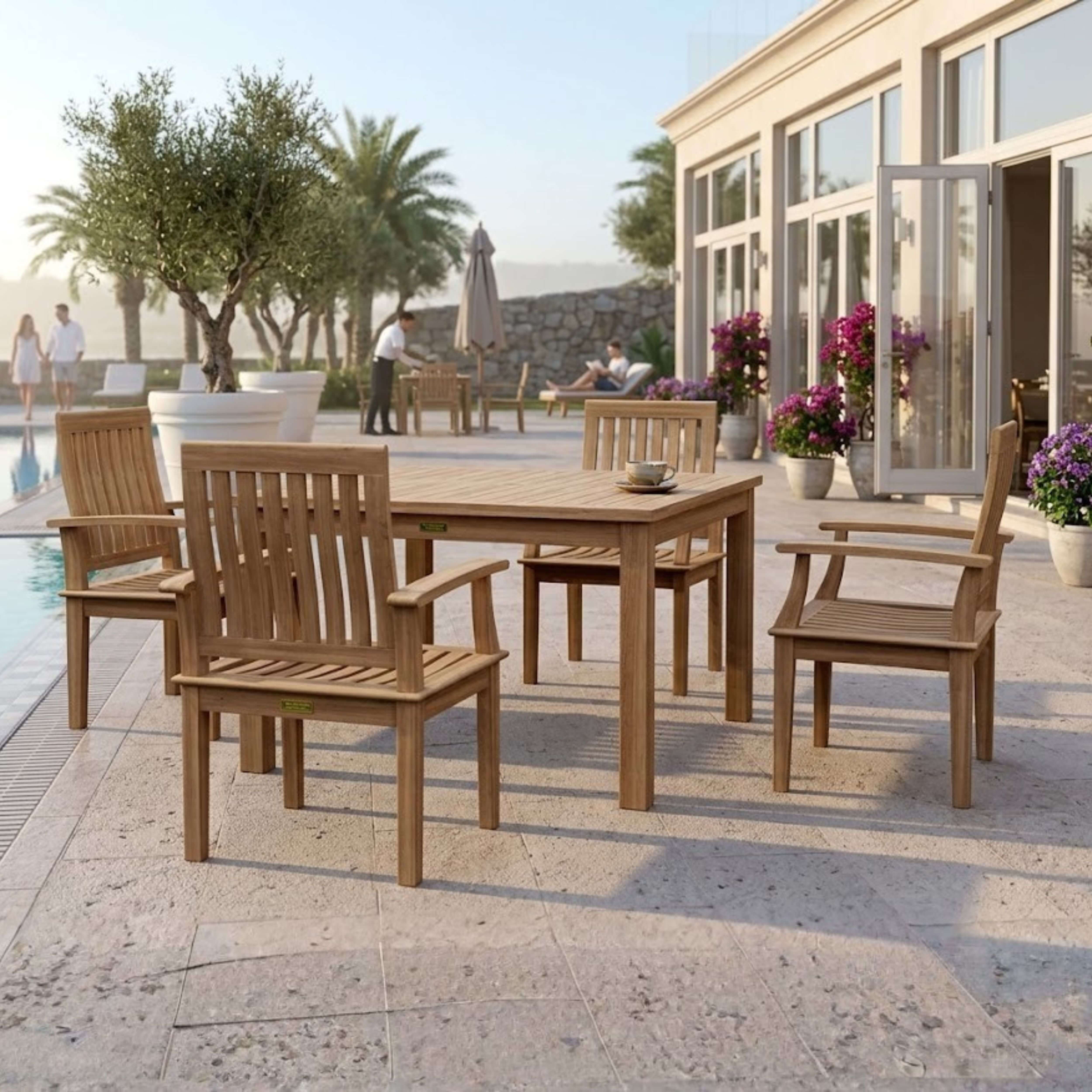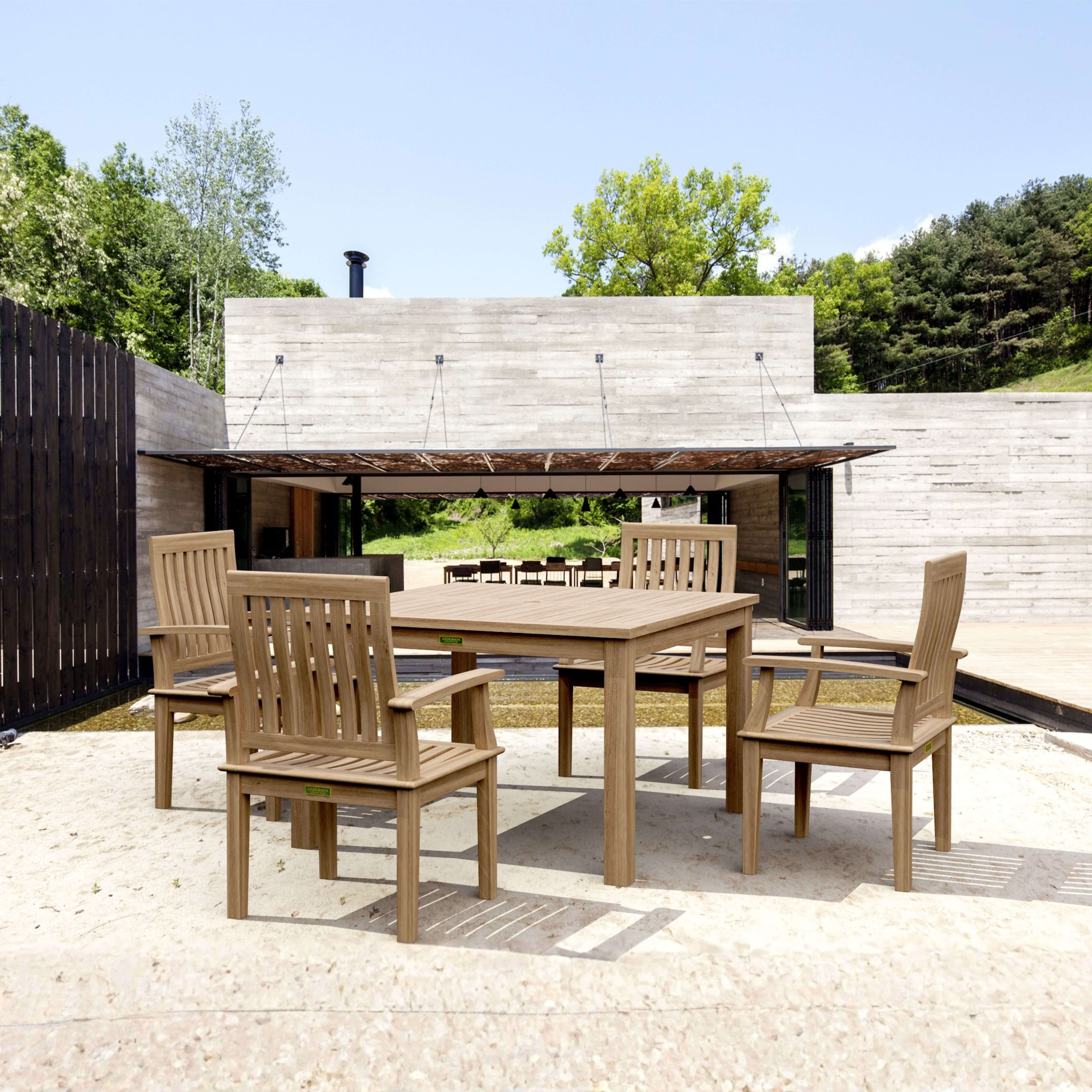 The Windsor teak wood table is a square dining table that is perfect for both indoors and out. Perfect size for 4 people while enjoying the dine surrounding with friends or family. Combining with Brianna armchair will make this set be the center of the evening conversation. The table and chairs are all constructed using mortise and tenon construction from strength and durability. The set made of premium quality plantation grown teak from Indonesia where the best teak tree grows. It is built with durable teakwood to ensure many years of continued use. Add all-weather cushions from Sunbrella for extra comfort. Cushions are sold separately.