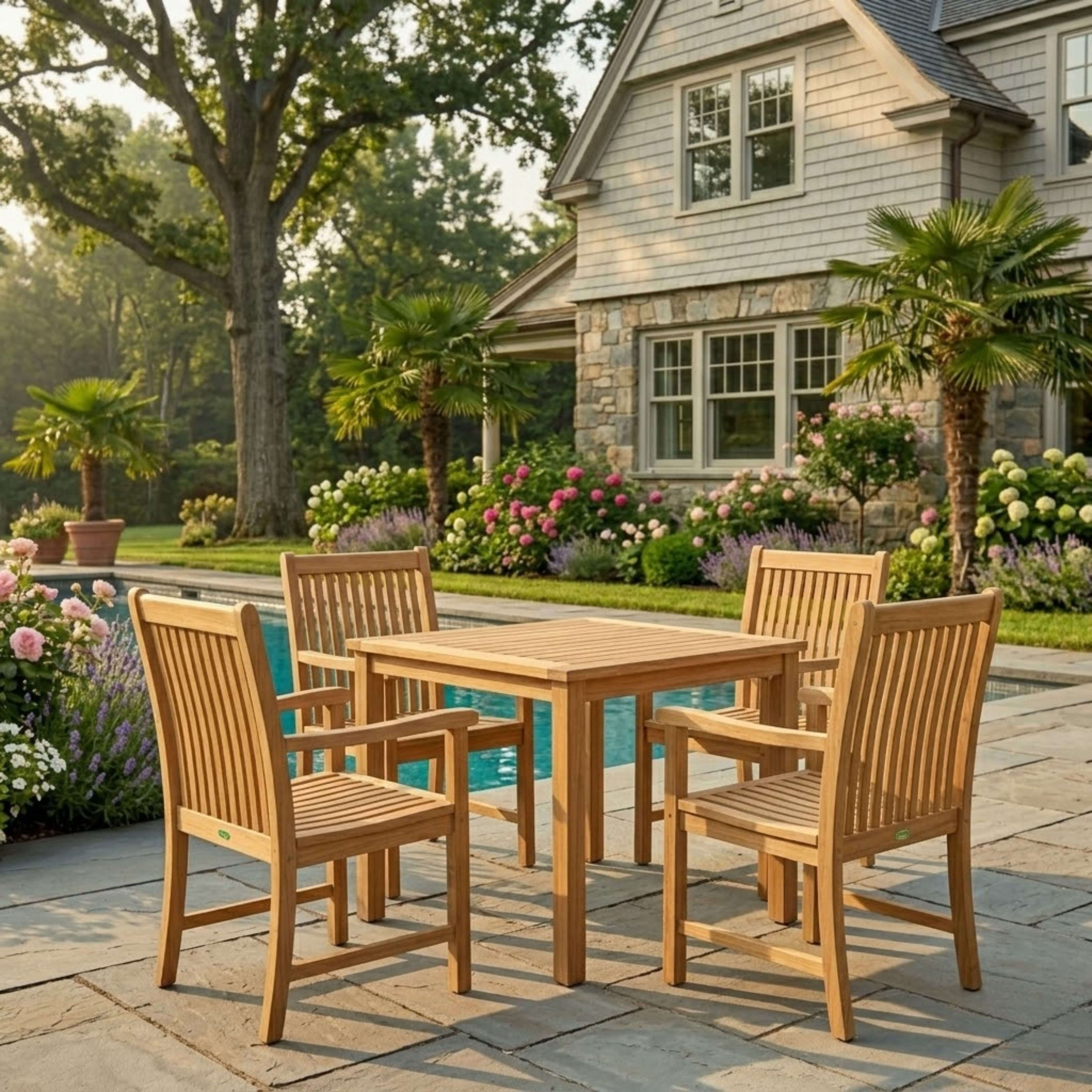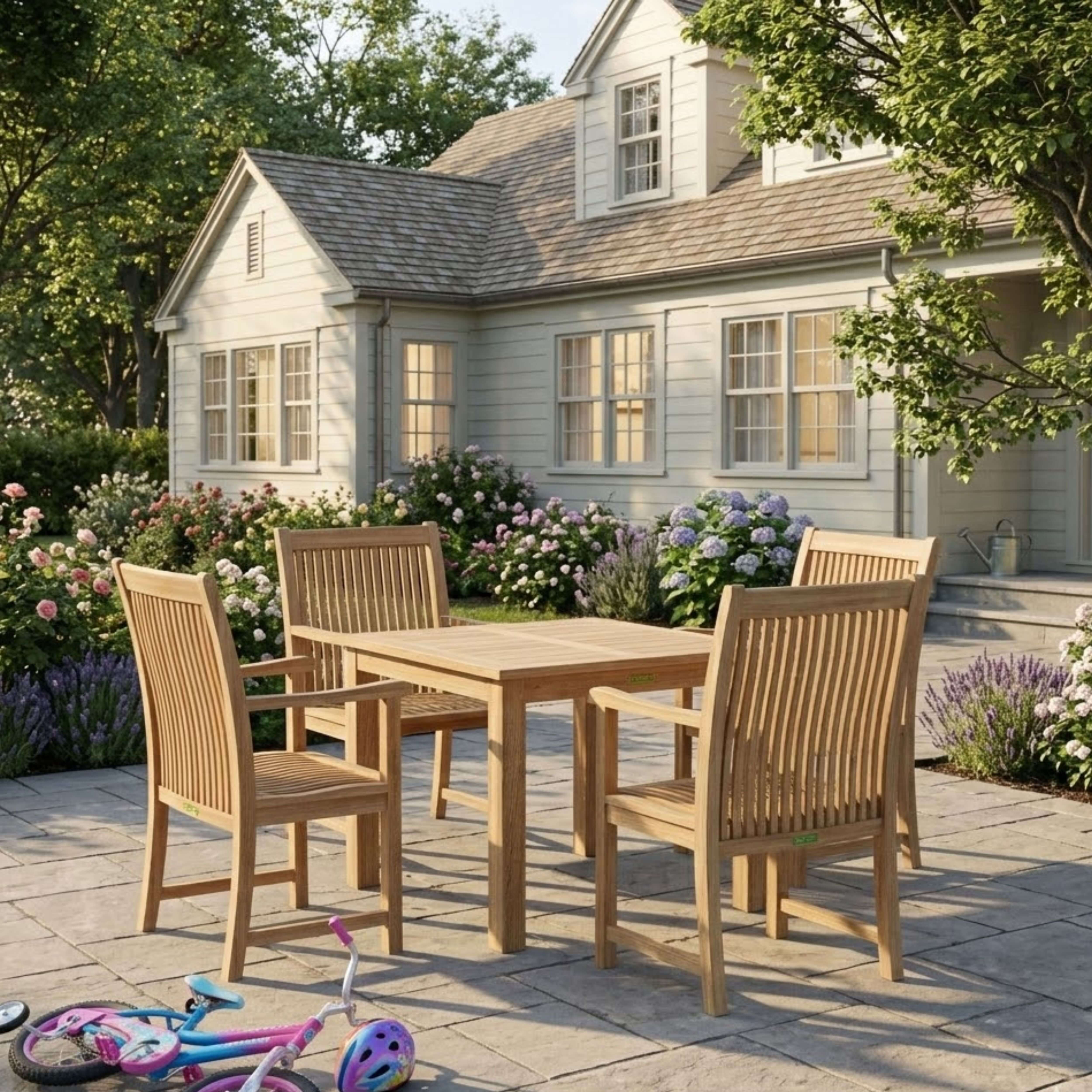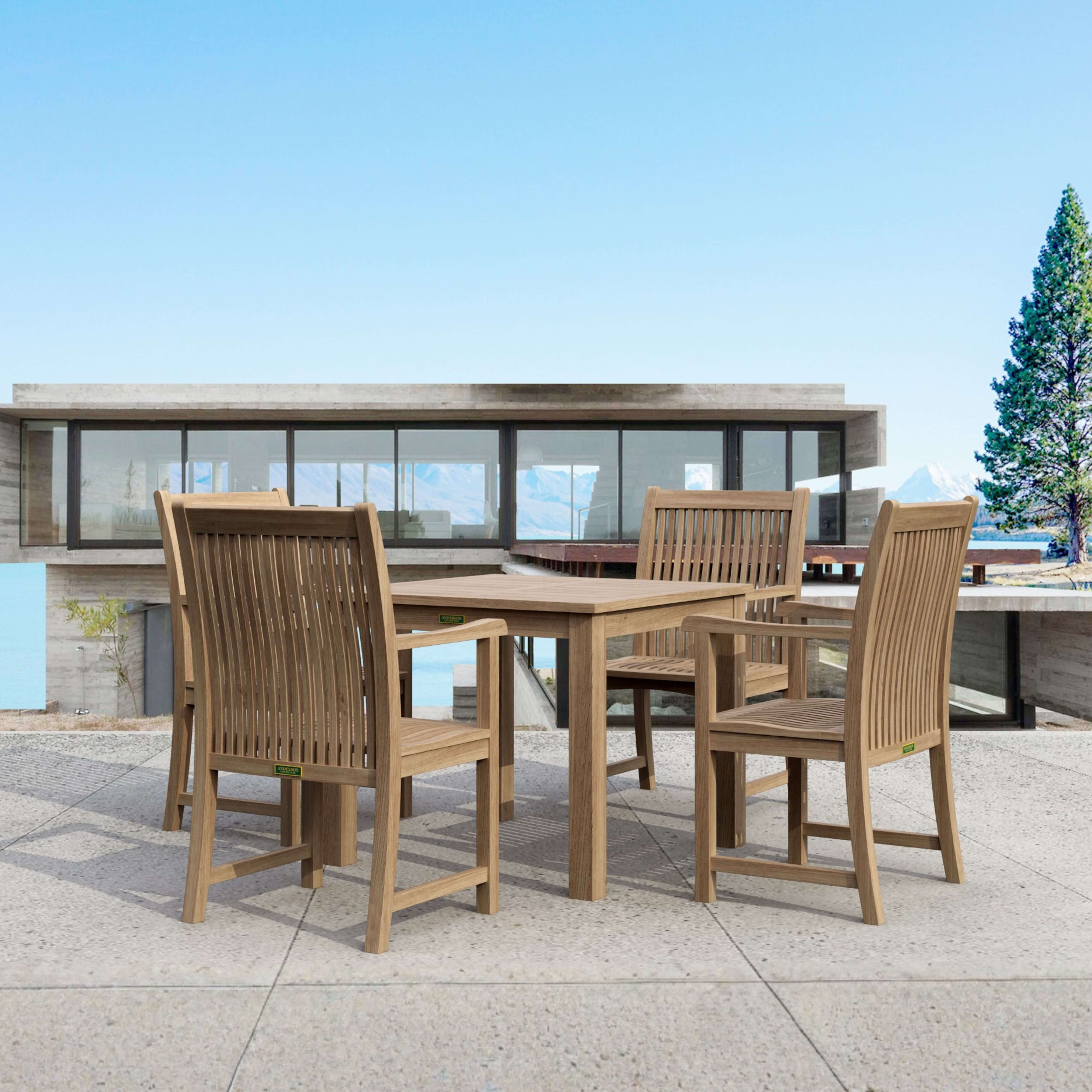 The perfect teak outdoor dining set for the patio or yard, this bistro set includes a Bahama 35” Square Table and four Chicago Dining Armchairs. Made of solid teak wood sanded smooth without finish, the Bahama 35” Square Bistro Table is a bulky and thick quality sized table that is durable and stable, perfect for the outdoors; while the Chicago Dining Armchairs feature curved and contoured seating for a comfortable dining experience. Overtime, the set will weather into a patina grey, or scrub down with soap and water to keep in pristine condition.