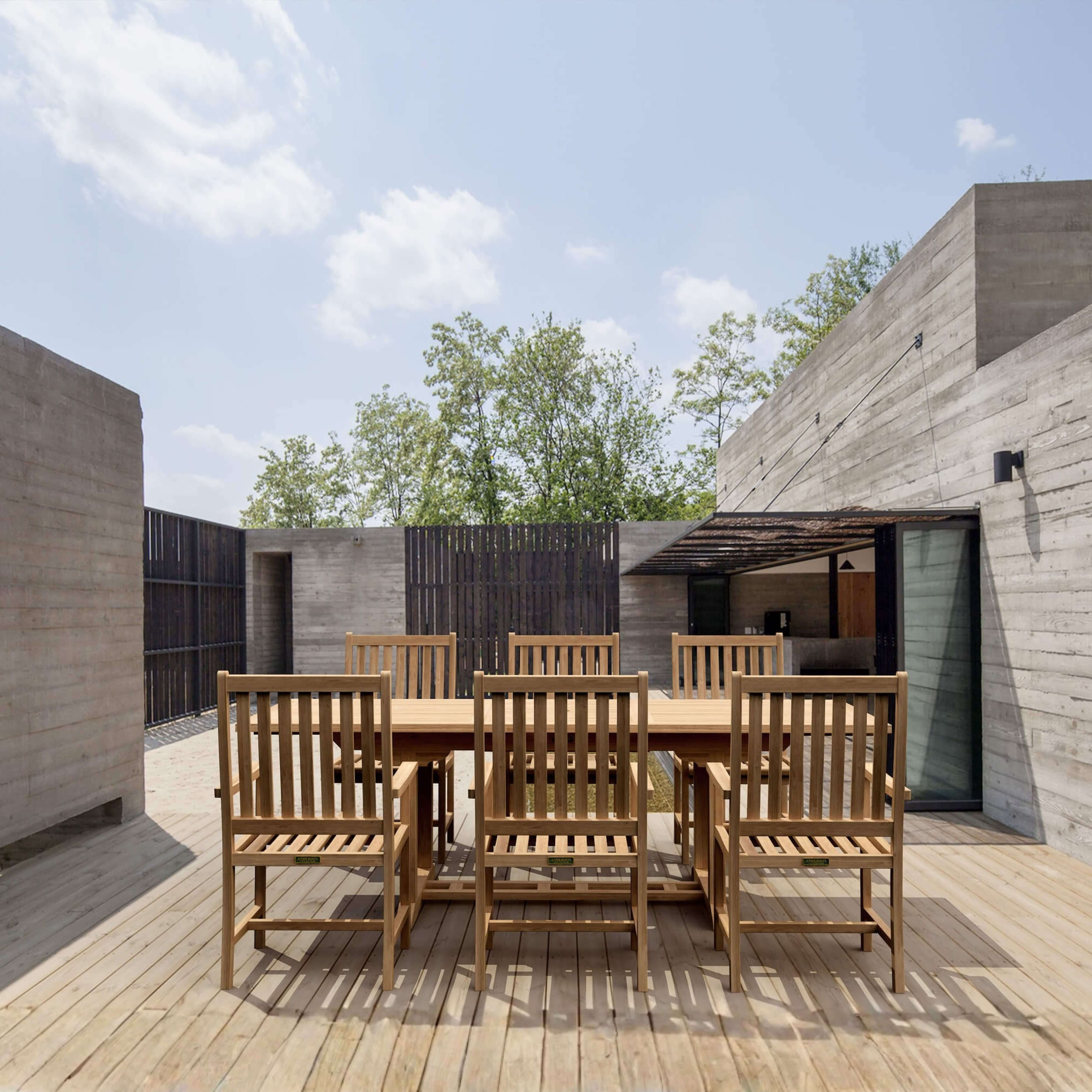 Enjoy the beauty of your backyard and the pleasure of outdoor dining with this Bahama Dining Table 7-piece dining set. The set includes a rectangular dining table with butterfly extension for additional table space or to accommodate unexpected guests! It also includes 6 dining armchairs. All constructed with countered seats and back to support your lumber. Made of premium quality plantation teak using mortise tenon construction for strength and durability. This set will provide decades of enjoyment for family and friends. Add all-weather cushions from Sunbrella for extra comfort.