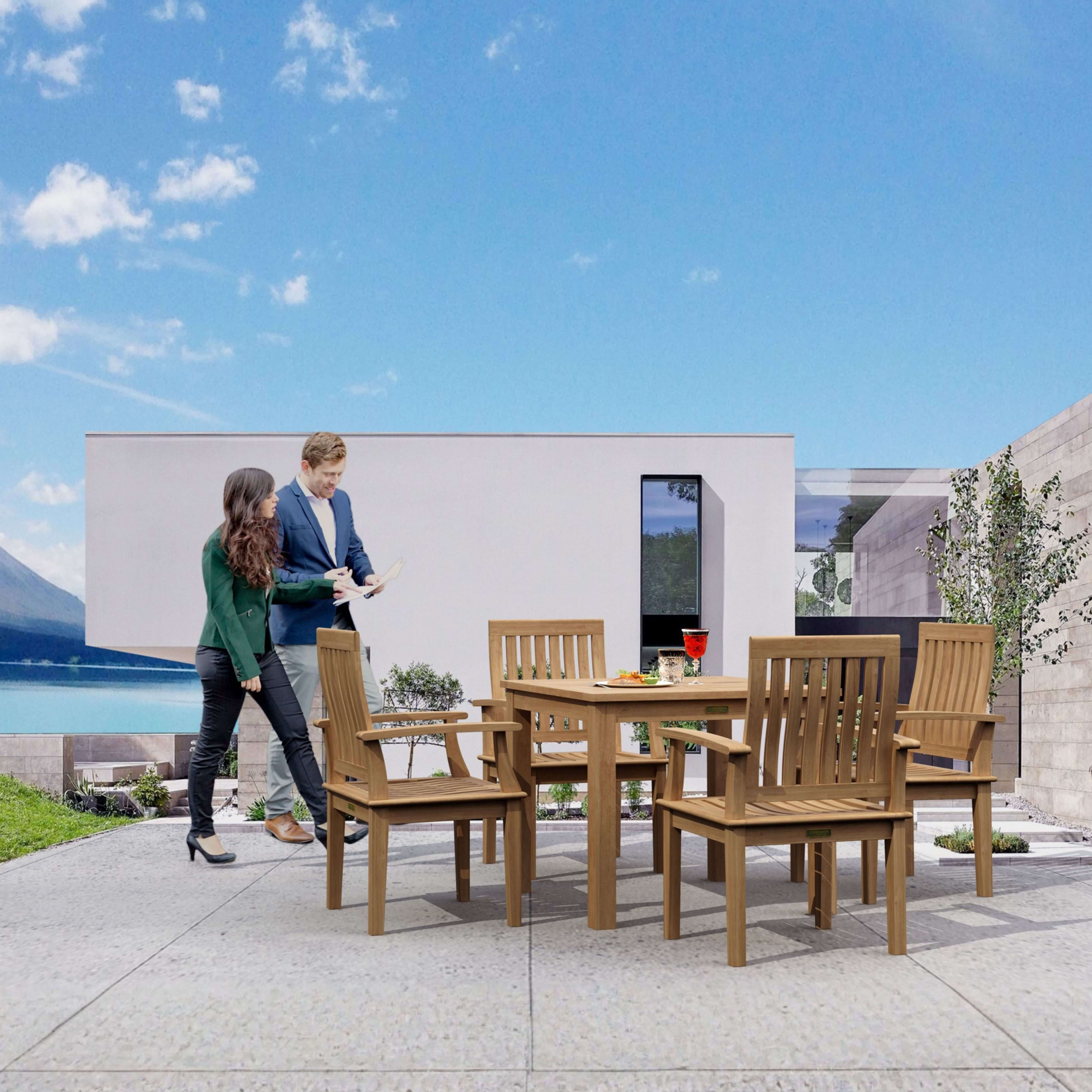 Enjoy an outdoor lunch in the comfort of the yard with this stylish modern-classic teak furniture. With its tapered legs, reclined back and curved armrests, be sure to add All-Weather Sunbrella Cushions for greater comfort with color of your choice. A reliable and stylish teak outdoor set, it is crafted from the finest java teak wood designed and sanded smooth without any finish in its natural form and color; a perfect material for weathering the outdoors. Overtime, the set will weather into a patina grey, or scrub down with soap and water to keep in pristine condition.