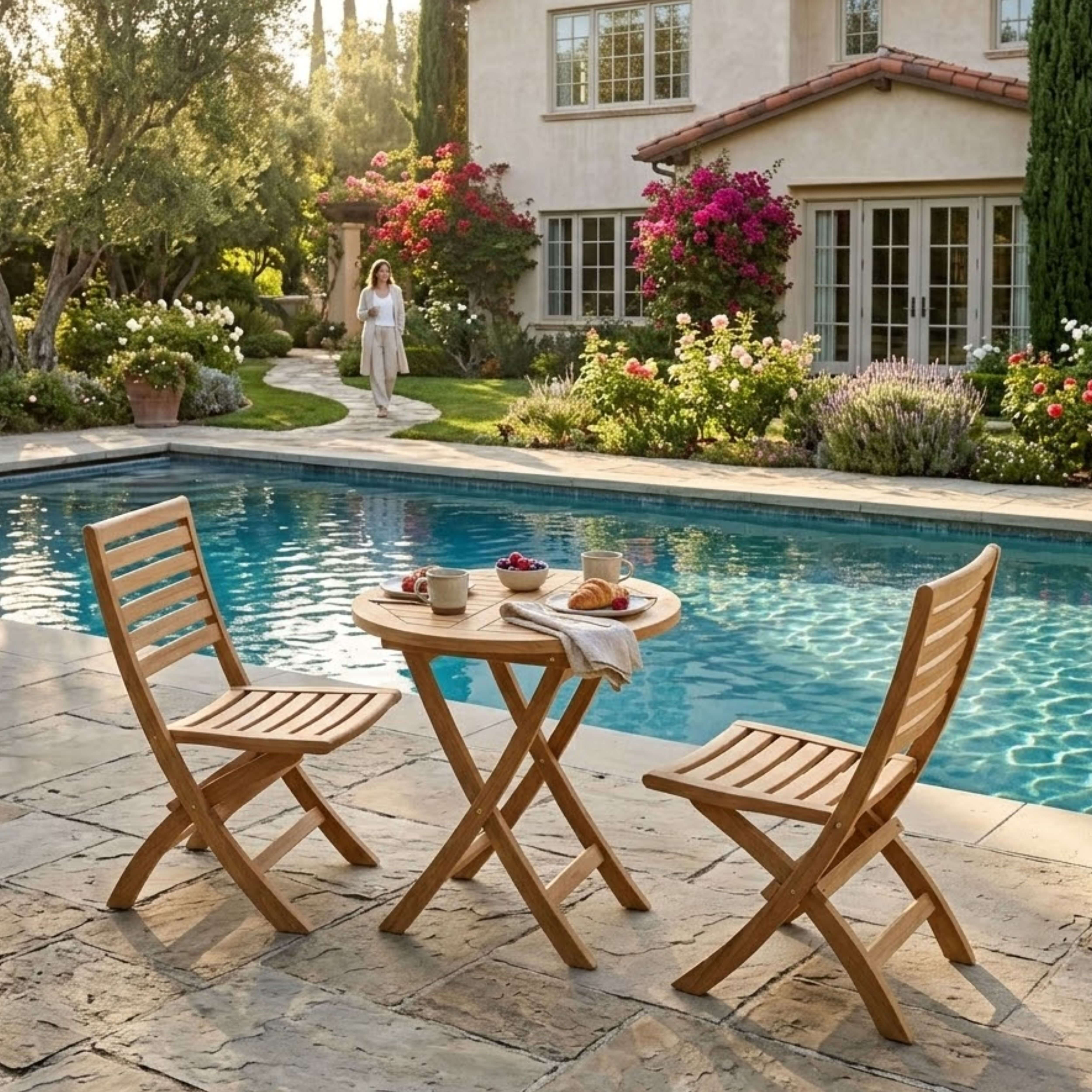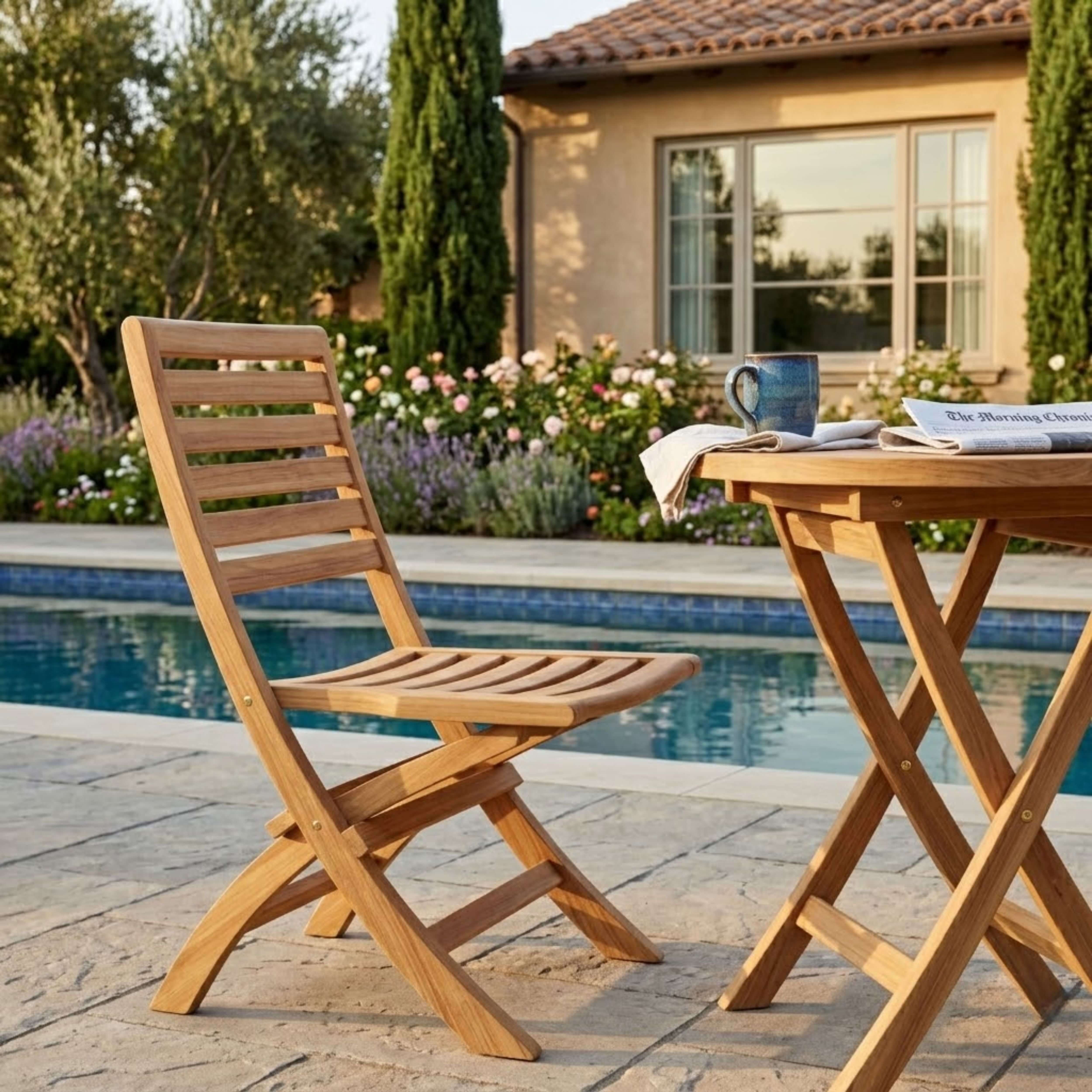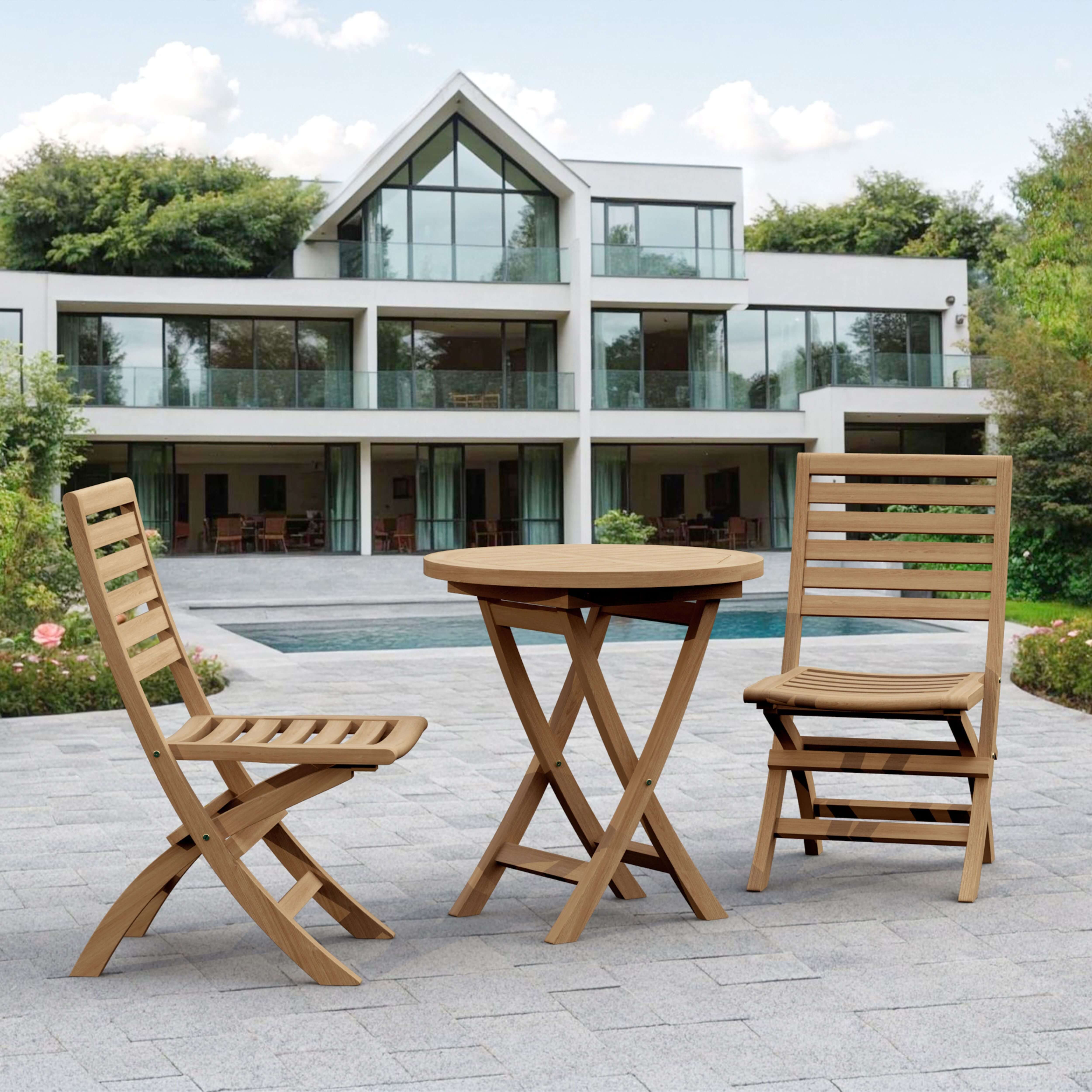 The petite and compact Teak Outdoor Bistro Set for two, it includes a Bahama 27” Round Folding Table with two Andrew Folding Chairs. The Bahama 27” Round Folding Table features an easy fold design which makes it great for small spaces, portability and storage. The table and chairs can also be folded completely flat, enabling many chairs to fold and stack together when not in use. Made of solid teak wood that is durable yet light, it is perfect for the outdoors, boating, restaurant use and café, where space is limited and where chairs are only required occasionally. Overtime the set will weather into a patina grey, or scrub down with soap and water to keep in pristine condition.