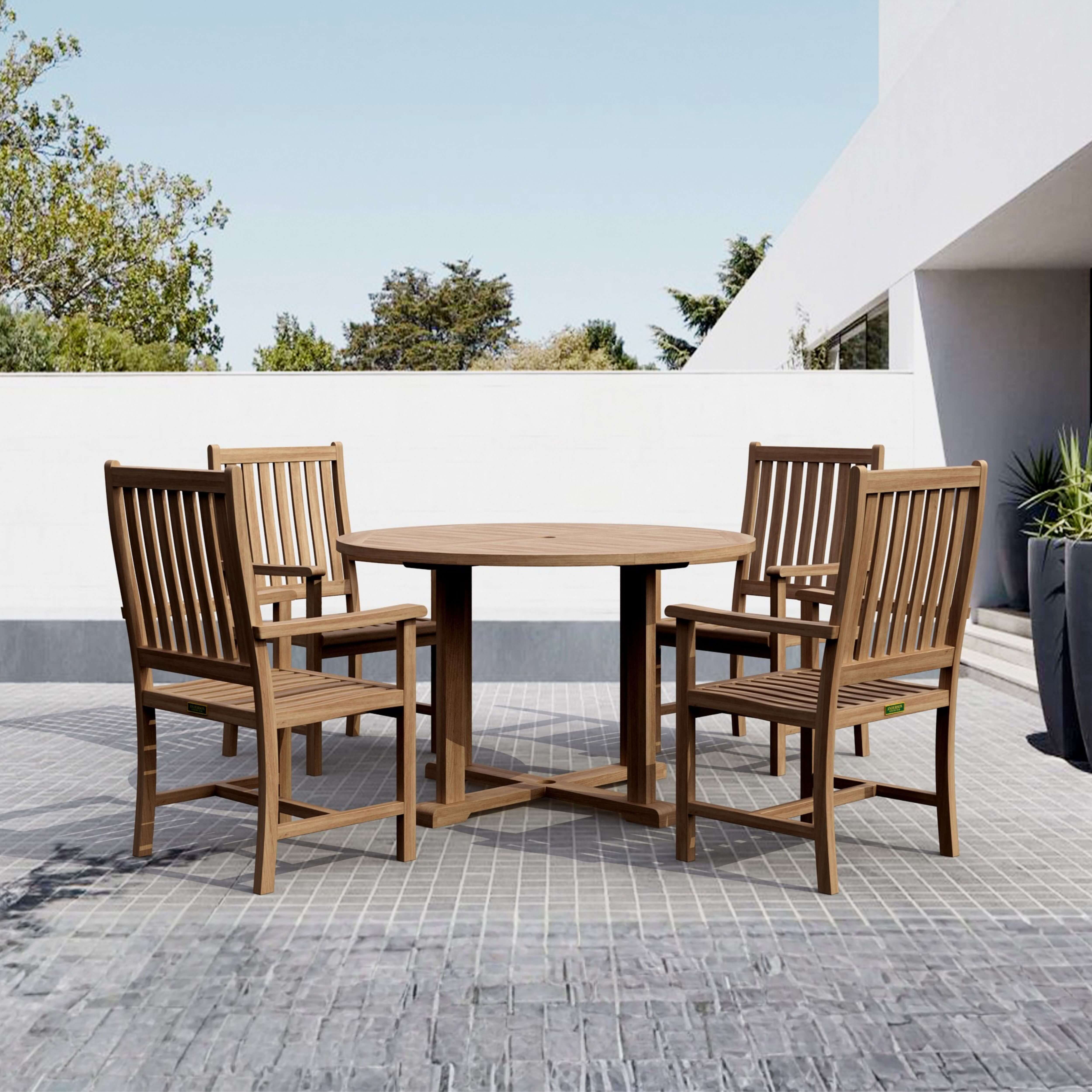 SET-16 is combination of Tosca 47″ round table and 4 Wilshire dining armchairs. This collection is a perfect addition to your backyard. The table comes with umbrella holes and brass plug as a standard. It fits for 4 people comfortably. Well blended with the Wilshire armchair which have high back to support your upper back nicely. The classic style of the table and chairs will never go out of style, but quietly blends with any other designs and colors. The seat is sturdy as well as the back. Add all weather Sunbrella cushions for more comfort. Place this collection at the corner of your backyard, will amazed your family and friends. This piece is made for generation to enjoy.