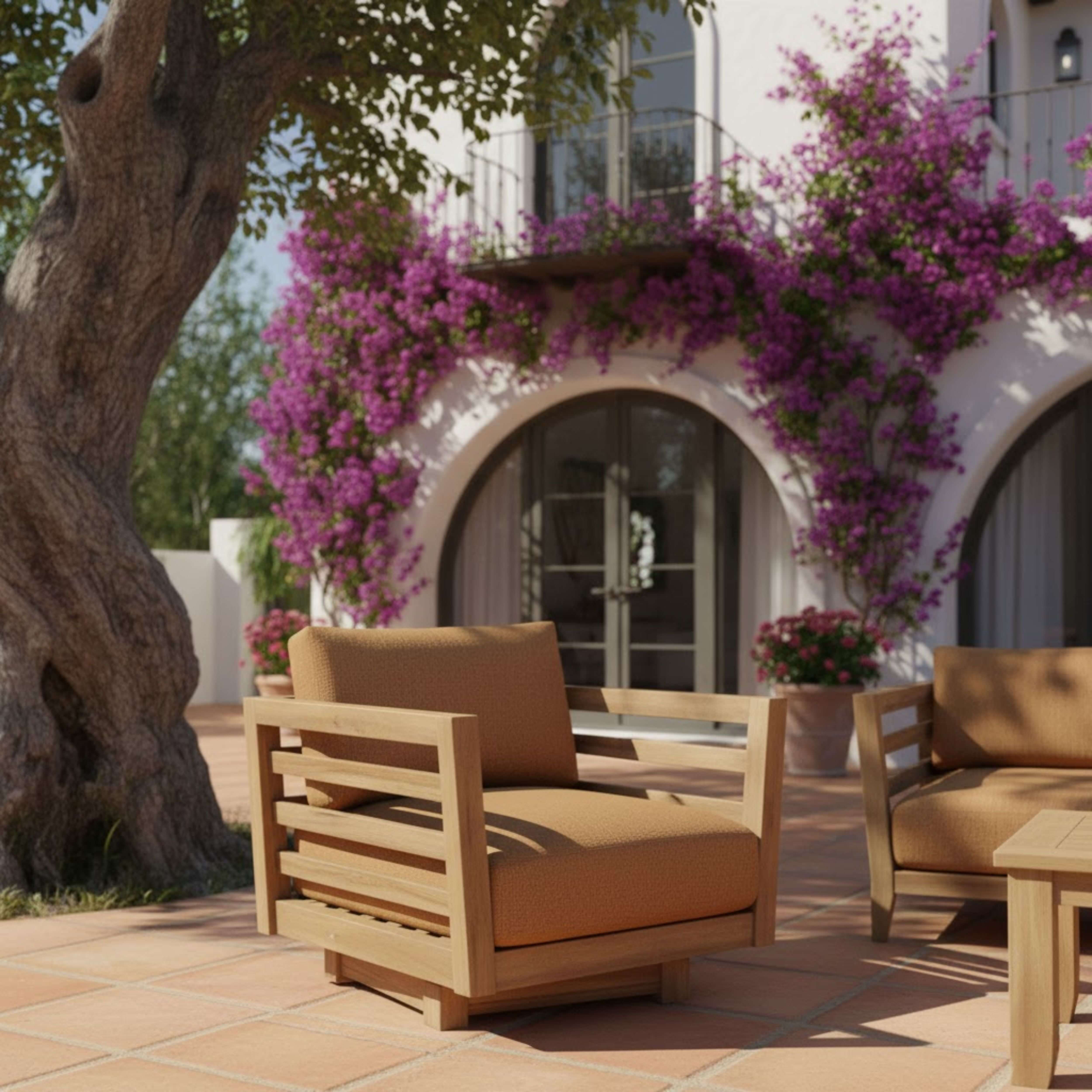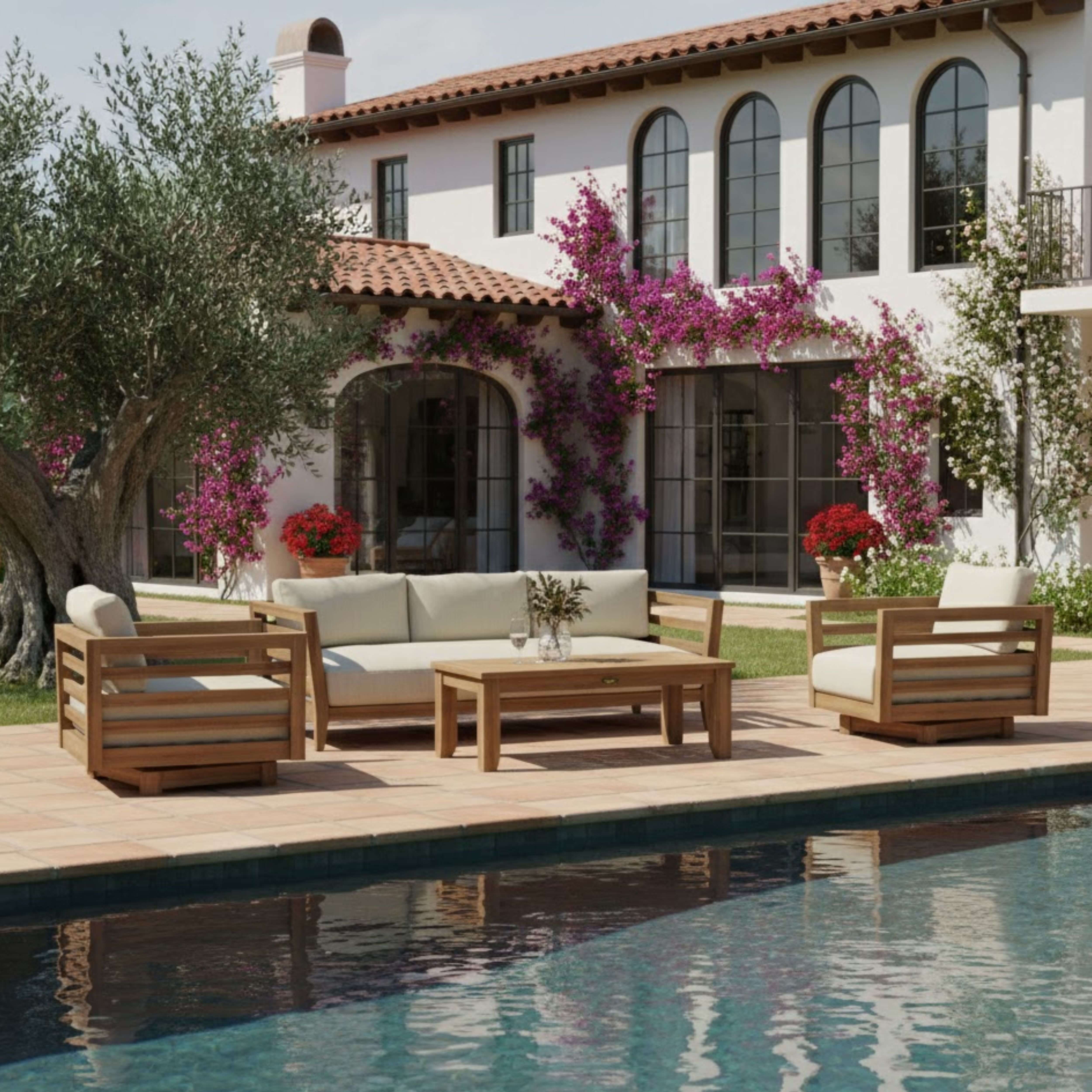 The perfect lounge set for an evening gathering with family and friends, enjoy a chat, a drink or a game with the Cordoba Deep Seating Swivel Set and Sofa. Comfortable and stylish, The Cordoba Swivel Armchair features 360 Degrees of Swivel movement that doesn’t snap back – but holds firmly in place at any position. Set also includes a 48″ Cordoba Rectangular Coffee Table perfect for placing drinks, books, or playing cards, and the 83” Cordoba Deep Seating Sofa, a quality-built fully sized sofa which is sure to make any décor or setting pop. Constructed from premium unfinished teak shaped to exquisite form, it includes 6” thick cushions from All-Weather Sunbrella Fabrics with choice of color and pattern option.