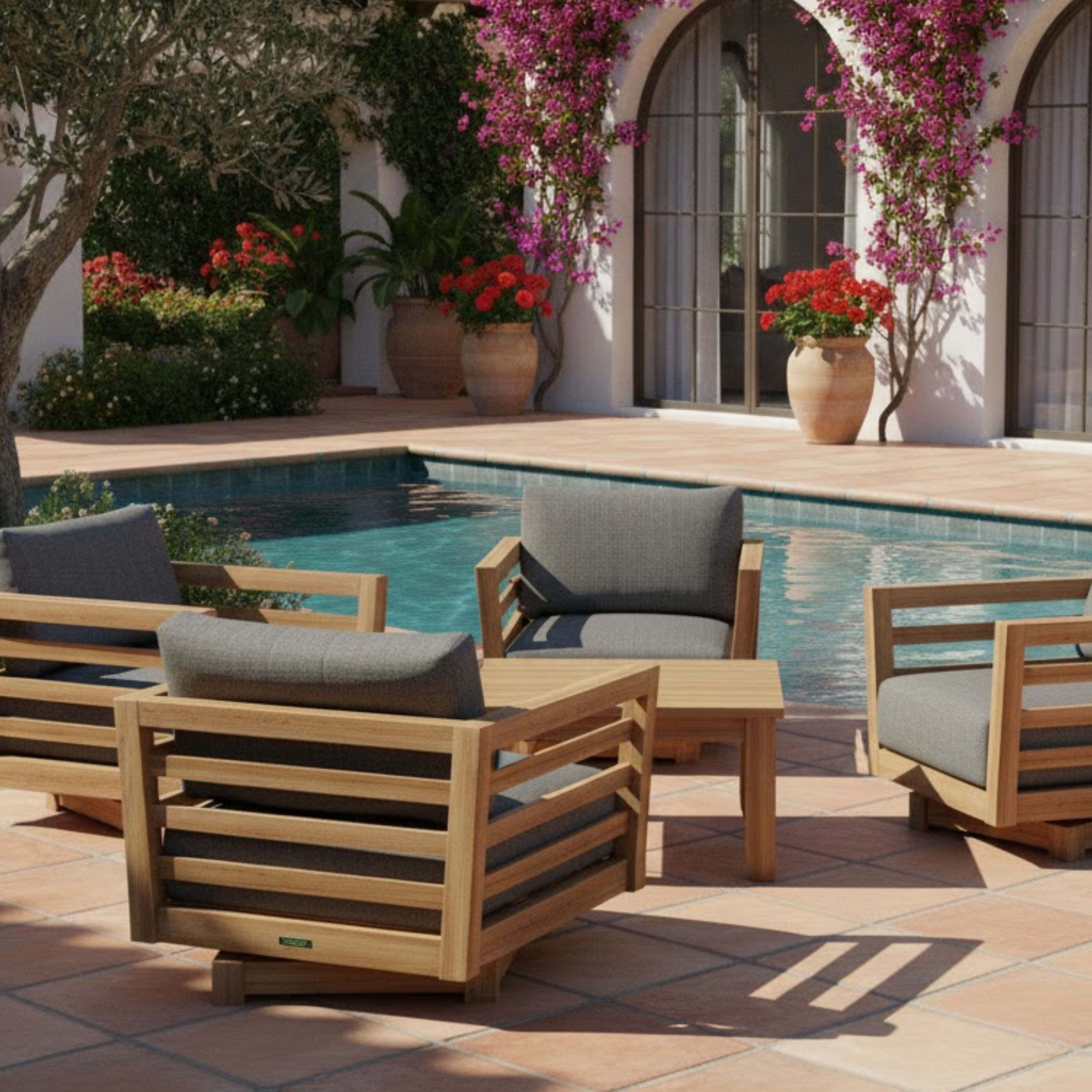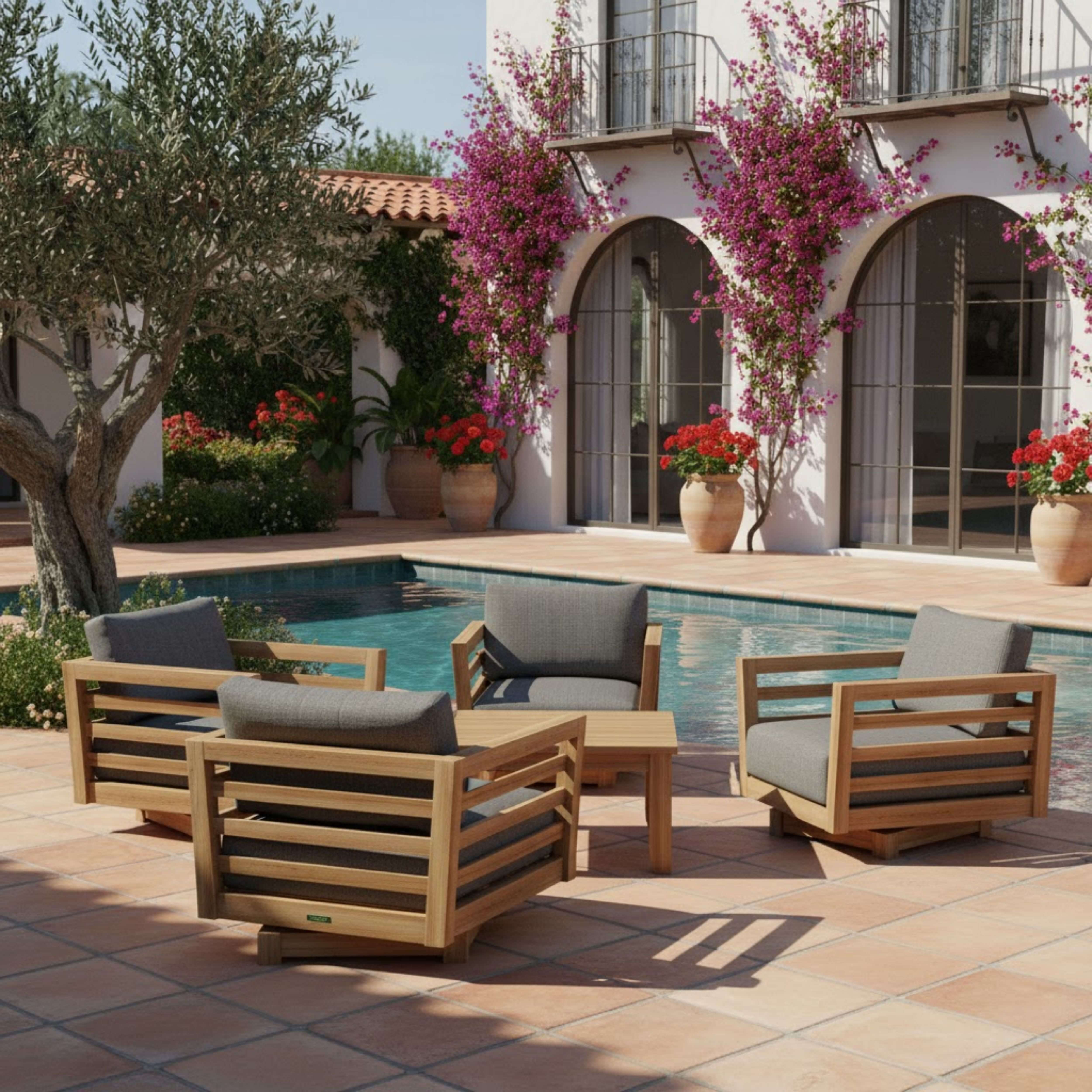 The perfect lounge set for family and friends, enjoy lighthearted conversations, a game, and a drink with the Cordoba Deep Seating Swivel Set. Comfortable and stylish, it features 360 Degrees of Swivel movement that doesn’t snap back – but holds firmly in place at any position. Set includes 33″ Cordoba Square Coffee Table perfect for placing drinks, books, or playing cards, and four swivel armchairs. Constructed of premium unfinished teak shaped to exquisite form, it includes 6” thick seating cushions from All-Weather Sunbrella fabrics with color and pattern options.