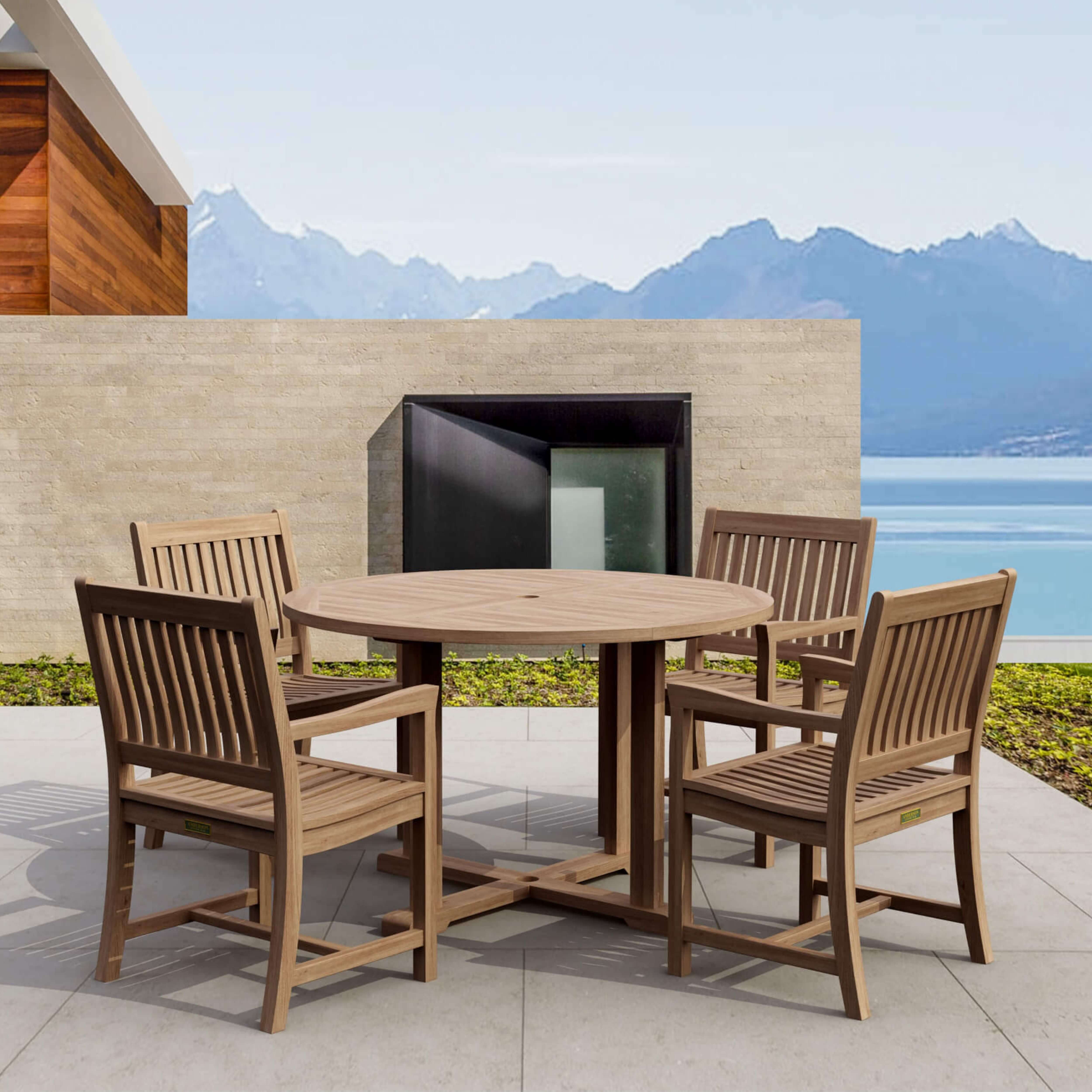 SET-17 is combination of Tosca 47″ round table and 4 Rialto dining armchairs. This collection is a perfect addition to your backyard. The table comes with umbrella holes and brass plug as a standard. It fits for 4 people comfortably. Well blended with the Rialto armchair which have curve back to support your lower and upper back. The classic style of the table and chairs will never go out of style, but quietly blends naturally with any other designs and colors. The seat is sturdy as well as the back. Place this collection at the center of your backyard, will amazed your family and friends. This piece is made for generation to enjoy. Additional all weather cushions from Sunbrella can be applied for extra comfort.