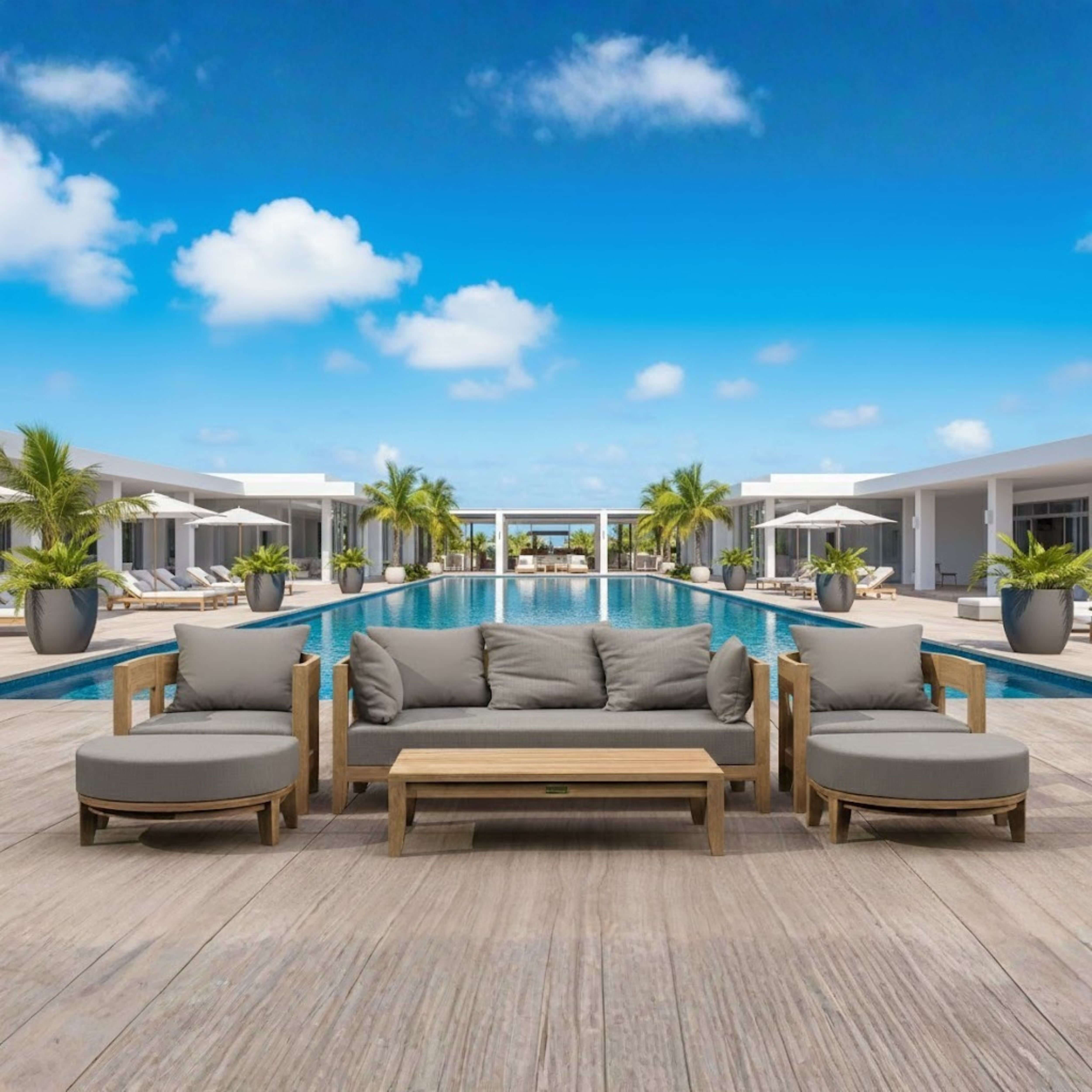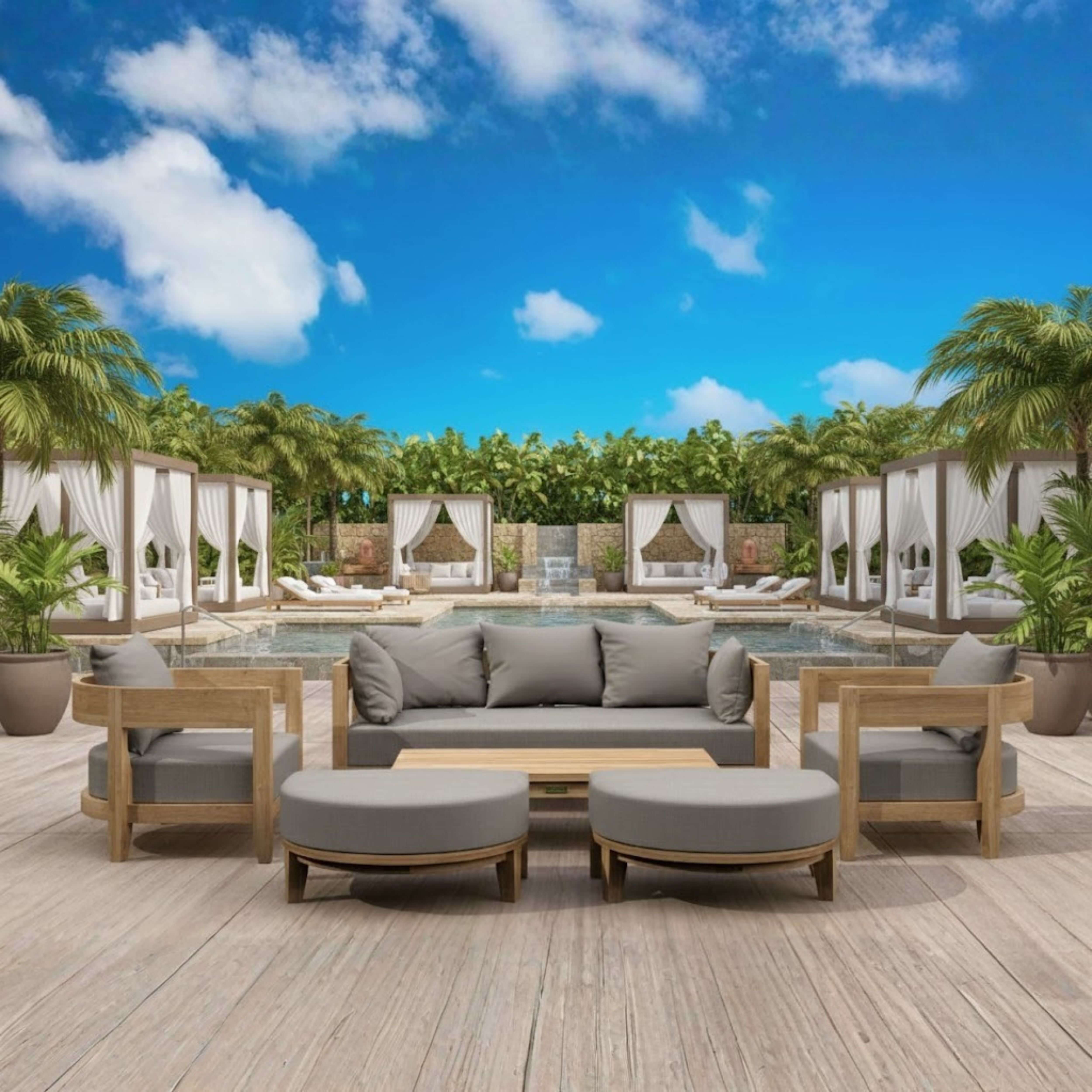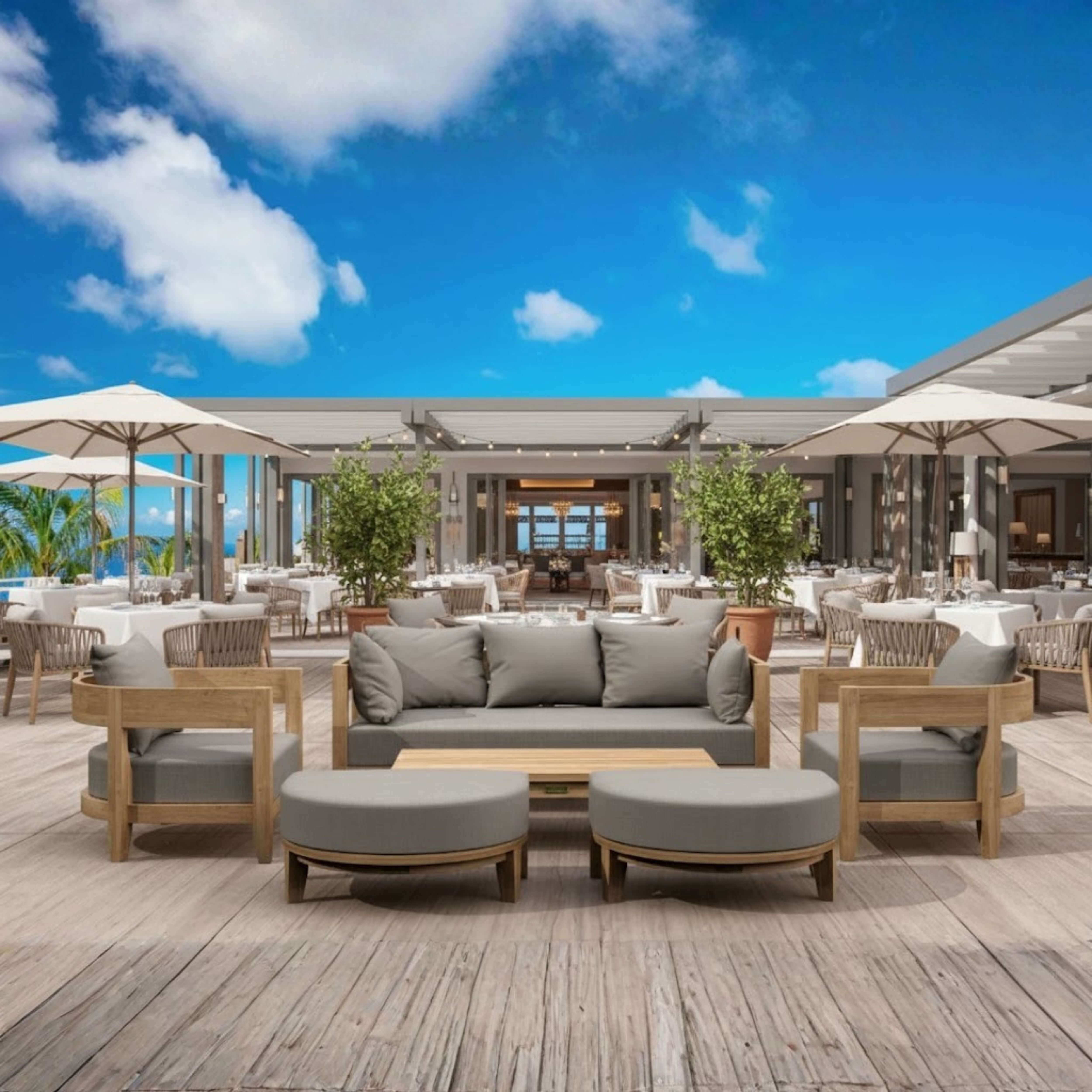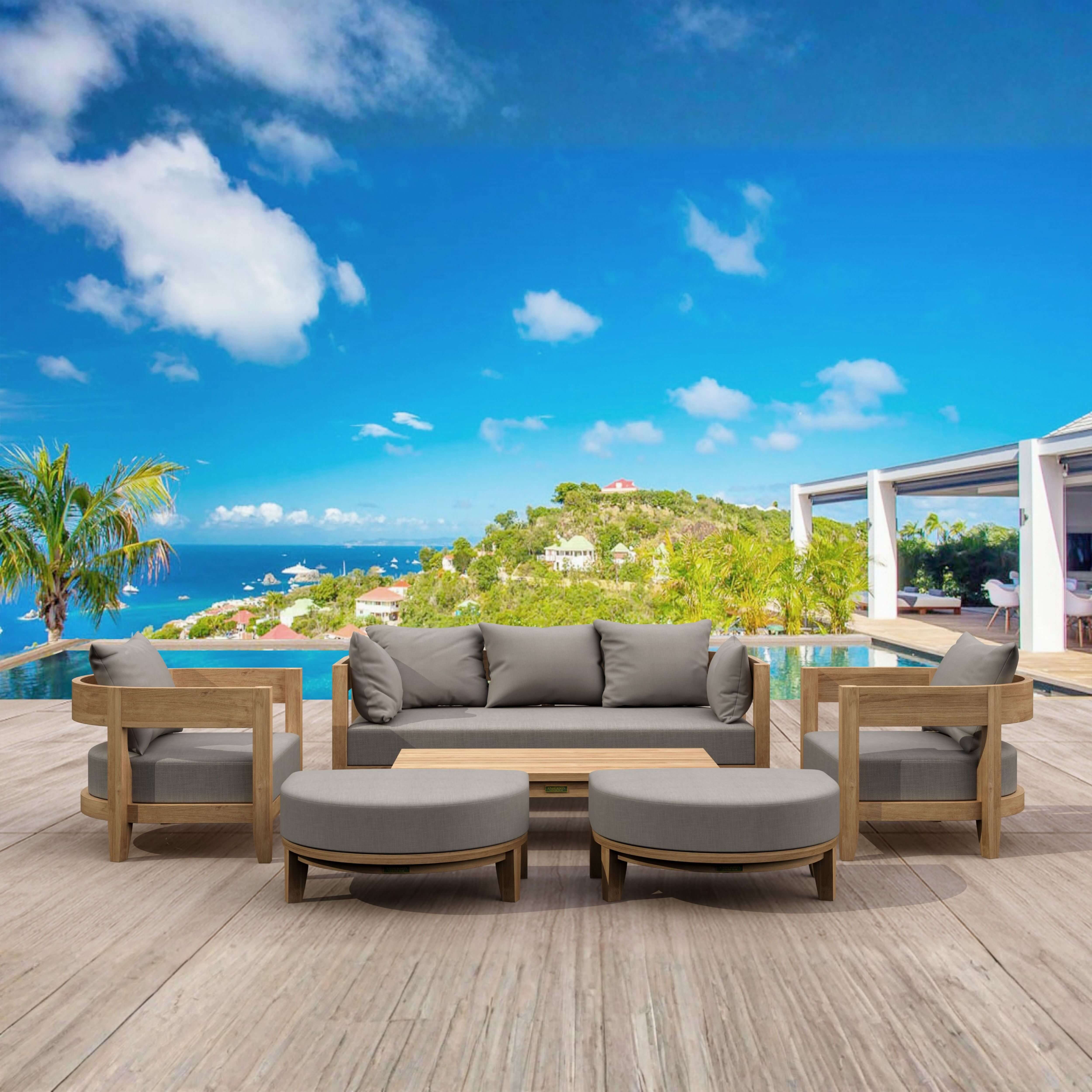 A spacious and quality built outdoor conversation set made of premium teak wood; gather round with family and friends with this