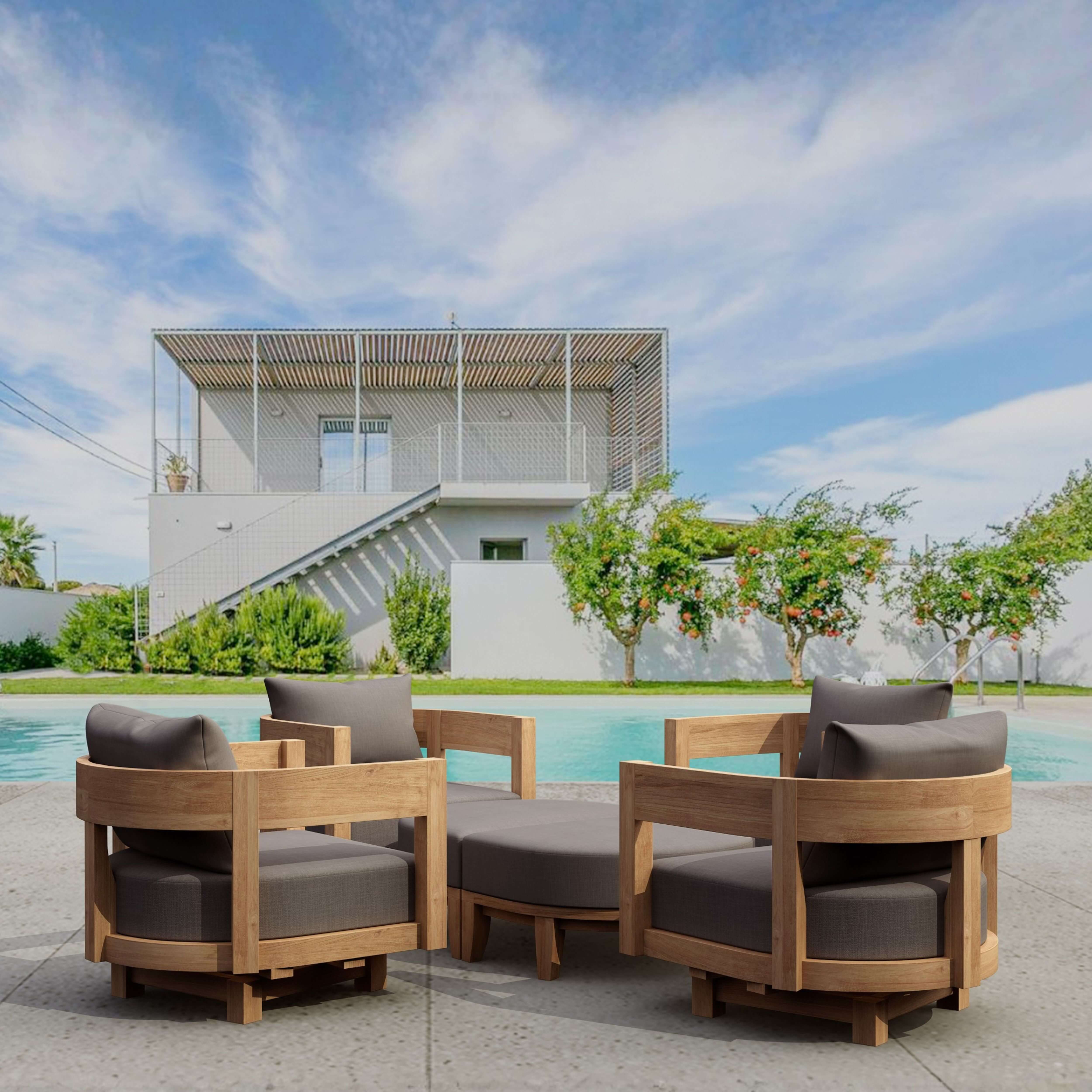 The perfect deep seating set for four, gather with family and friends with this 6-Piece Coronado Swivel Set from Anderson Teak. Comfortable and stylish, the swivel armchairs features a swivel mechanic that rotates up to 360 degrees of movement and remains firmly in place at any position. Also includes two matching Ottomans with 6” All-Weather Sunbrella Cushions of your color choice and pattern option. Made from premium grade teak wood sanded smooth for a natural finish, it’s the perfect material for weathering the outdoors.