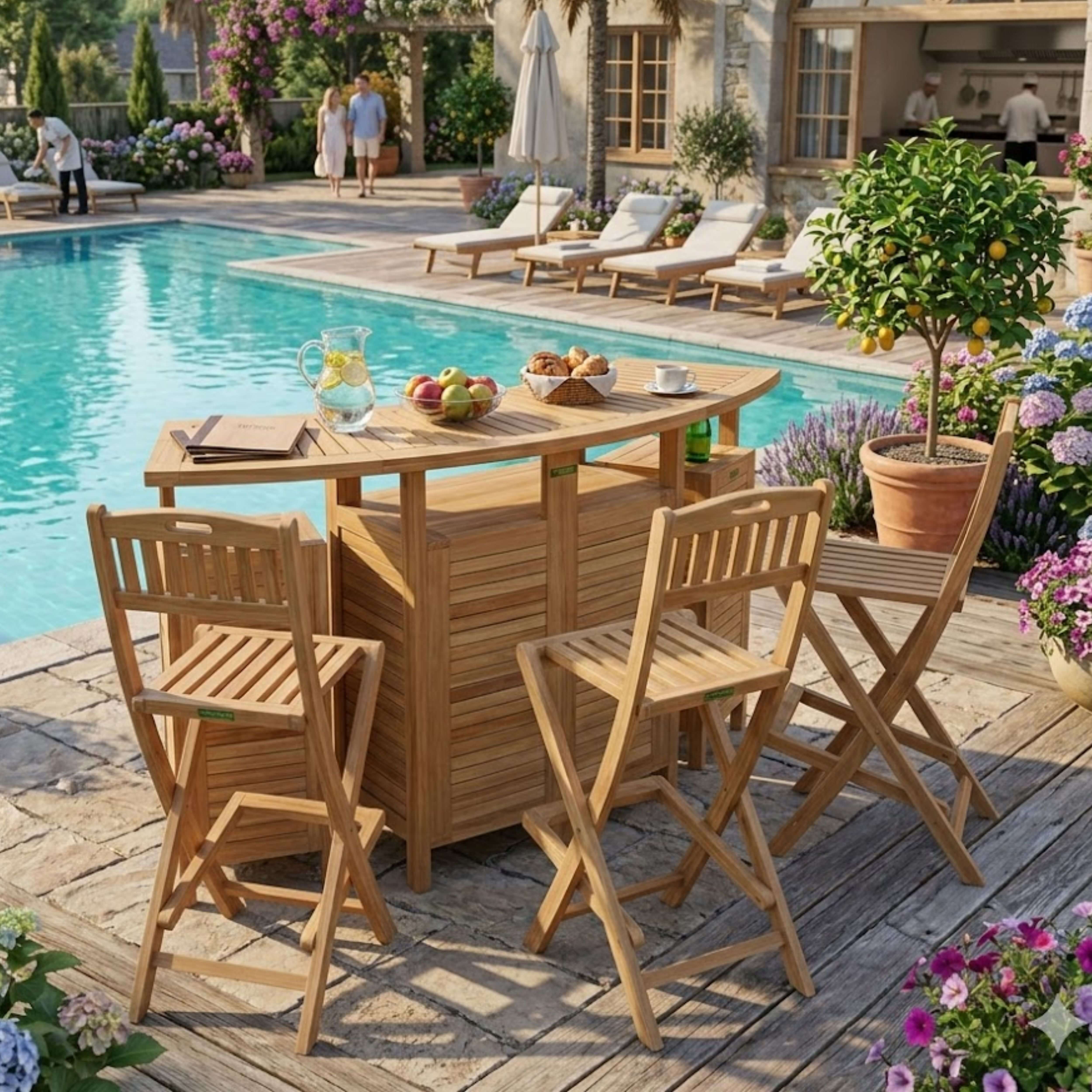 Our most sensational piece, the Altavista Folding Bar Set has been called by some people, “The most beautiful and unique bar table set ever seen.” Perfect for poolside bar table in the sun, its convenient folding table top are there for more friends to have around the table to drink. Just expand the table top by unfolding the top. When not in use, the table top and bar conveniently fold back into the table for easy storage and access.