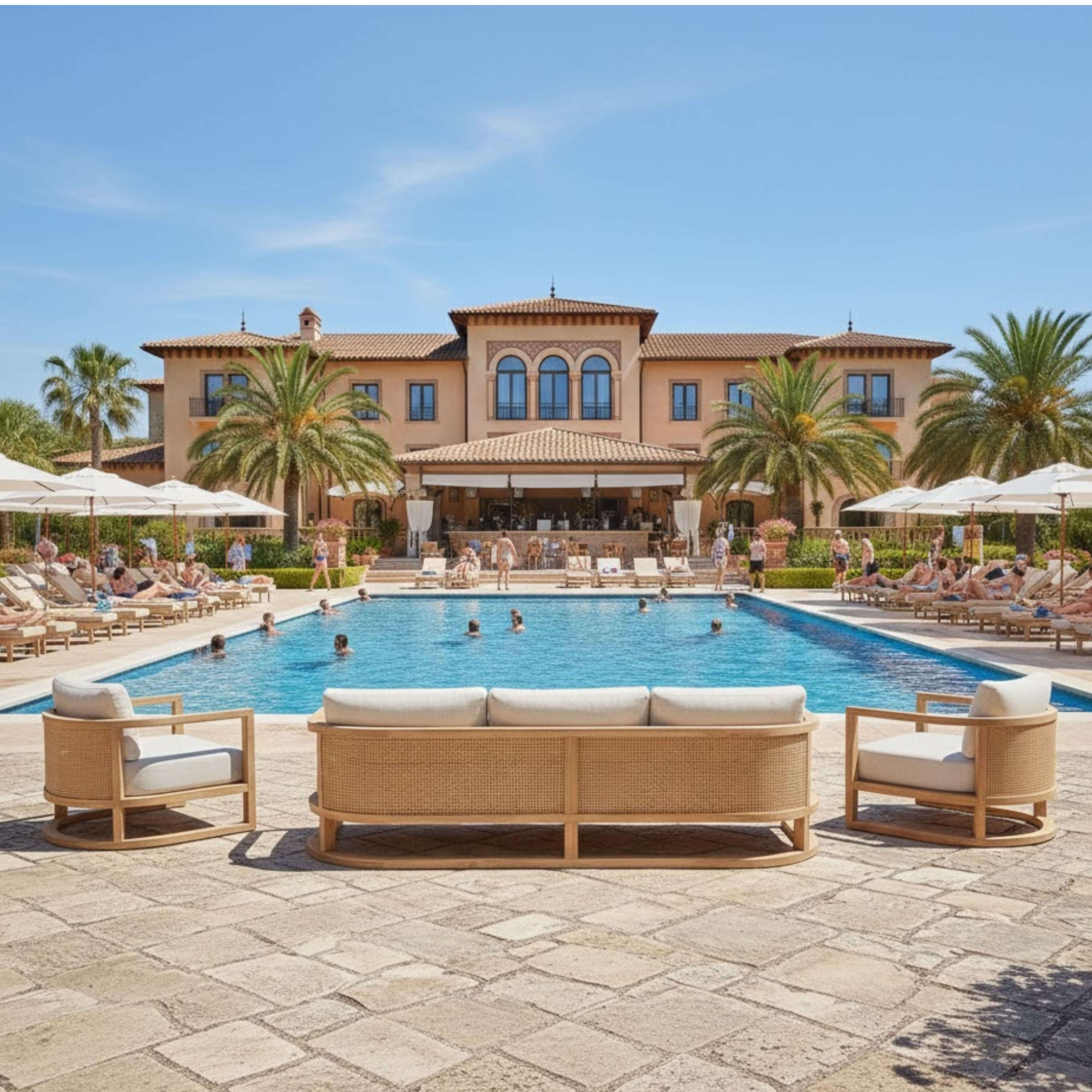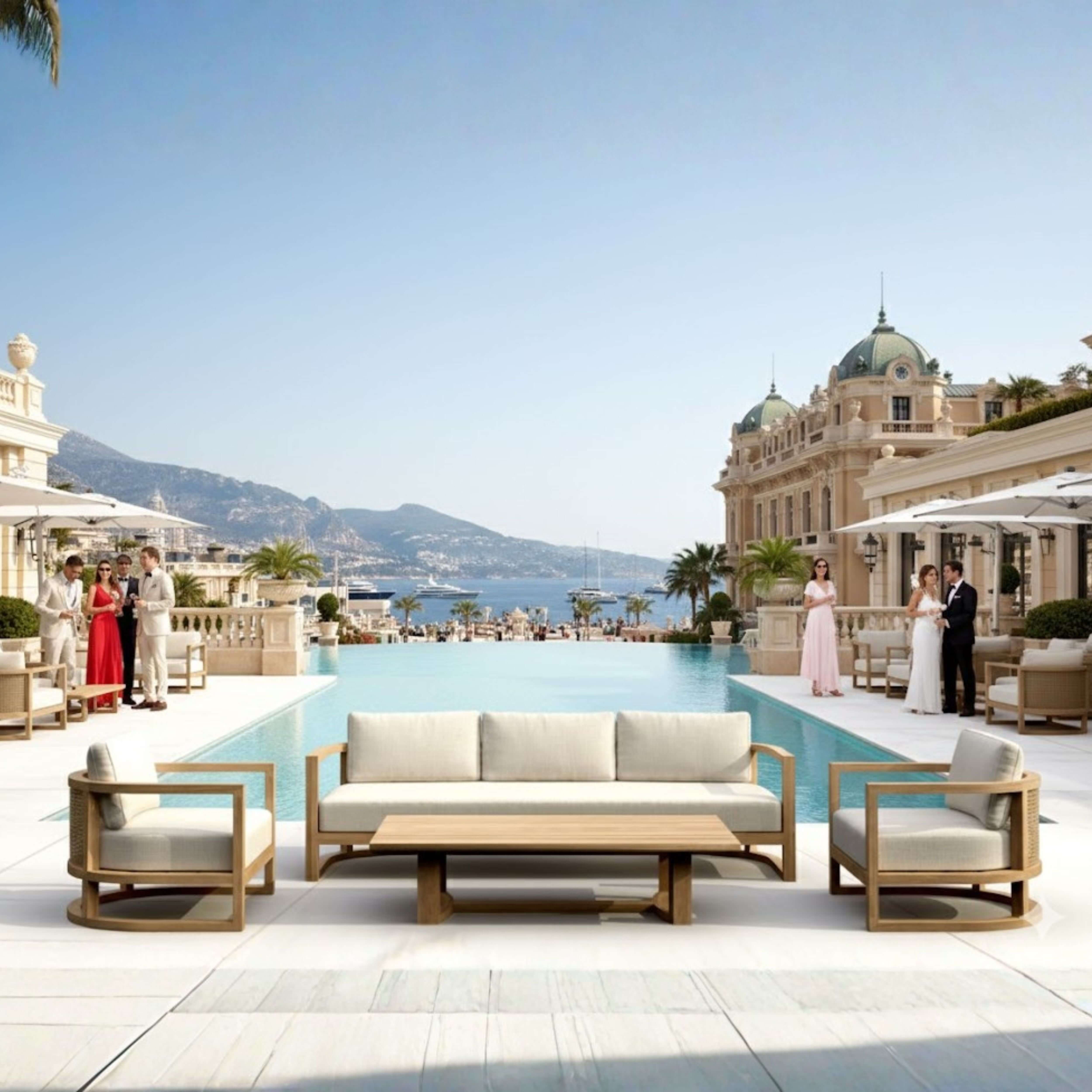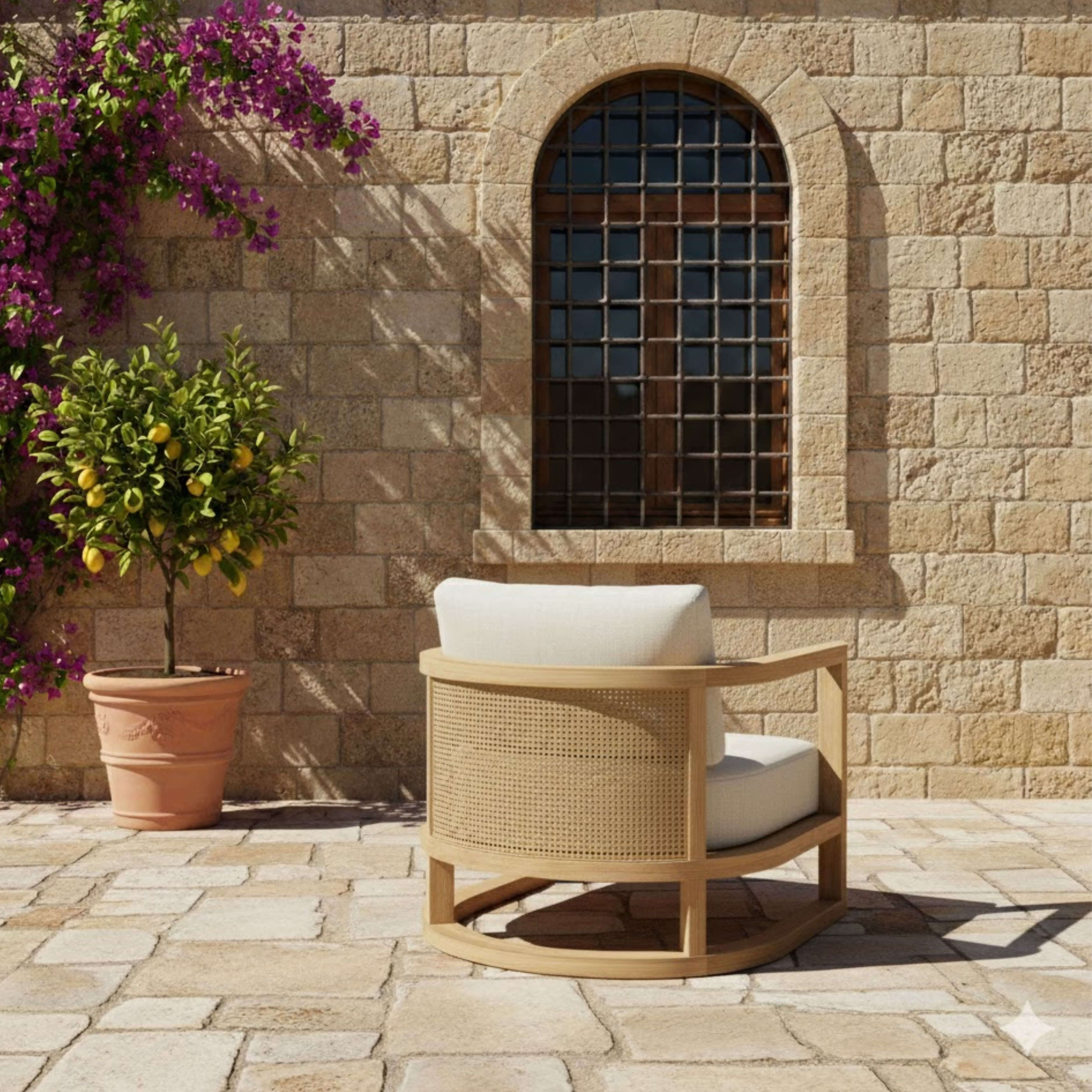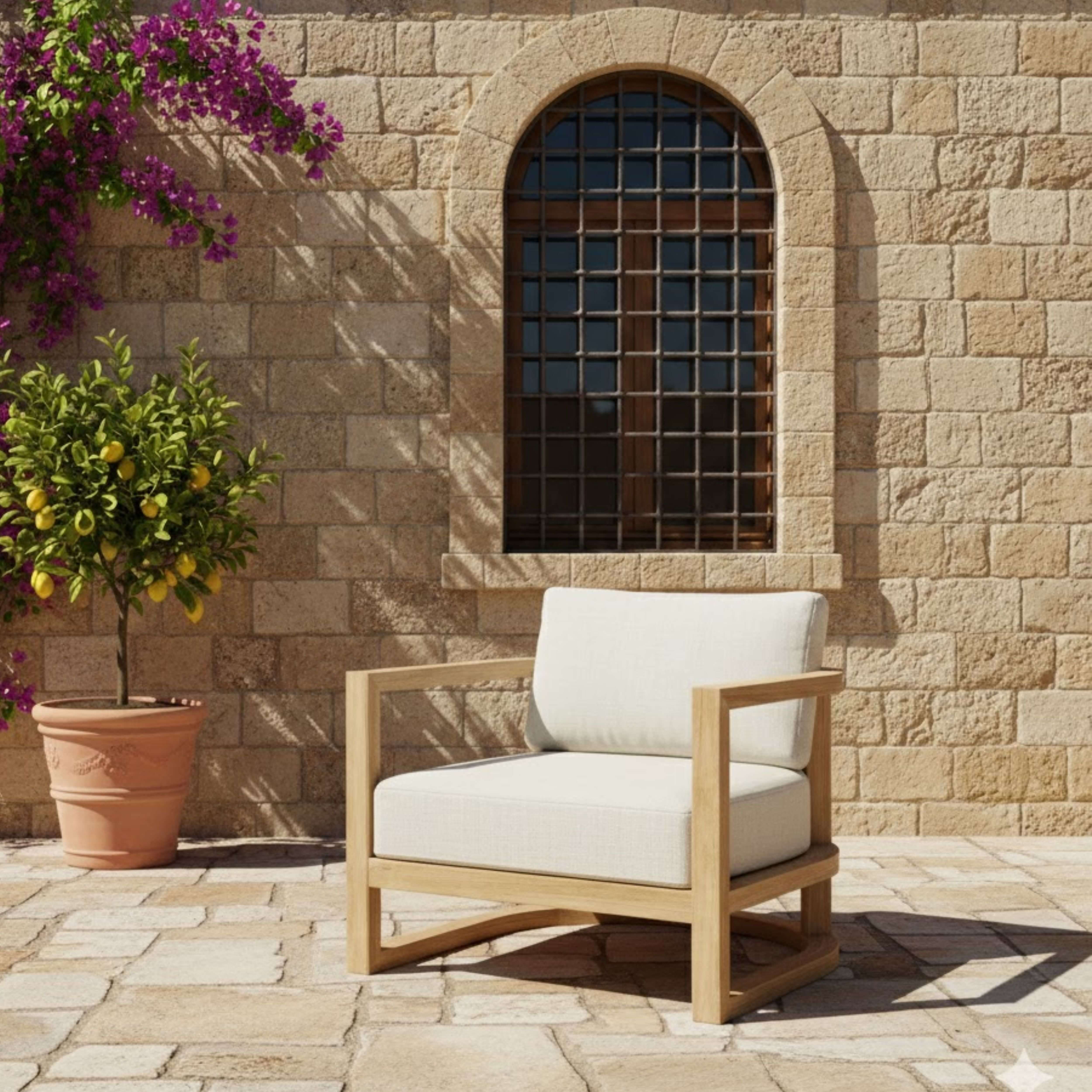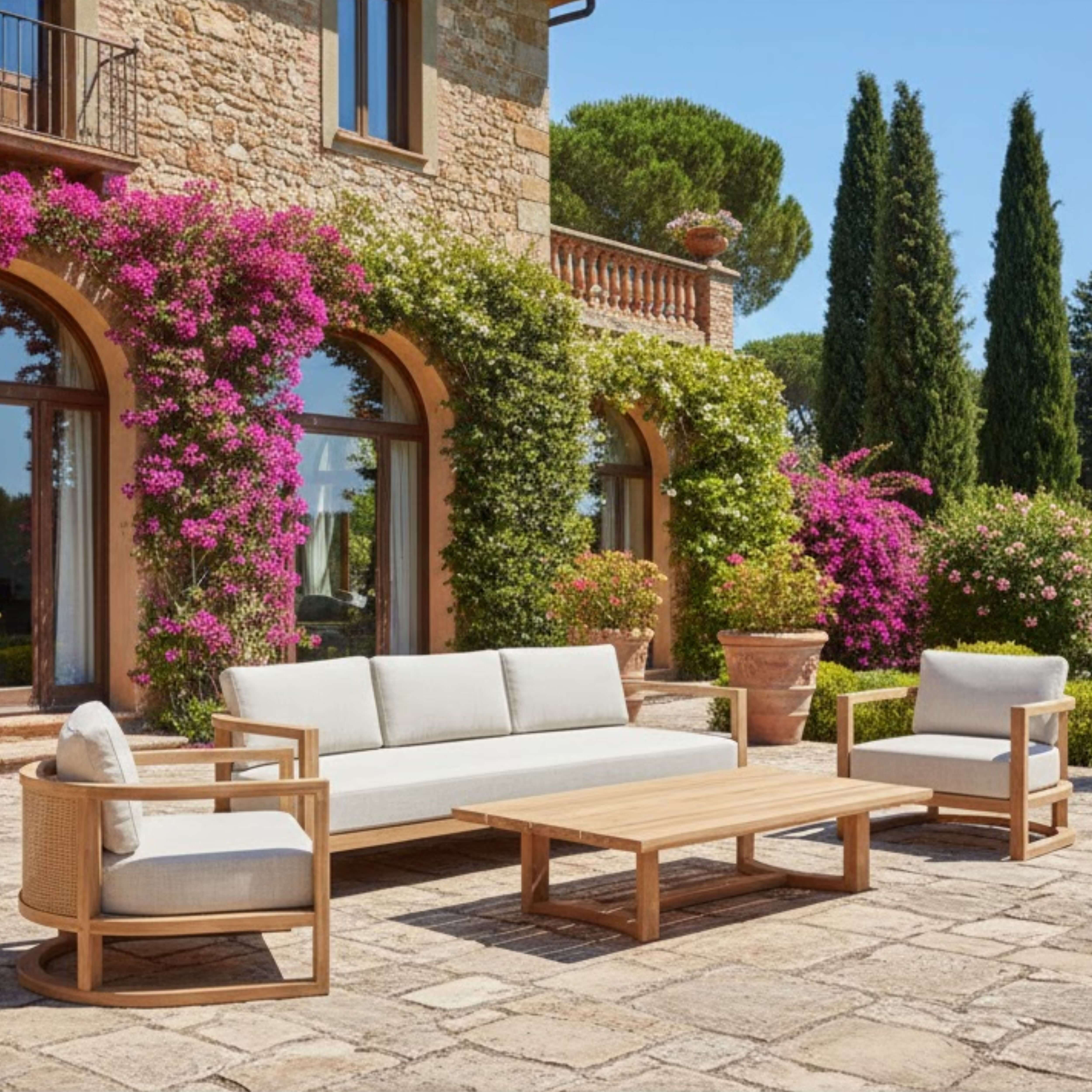 • Expertly Crafted teakwood with synthetic wicker & thick, cozy cushions for a luxurious feel.