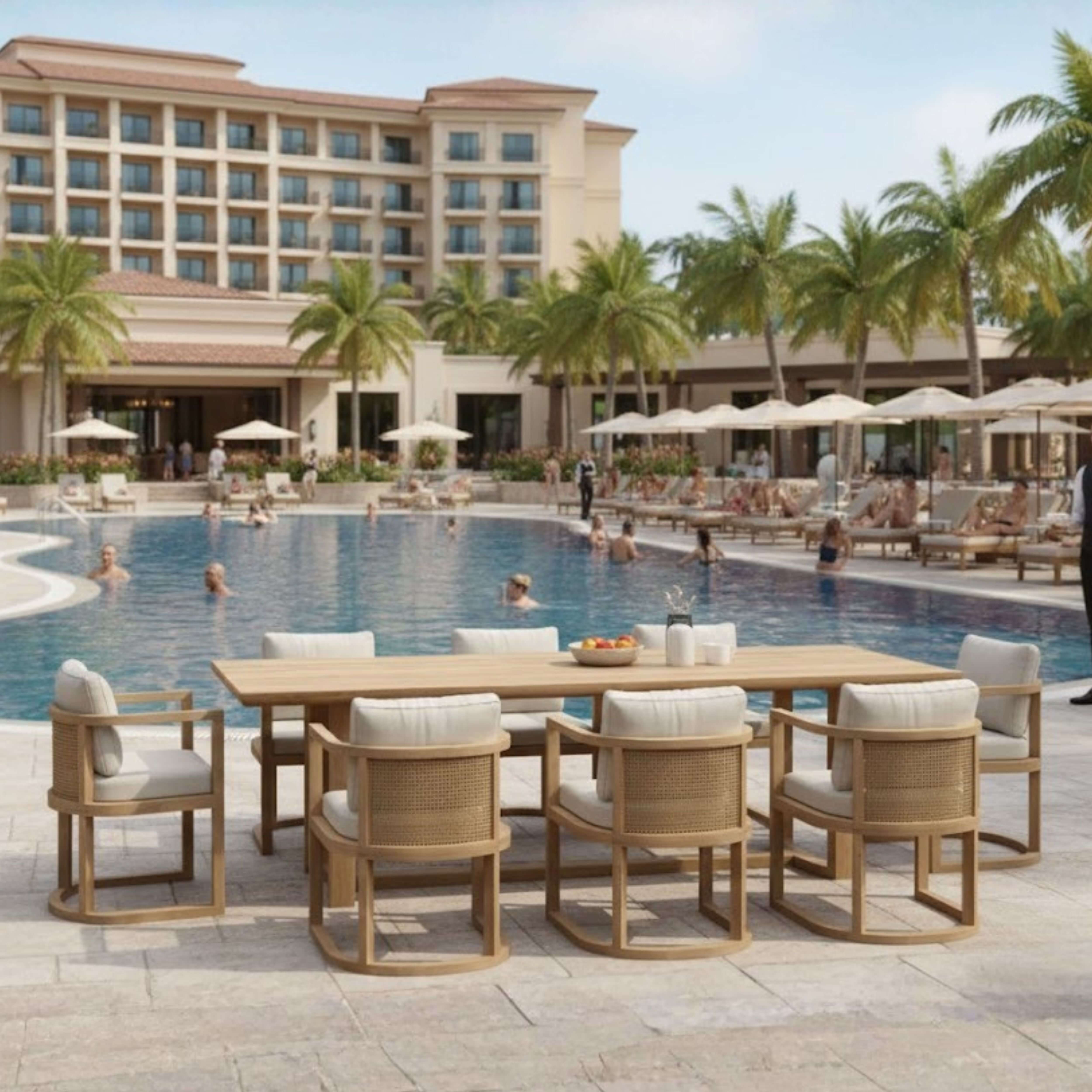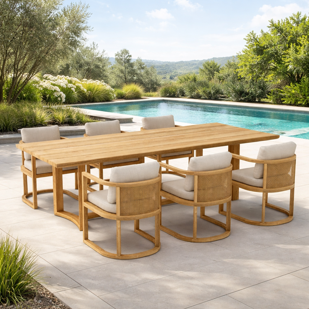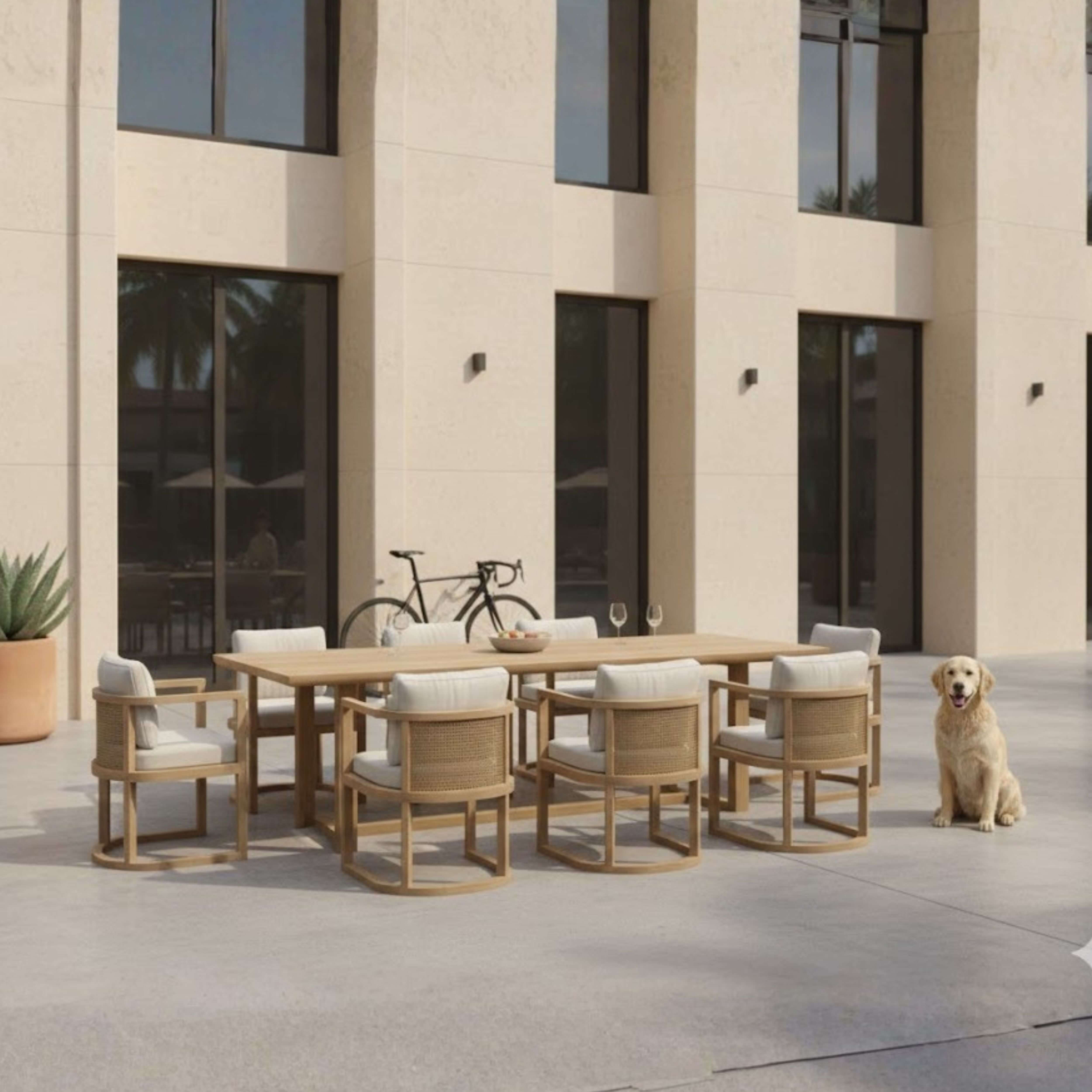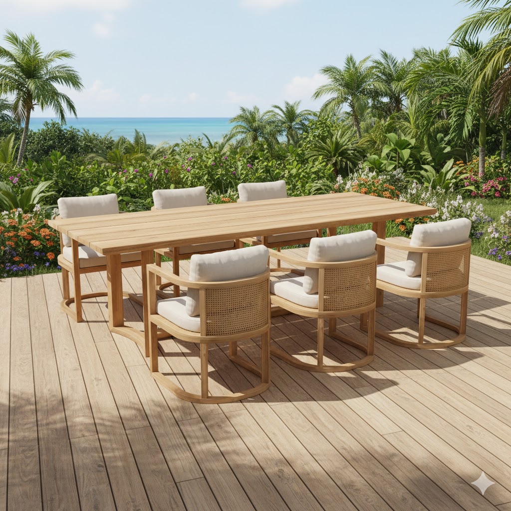 Enjoy the comforts of outdoor dining with the Junus Dining Table Set. Featuring One Junus Dining Table and Six Dining Armchairs it’s made of premium unfinished teak and synthetic wicker. The Junus Dining Table measuring 102" in wide by 39" in depth is a sturdy and well-built teak outdoor dining table for the home or yard. It fits six Junus Dining Armchairs, expertly crafted and shaped to exquisite design. Chairs include 2” thick Sunbrella Fabric Cushions and Pillow ensuring a relaxing and most comfortable dining experience.
