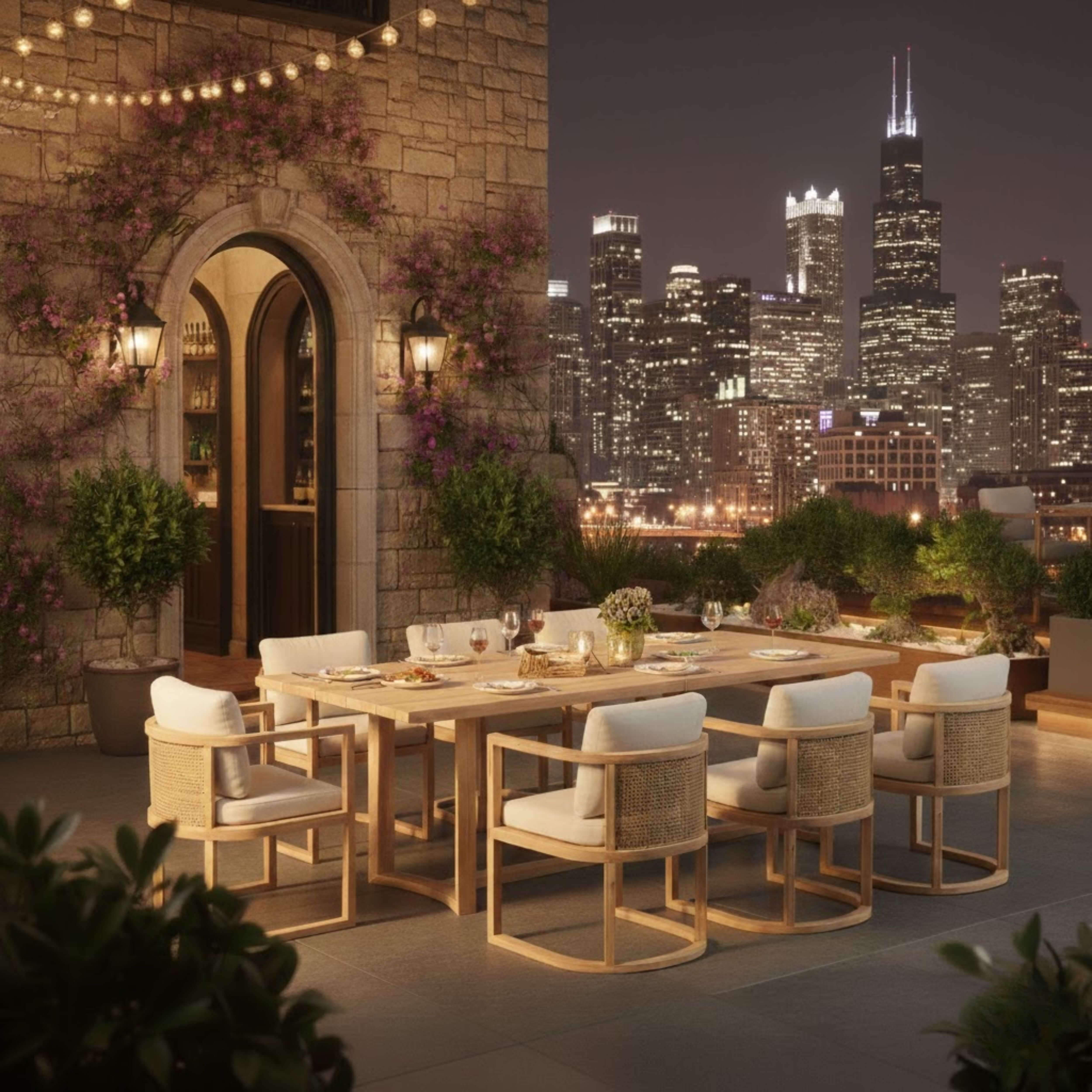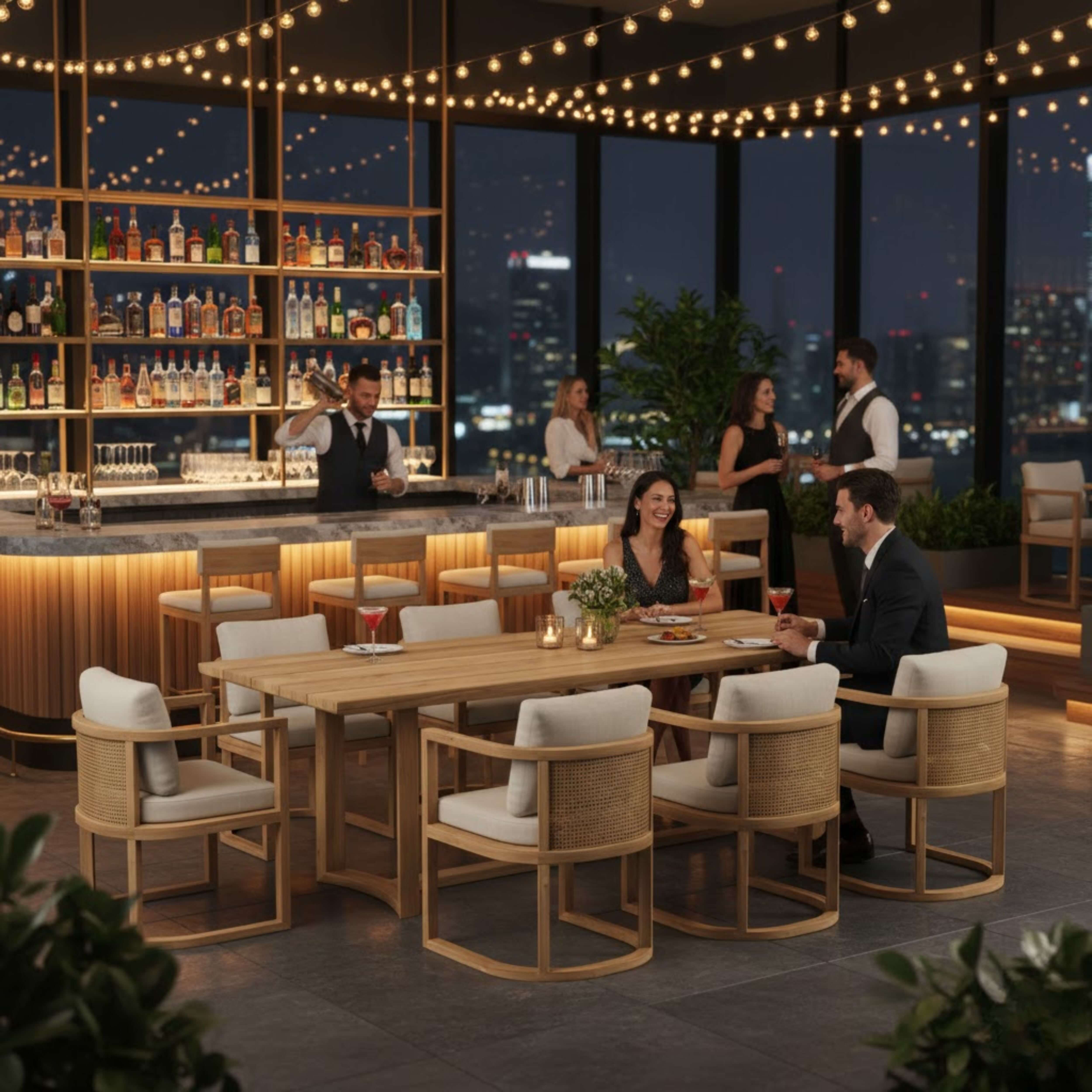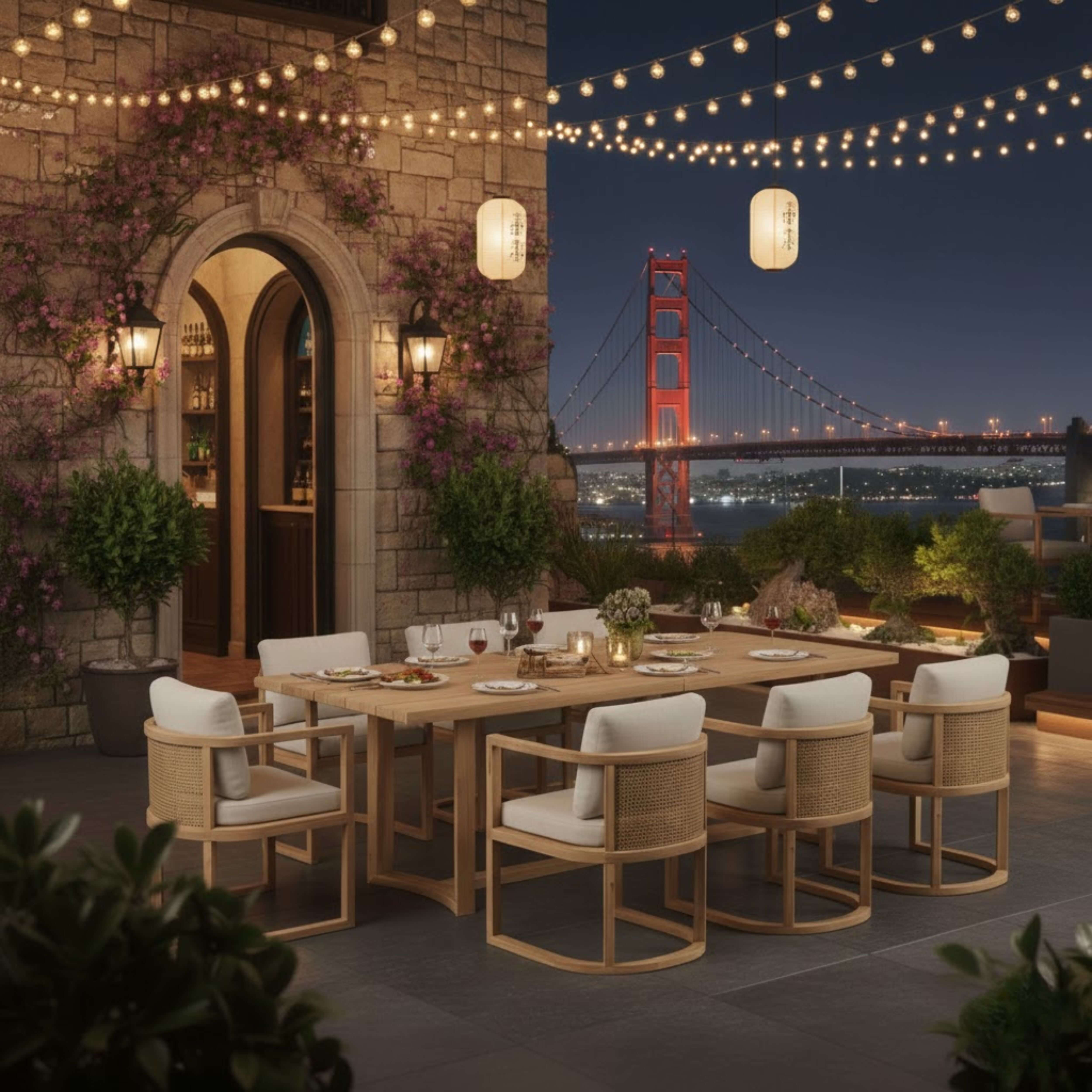 Enjoy the comforts of outdoor dining with the Junus Dining Table Set. Featuring One Junus Dining Table and Six Dining Armchairs it’s made of premium unfinished teak and synthetic wicker. The Junus Dining Table measuring 102" in wide by 39" in depth is a sturdy and well-built teak outdoor dining table for the home or yard. It fits six Junus Dining Armchairs, expertly crafted and shaped to exquisite design. Chairs include 2” thick Sunbrella Fabric Cushions and Pillow ensuring a relaxing and most comfortable dining experience.