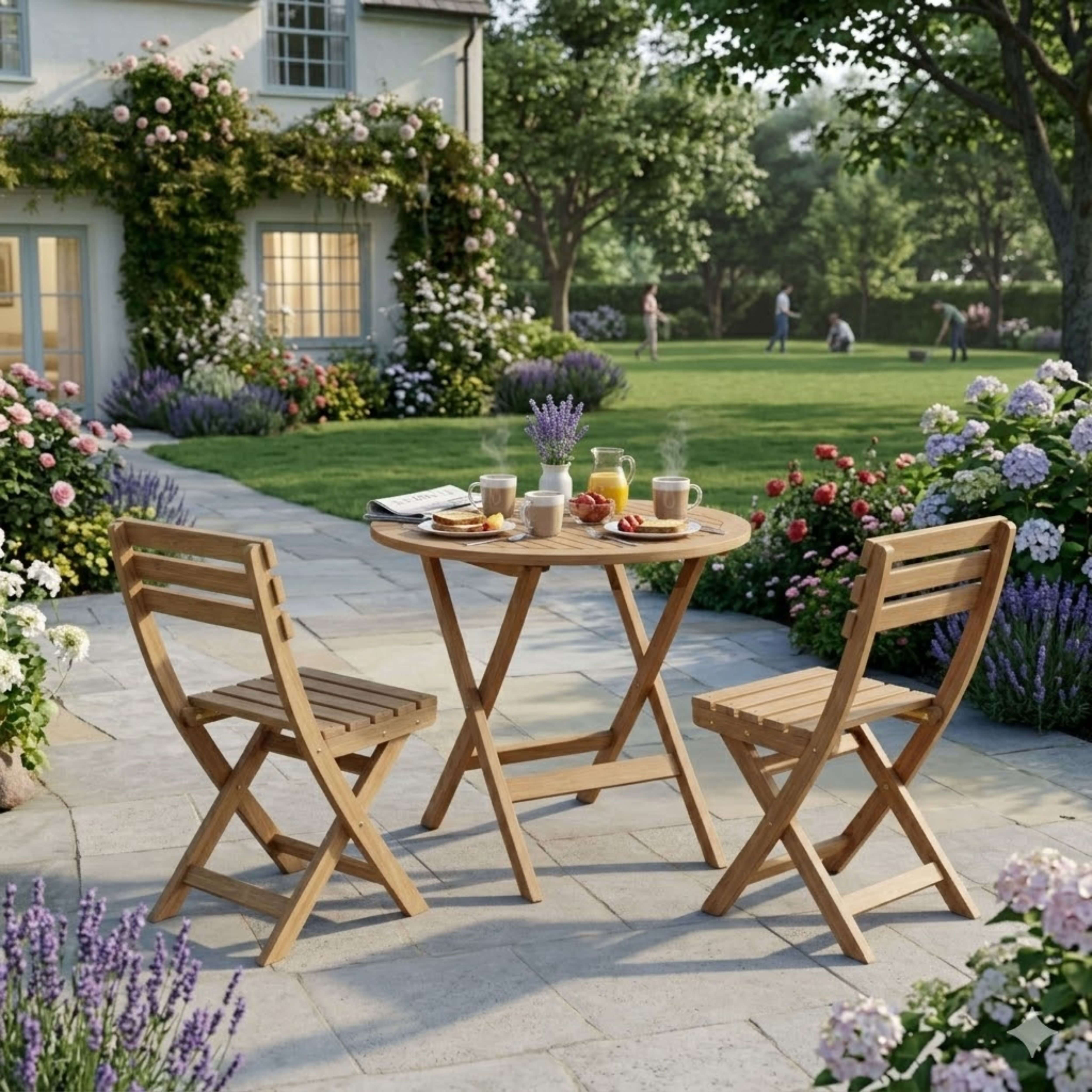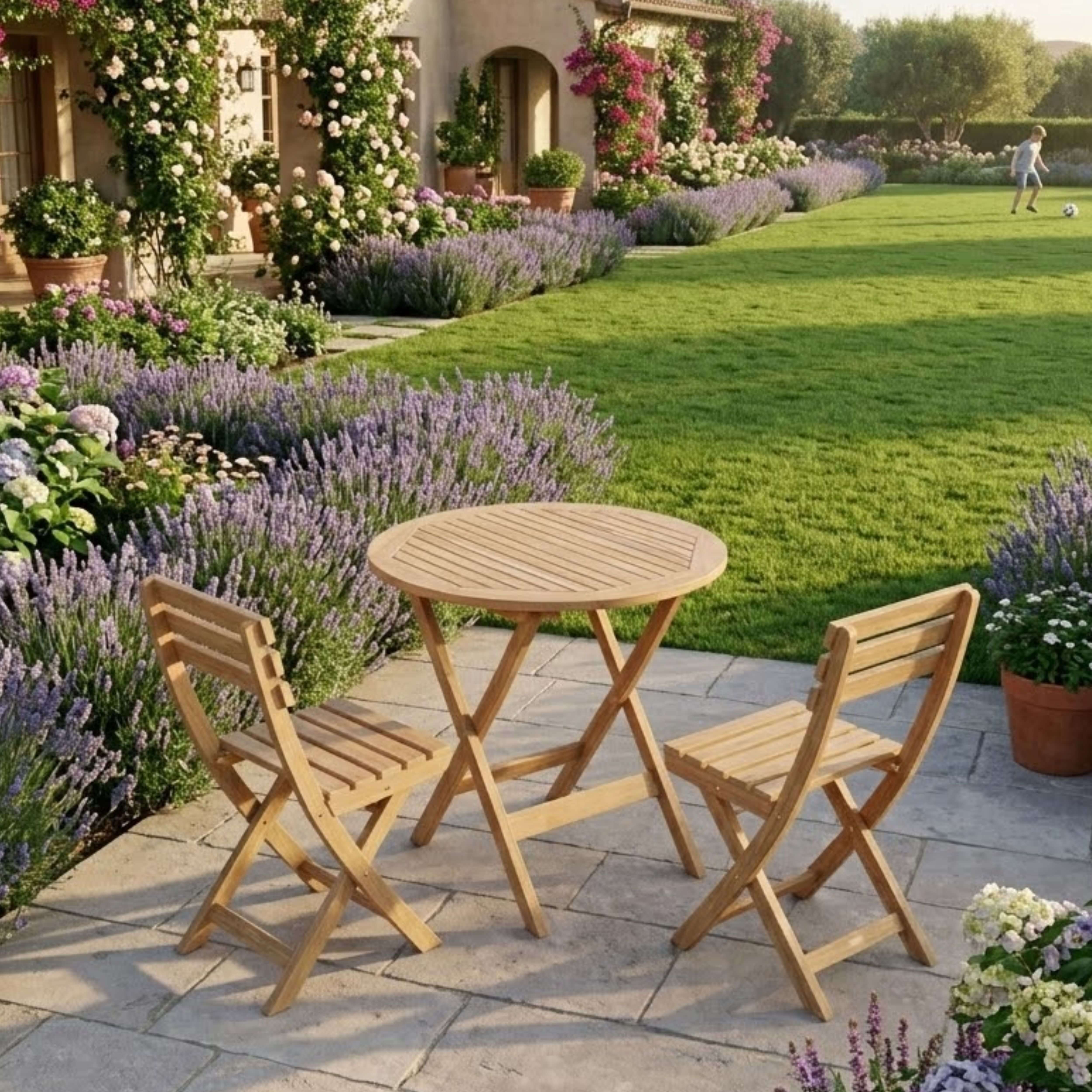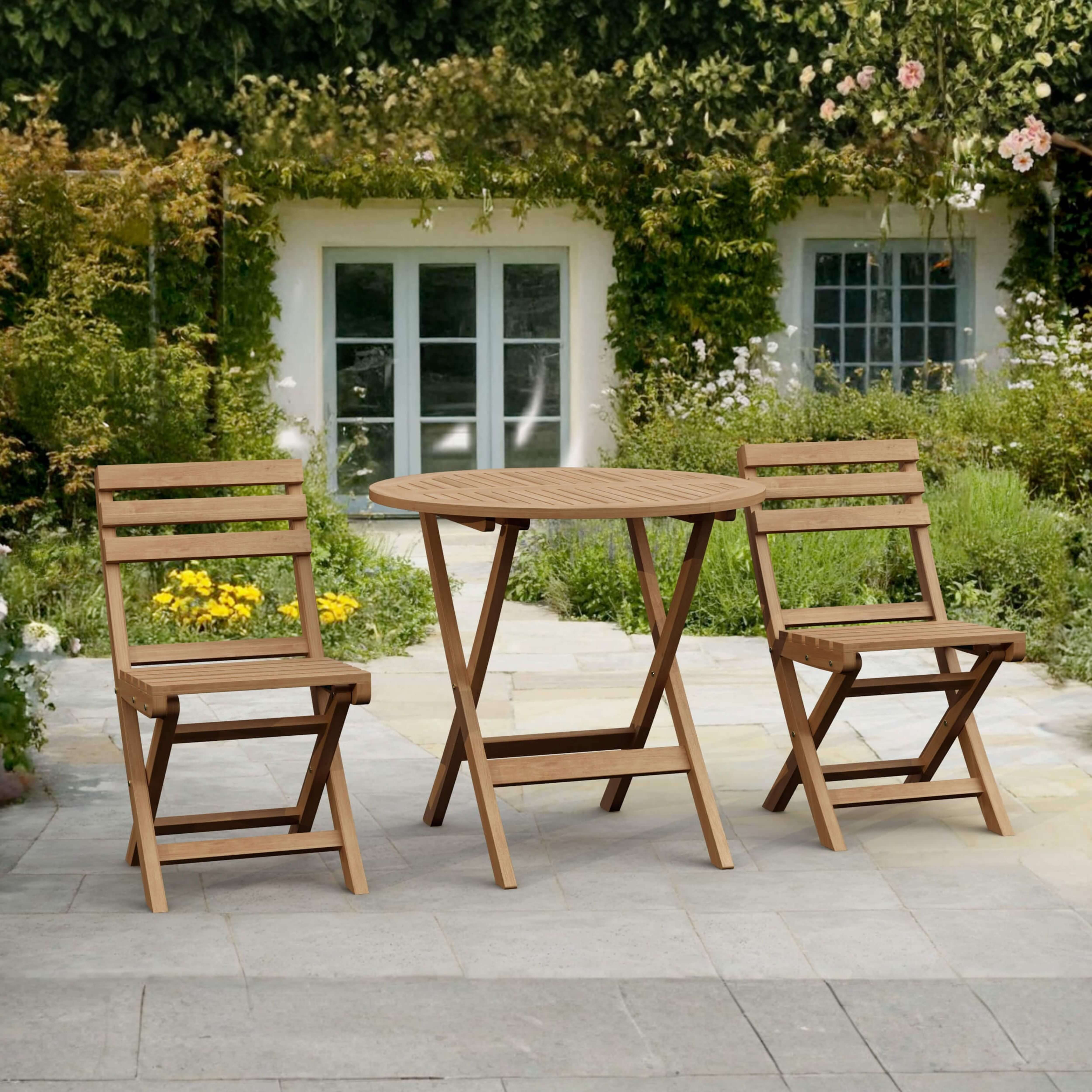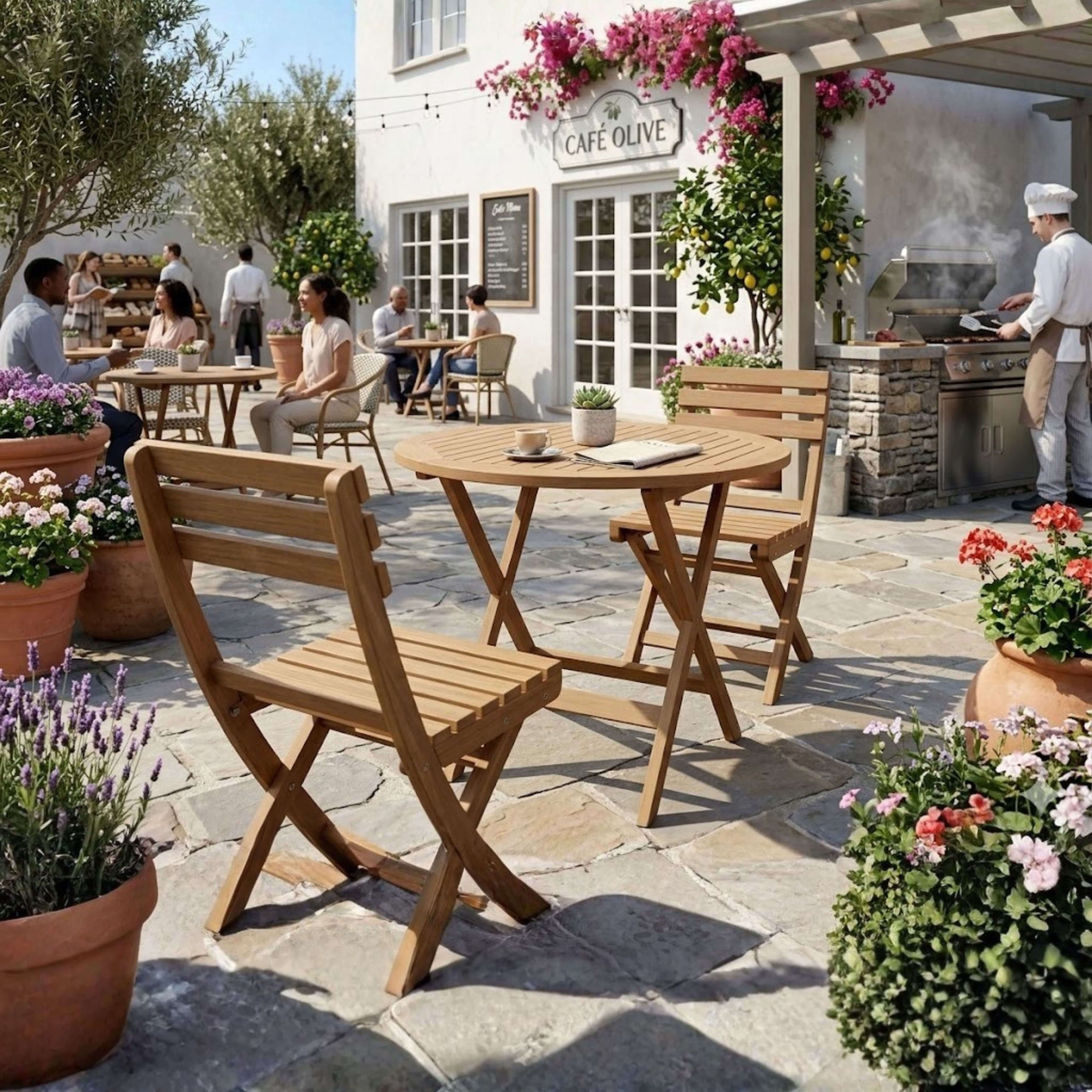 The Chester Alabama Bistro Set features an easy fold table which great for portability and storage. Easy to carry and is designed with handle which can be fold completely flat. This feature enables many chairs to fold and stack together when not in use. Made from solid teak wood coated in a water-based sealer, it provides added weather protection from the outdoor elements of rain, hail, and shine. It is perfect for boating, restaurant, and café where space is limited or the chairs are only required occasionally. Add Sunbrella cushions for more comfort and enjoy the rest of the meal time with your family or friends. Quality built for generations.