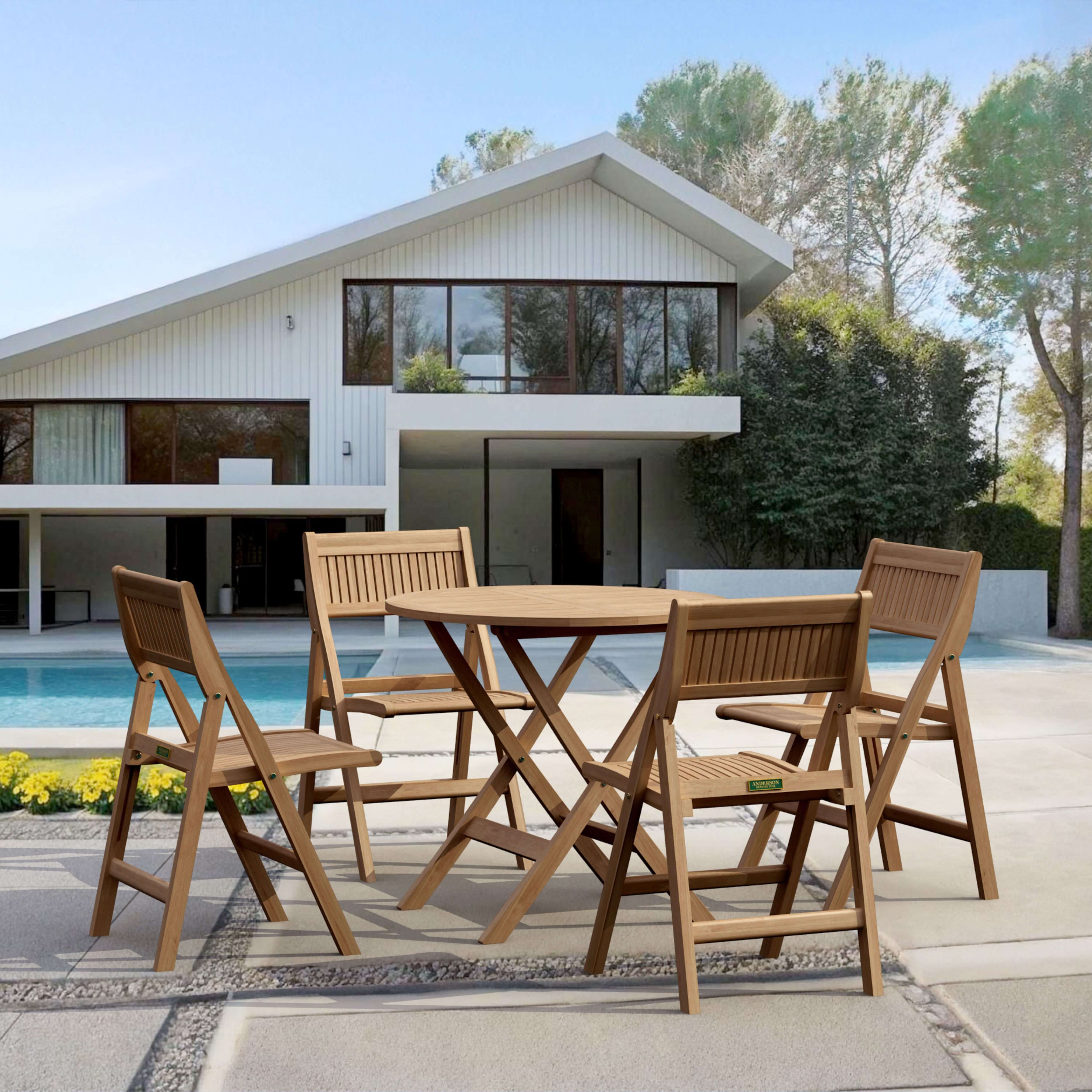This Windsor 31″ Round Folding Table Set features an easy fold design great for portability and storage. With an easy to carry design and handle, the table and chairs can also be folded completely flat, enabling many chairs to fold and stack together when not in use. It is perfect for boating, restaurant use and café; where space is limited and where chairs are only required occasionally. Made from Solid Teak Wood, it is the perfect material for weathering the outdoors. Add All-Weather Sunbrella cushions for added comfort with the color of your choice.
