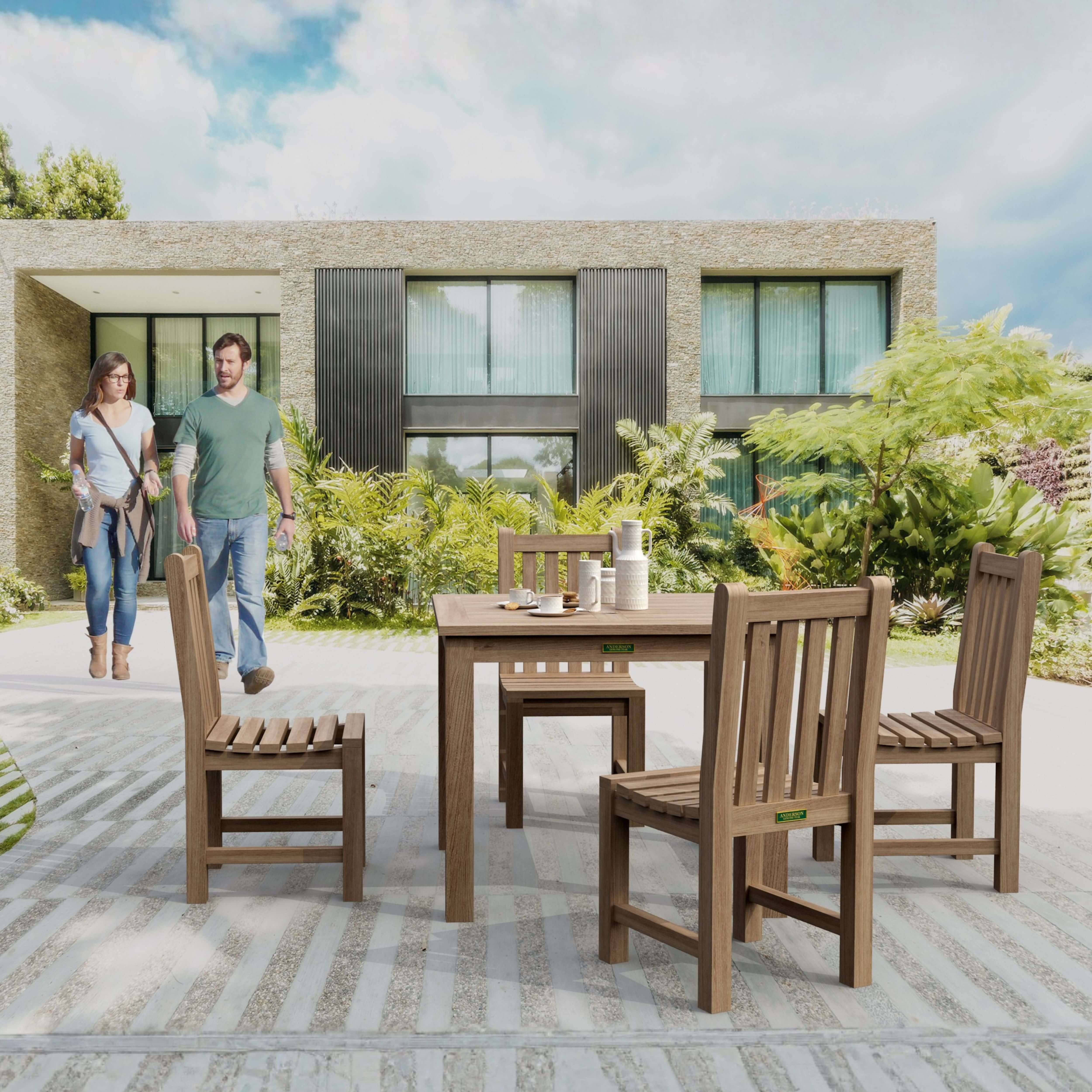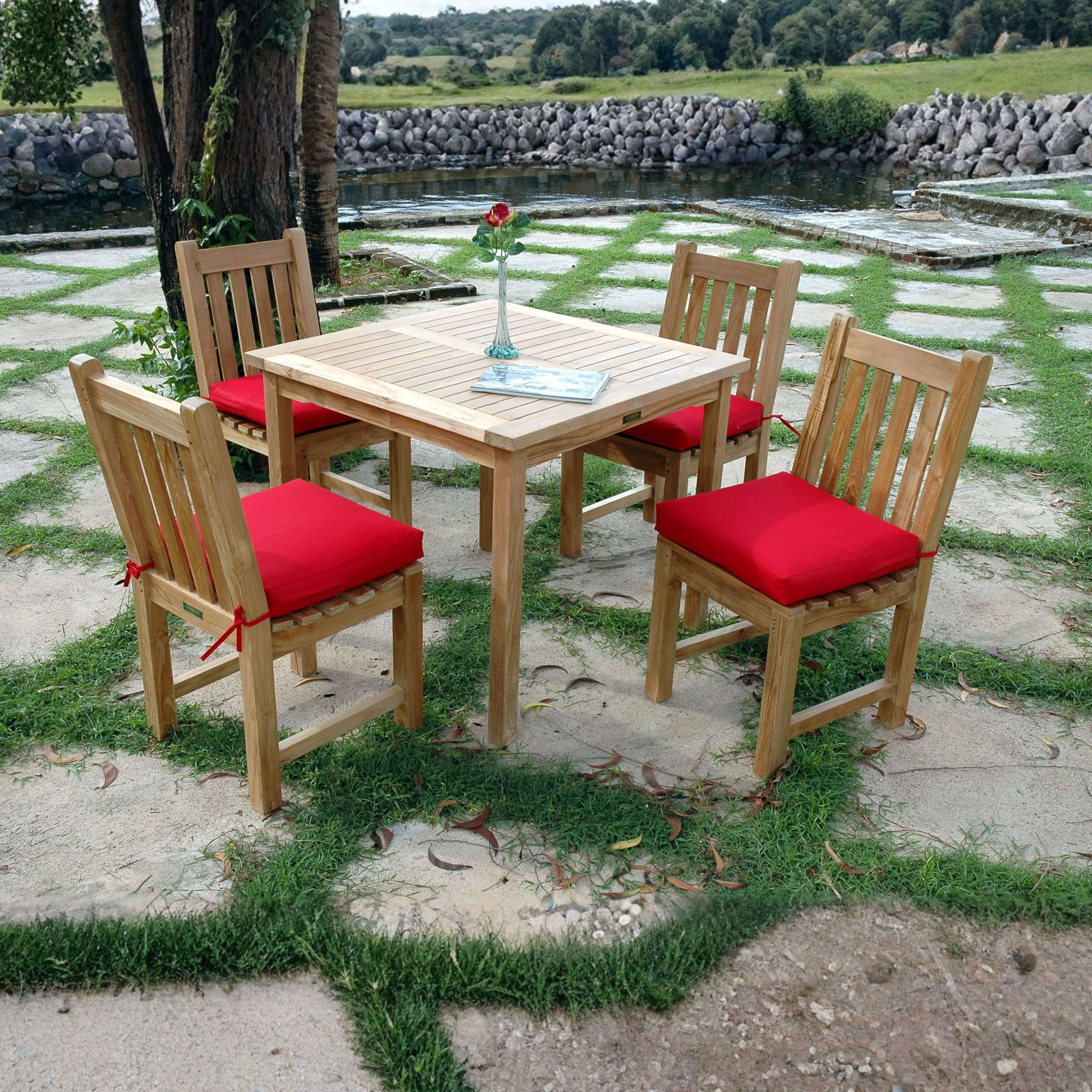 Enjoy the beauty of your yard and the pleasure of outdoor dining with the Bahama Dining Table and Classic Dining Chair. This set includes a 35″ square table that sits four people comfortably. Table and chairs are designed using mortise and tenon construction for strength and durability. Made from plantation grown teak, the wood is sanded smooth without any finish in its natural form and color. This set will provide decades of enjoyment for family and friends and is built with the thickness of quality and size. Add All-Weather Sunbrella cushions for added comfort at your choice of colors. Cushions sold separately.