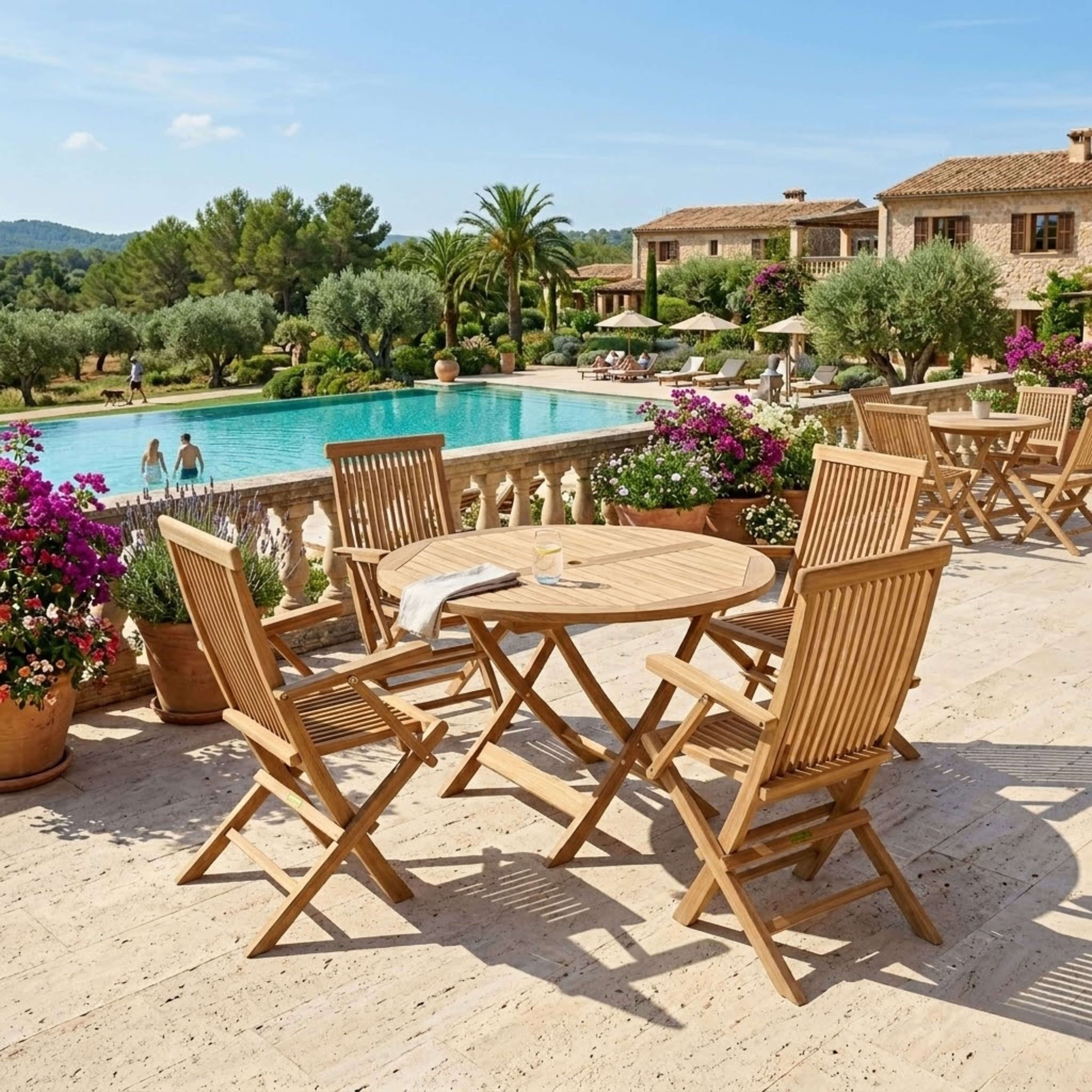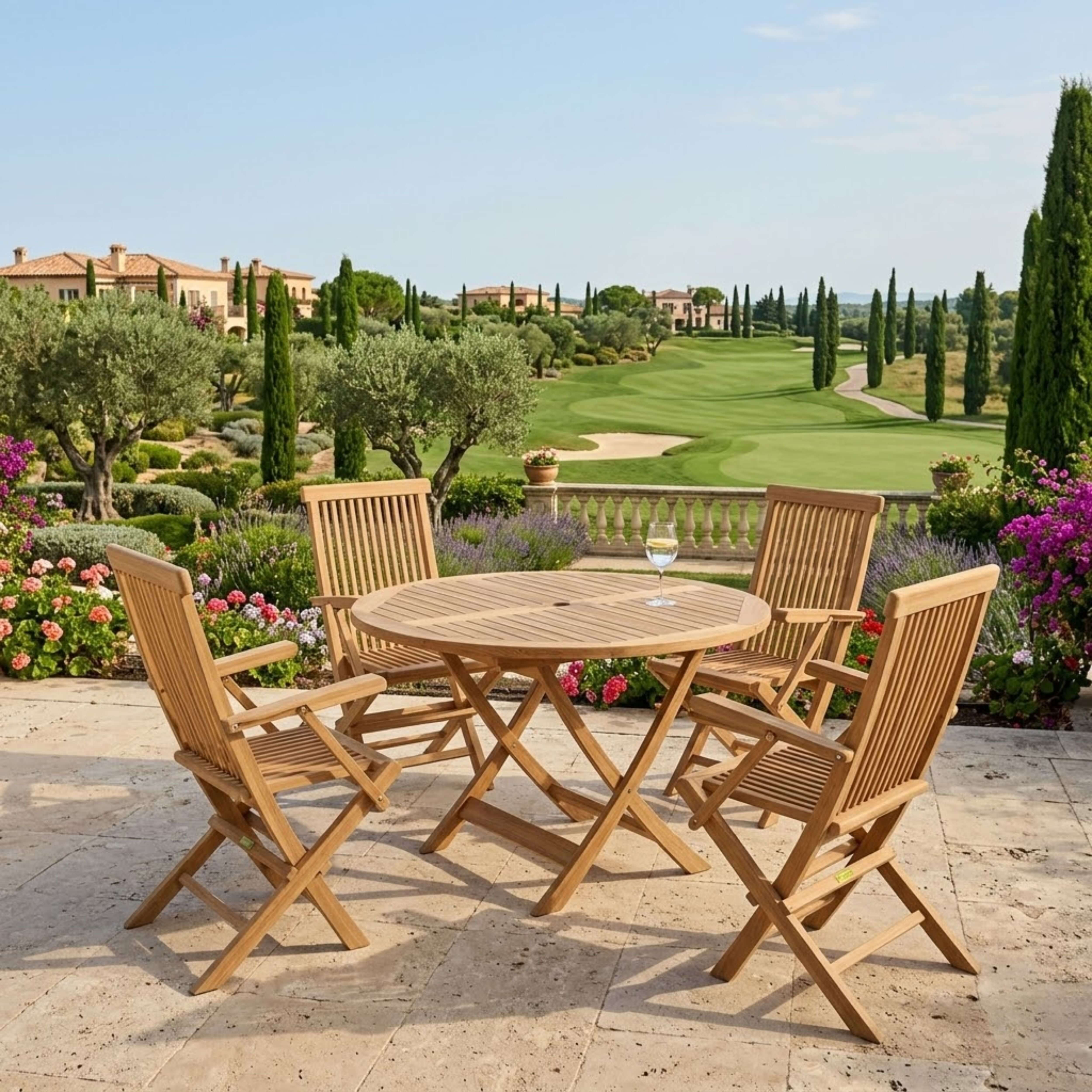 The folding table & folding chair in beautiful unfinished natural teak. This simple, lovely table & chair offers pleasure and comfort with each use. Additional all weather cushions from Sunbrella can be applied for extra comfort.