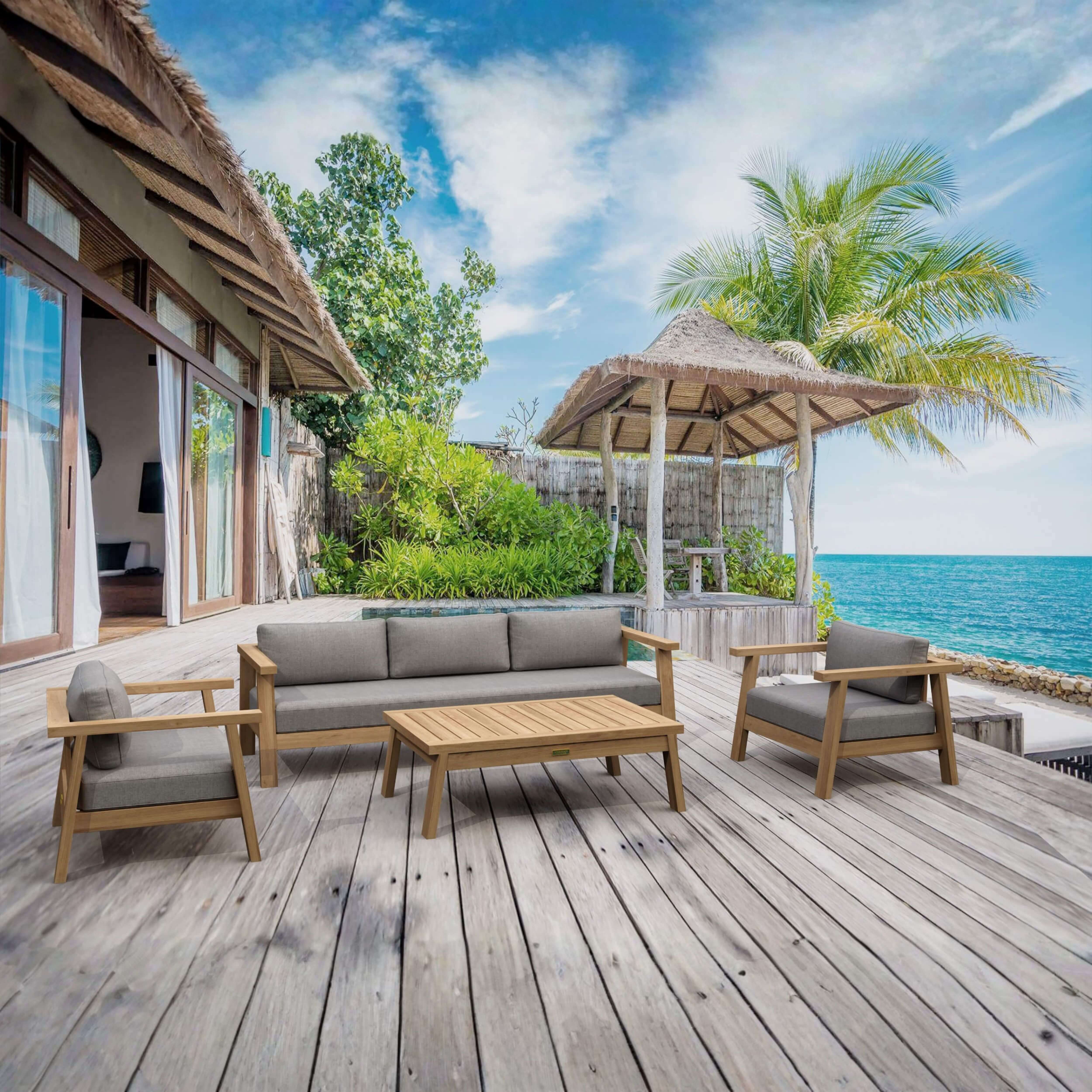An outdoor deep seating set constructed of premium grade teak; it’s the perfect set to enjoy cool outdoor evenings with family and friends. Featuring the Palermo Deep Seating Sofa, two Palermo Armchairs and one Palermo Rectangular Coffee Table, this set which seats up to five is a sturdy and quality-built piece of craftsmanship, yet comfortable and relaxing to sit on. Straight bold lines coupled with slanted angled legs gives this piece a modern look – yet still retains traces of traditional design elements. Featuring 6″ deep seating cushions from All-Weather Sunbrella Fabrics, it arrives with choice of color and pattern options.