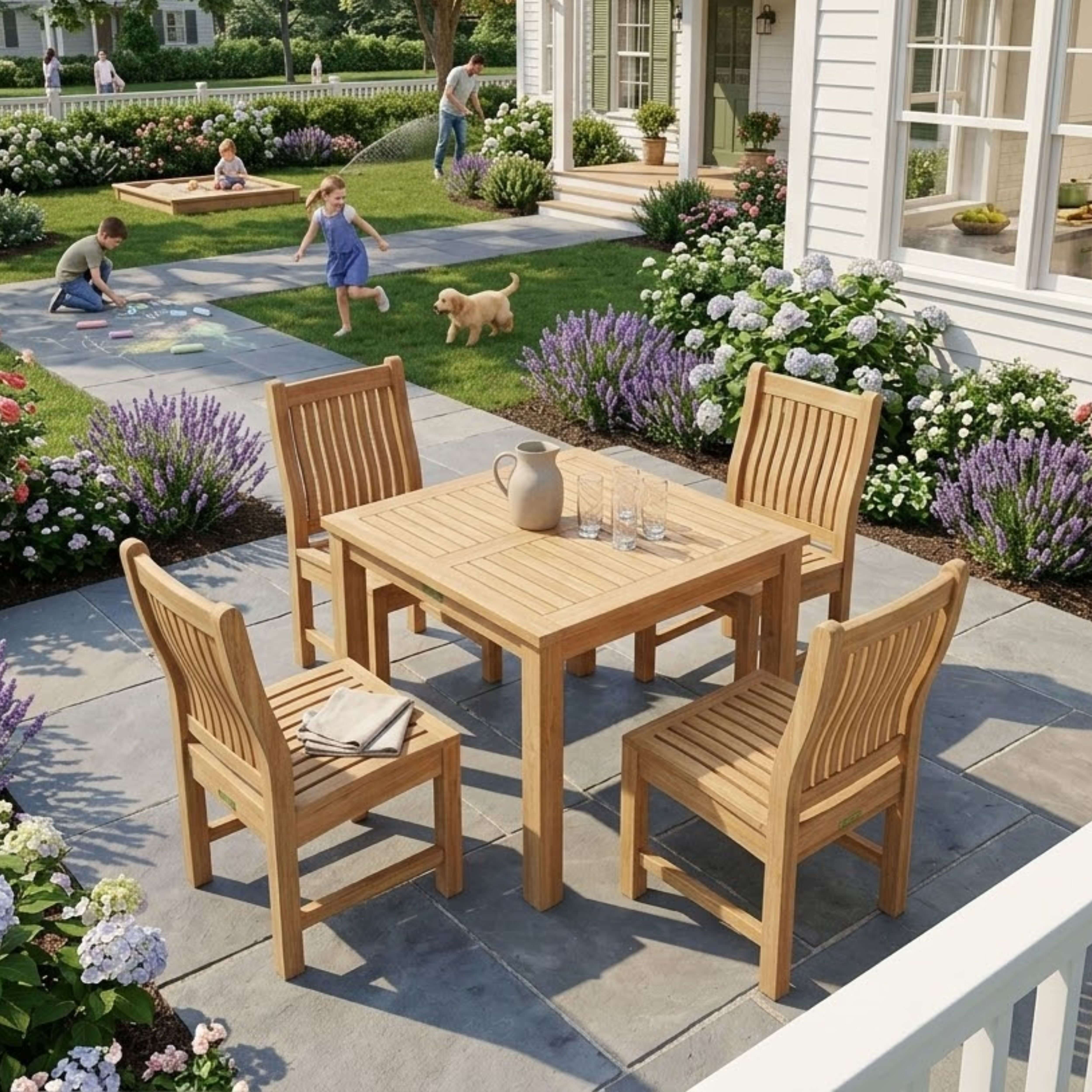 Enjoy the beauty of your backyard and the pleasure of the outdoor dining with Bahama Dining Table and Sahara Dining Chairs. This set includes a 35″ square table that fit for 4 people comfortably. Table and chairs are all constructed using mortise and tenon construction for strength and durability. The outdoor furniture made of premium quality plantation grown teak. This set will provide decades of enjoyment for family and friends. Add all weather Sunbrella cushions for more comfort at your choice of colors. Cushions are sold separately.