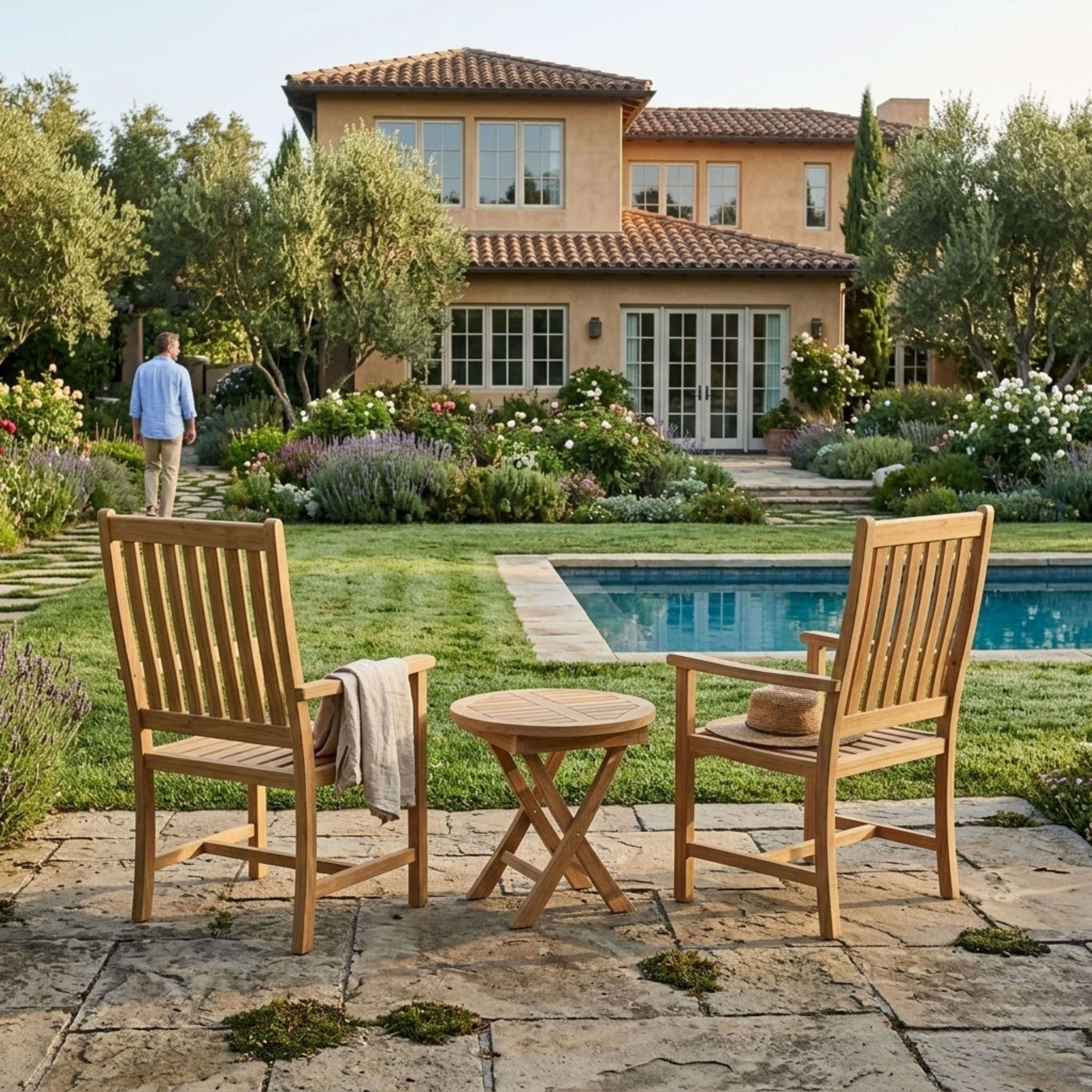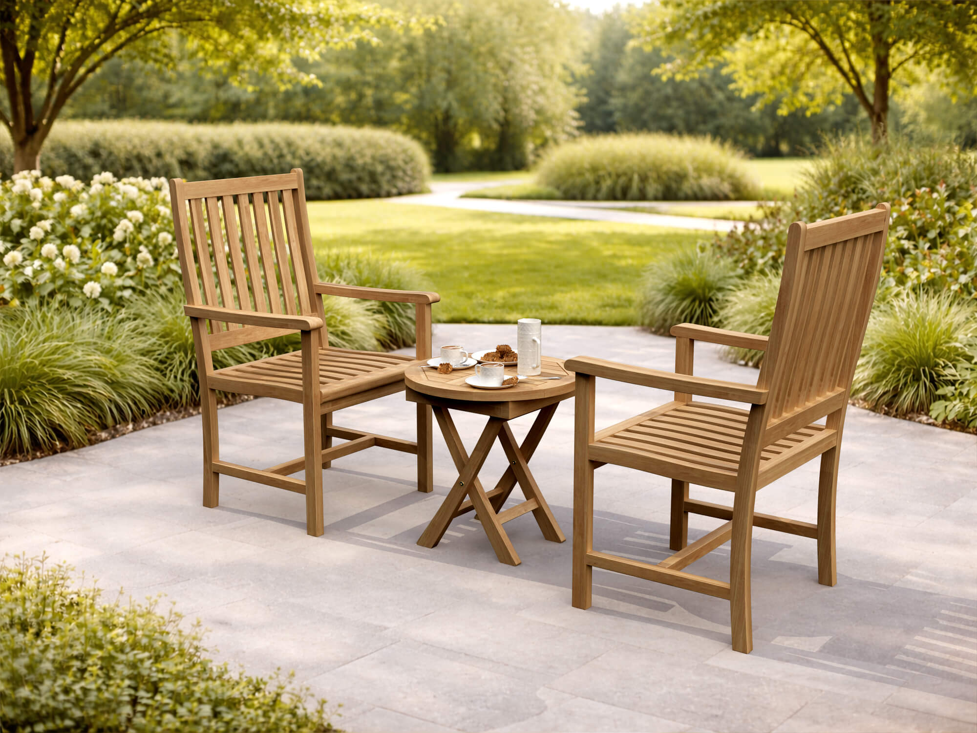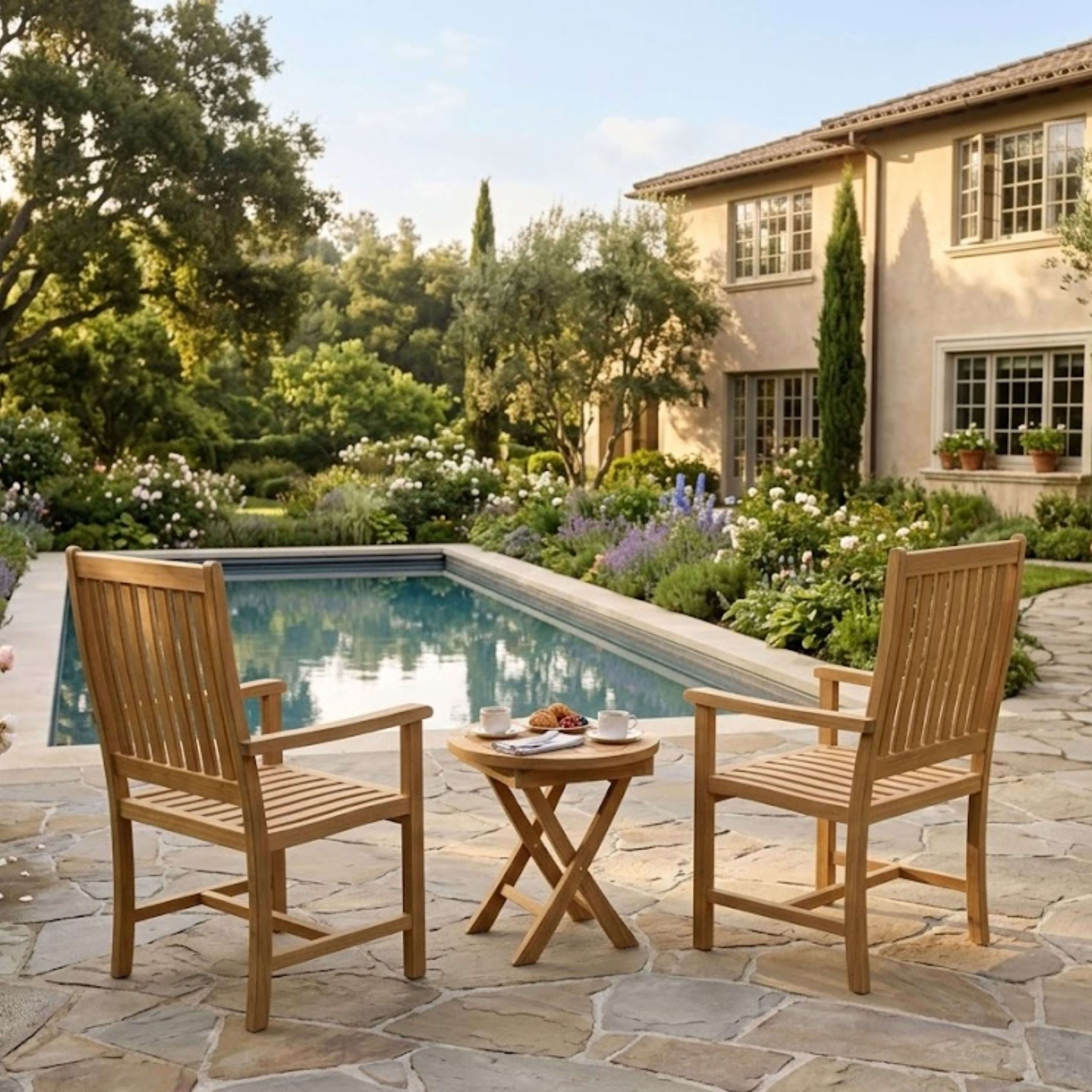 A perfect match for your patio or porch! Having two Wilshire dining armchairs and one functional side table make your backyard a nice place for relaxing after a long day of work. The Wilshire armchair have curve back to support your lower and upper back as well as the seat. While the mini side table is also perfect for putting glass of drinks or newspaper. Place this collection at the center of your backyard, will amazed your family and friends. SET-51 is well designed and is made for generations. Add all weather Sunbrella cushions for more comfort at your choice of colors.