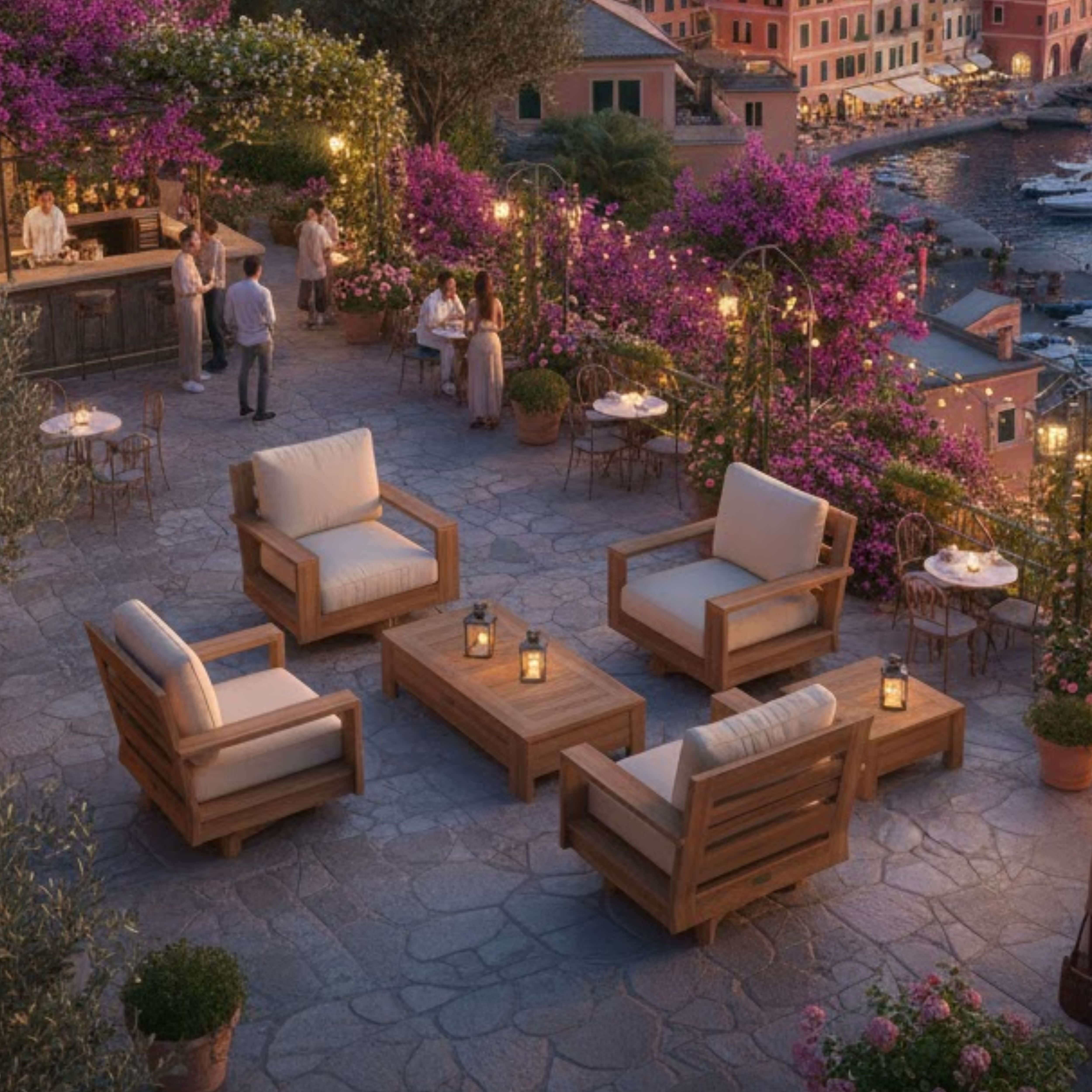 The perfect lounge set for family and friends, enjoy conversations, a game, or a drink with the Madera Deep Seating Swivel Set. Comfortable and stylish, it features 360 Degrees of Swivel movement that doesn’t snap back – but holds firmly in place at any position. Set includes the Madera Rectangular Coffee Table perfect for placing drinks, books, or playing cards and four swivel armchairs. Constructed of premium unfinished teak shaped to exquisite form, it includes 6” thick seating cushions from All-Weather