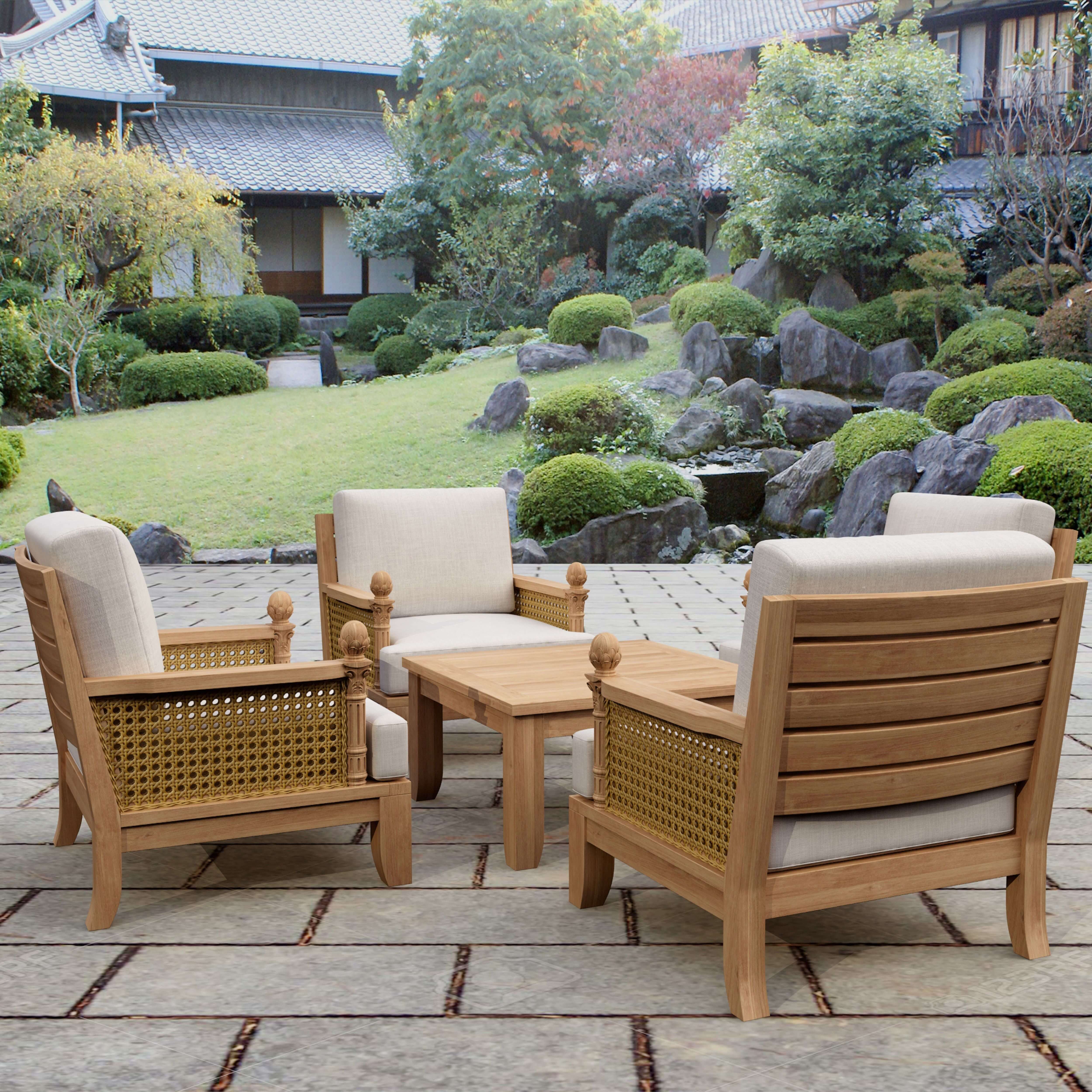 Luxe Deep Seating Armchair together with the Square Coffee Table indulges whoever seat on this pieces. The armchair style provides elegance, comfort and uniqueness for your backyard area. One of a kind finial artichoke handcrafted by the professional carpenter. Yet, it built with extra thick premium grade A Teak and Sunbrella cushions to last generations.