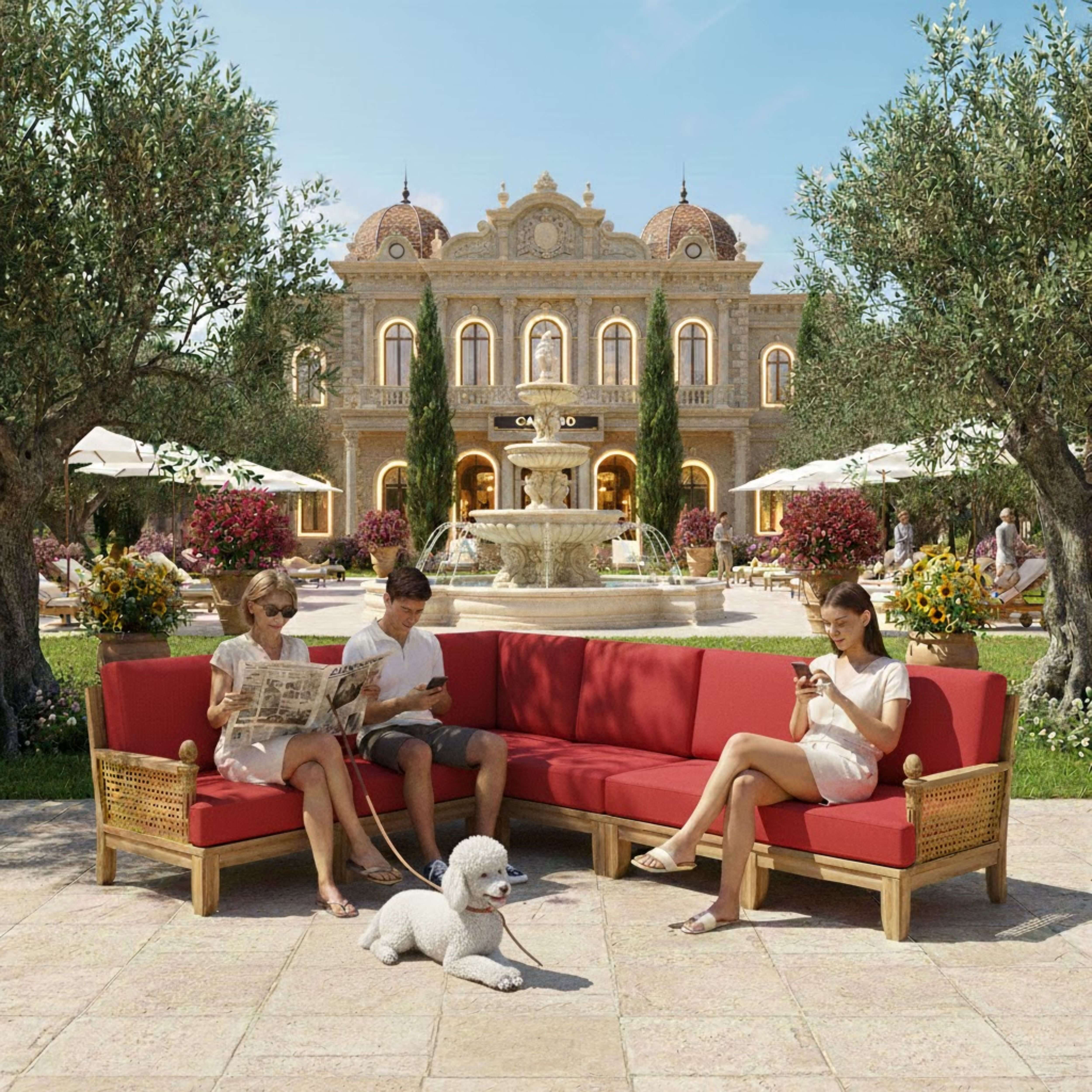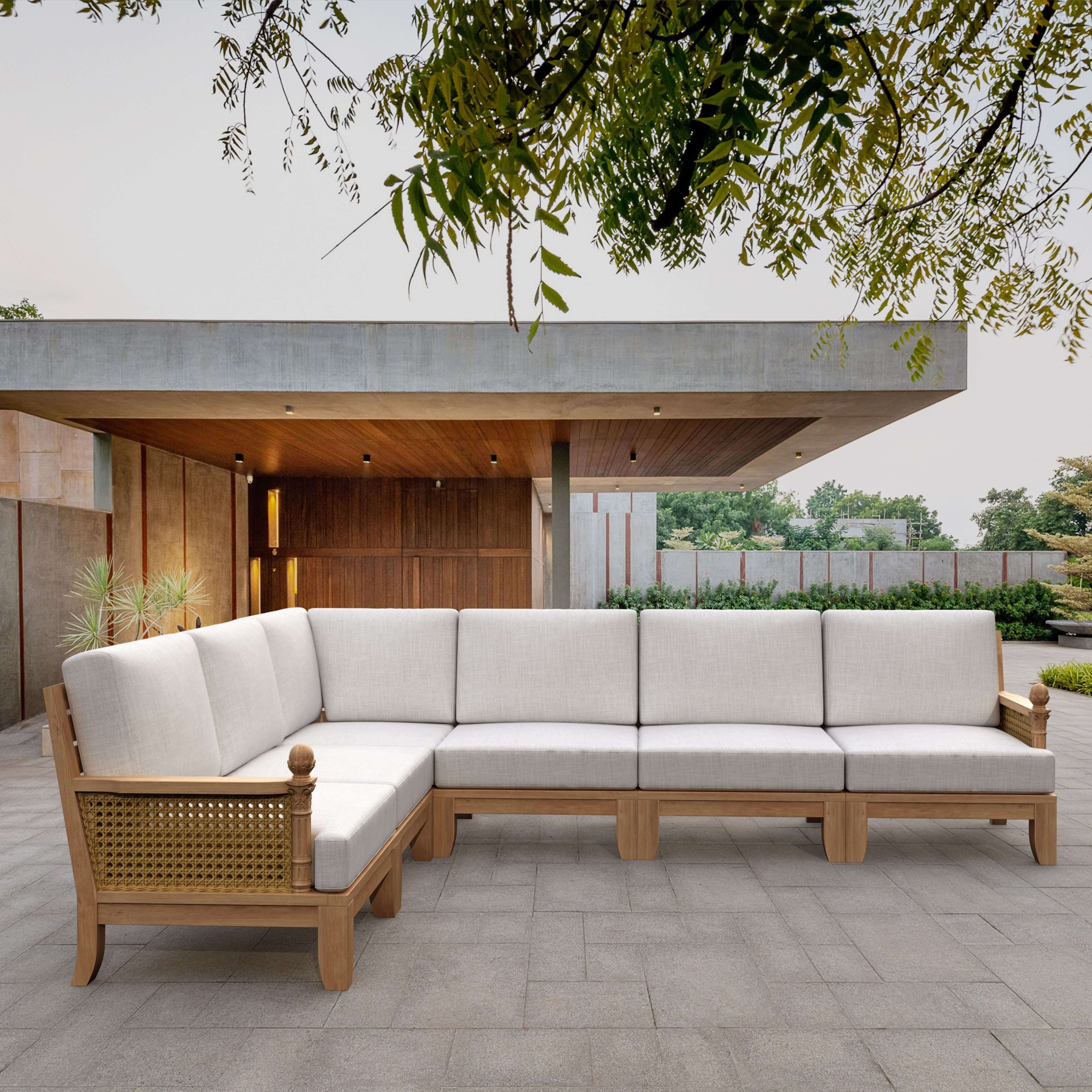 • Expertly Crafted teakwood with synthetic wicker & thick, cozy cushions for a luxurious feel.