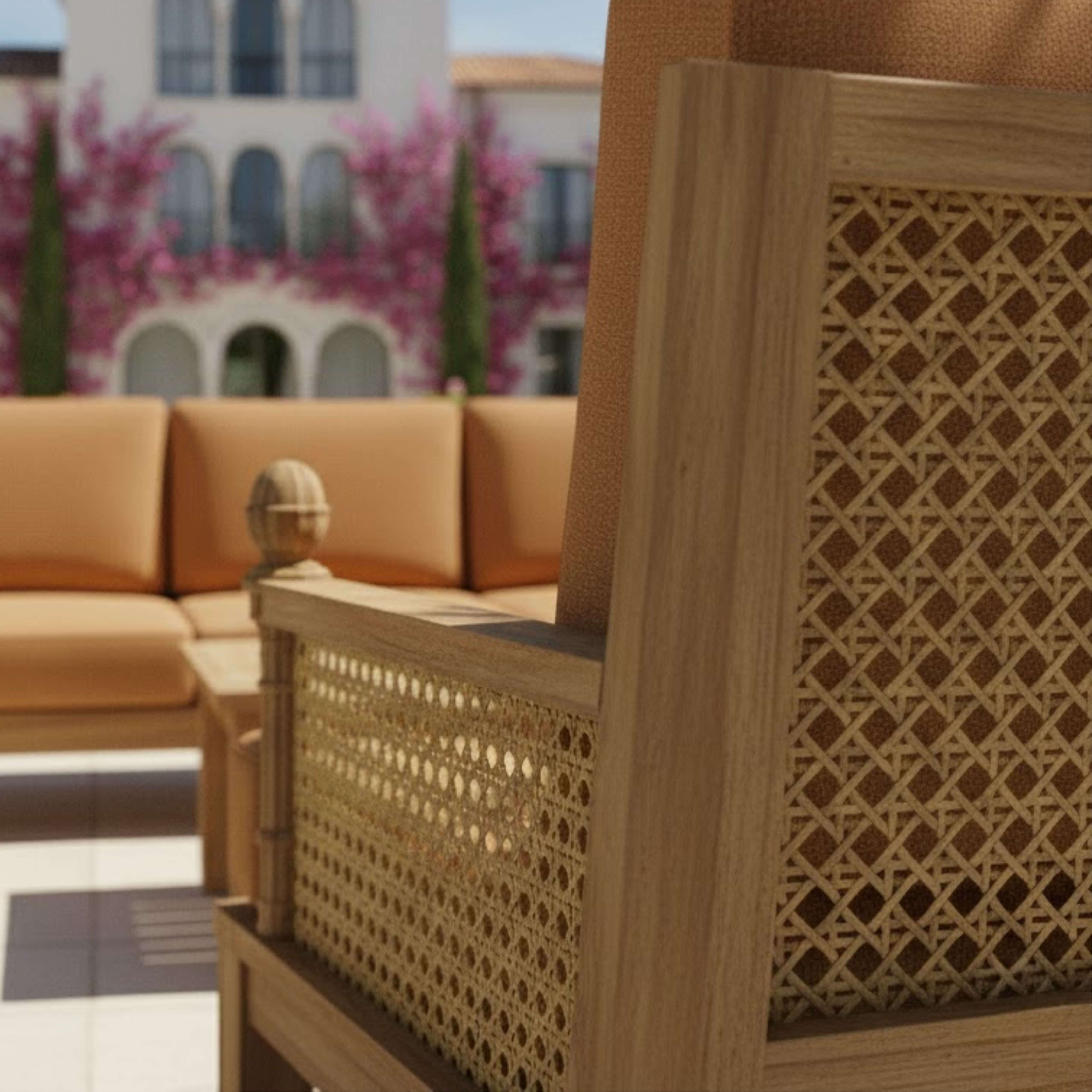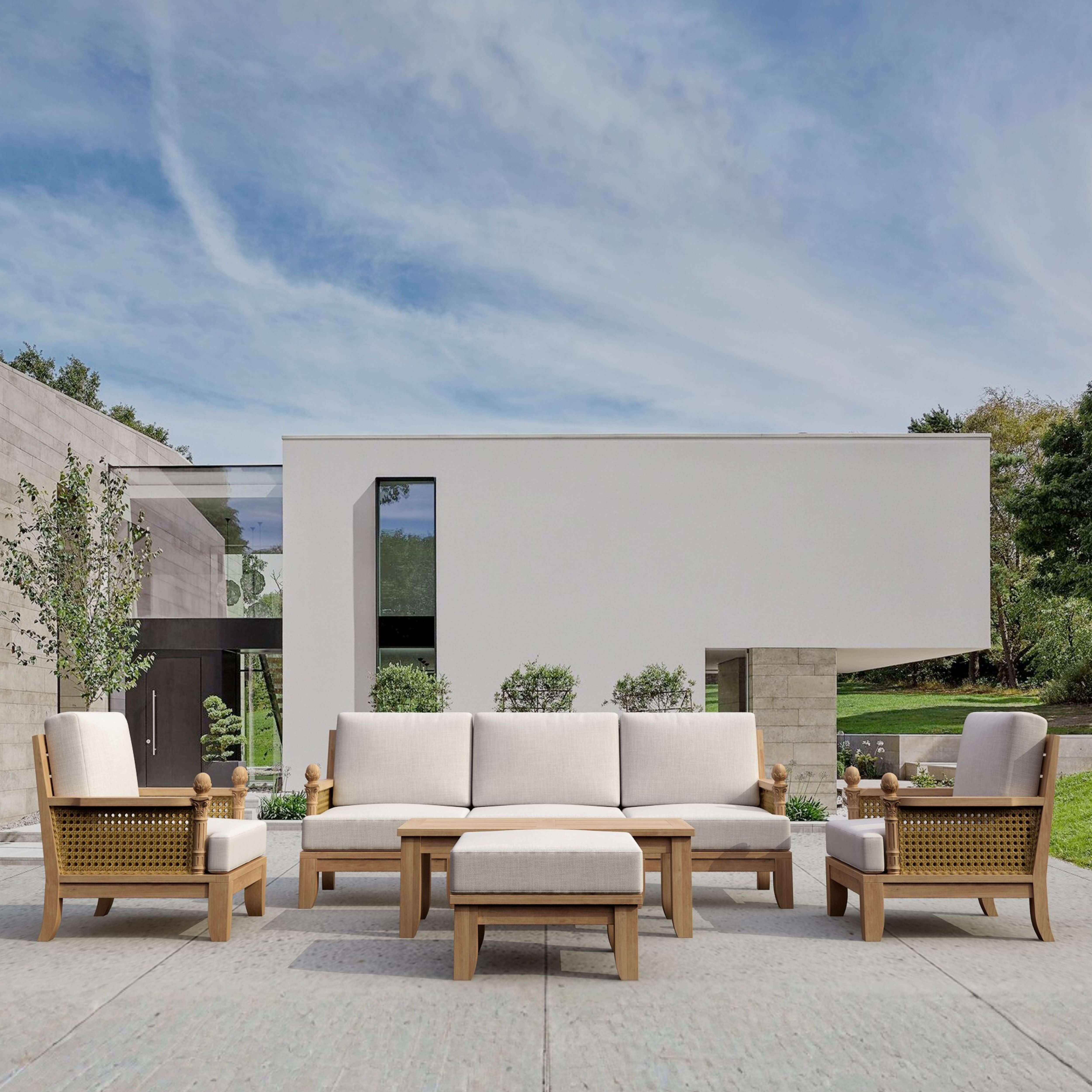 • Expertly Crafted teakwood with synthetic wicker & thick, cozy cushions for a luxurious feel.