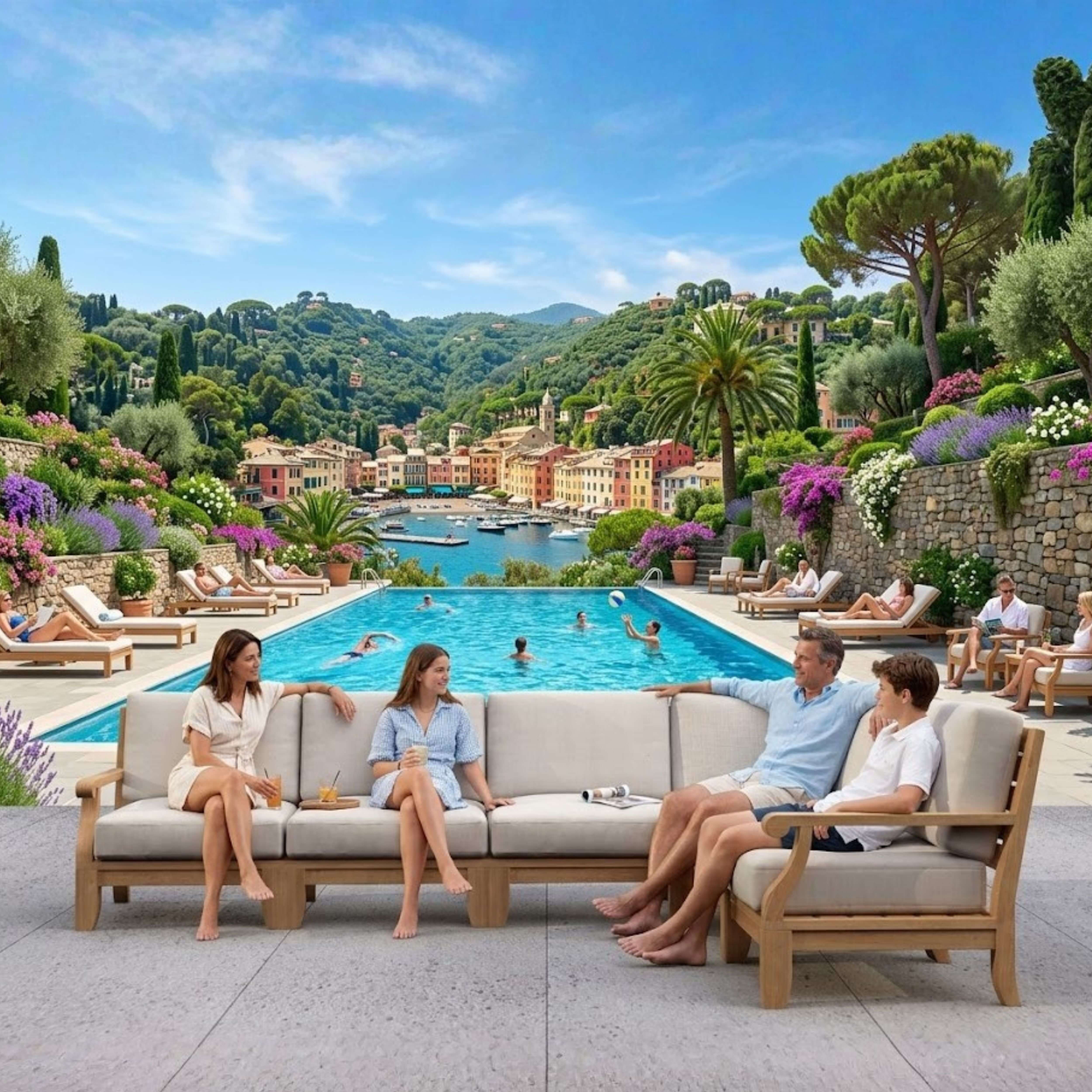 from All-Weather Sunbrella fabrics with choice of color and pattern that truly makes this teak deep seating pop.