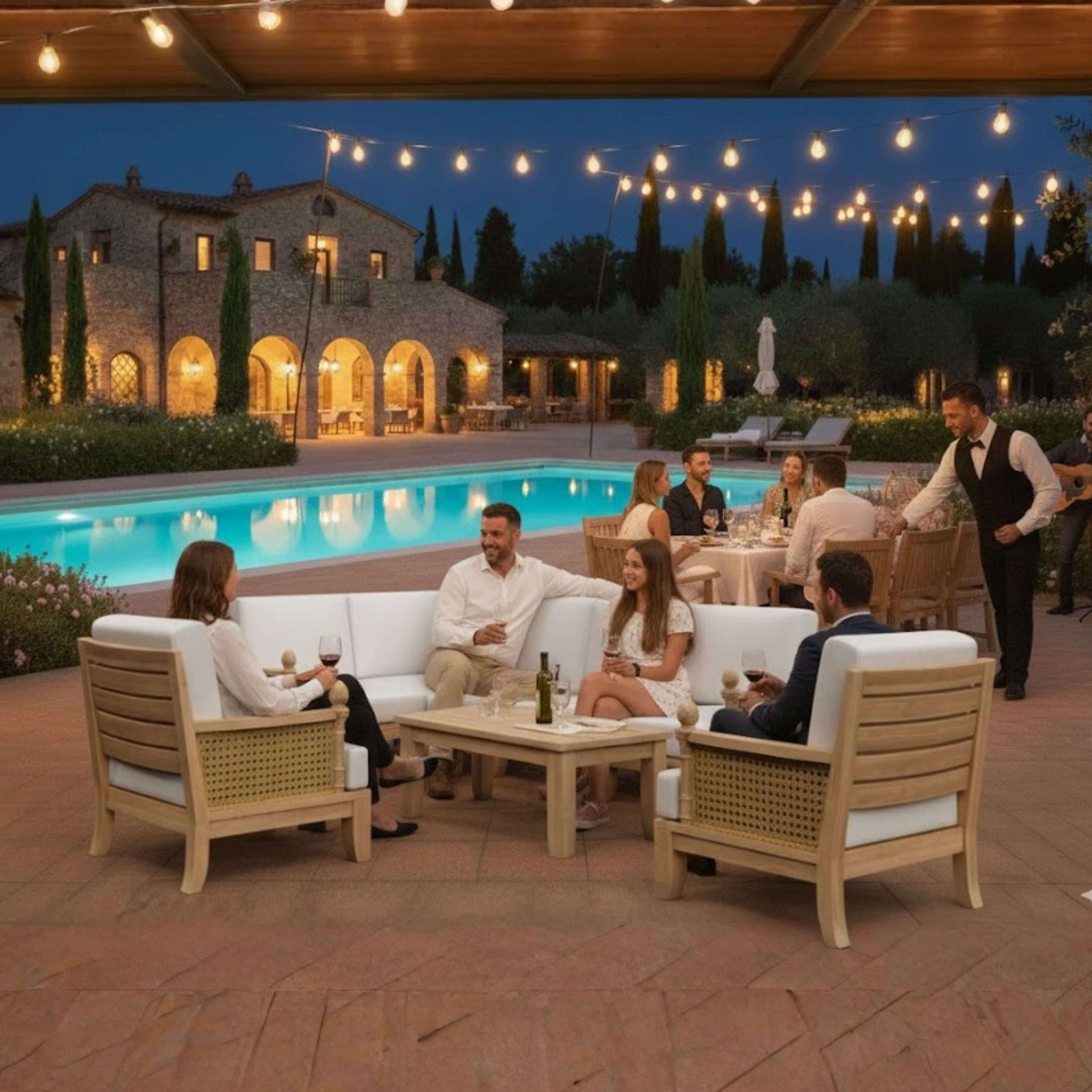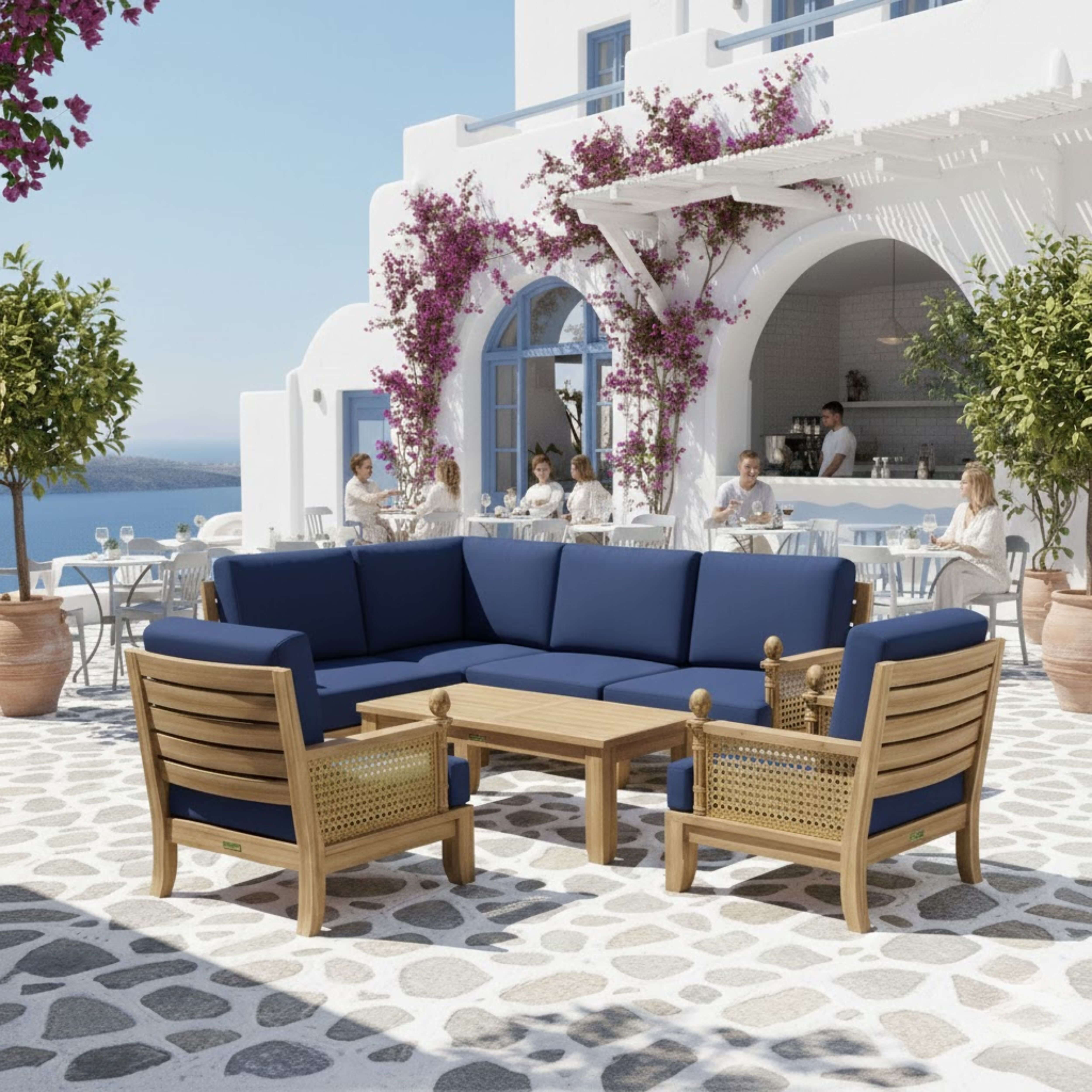 • Expertly Crafted teakwood with synthetic wicker & thick, cozy cushions for a luxurious feel.