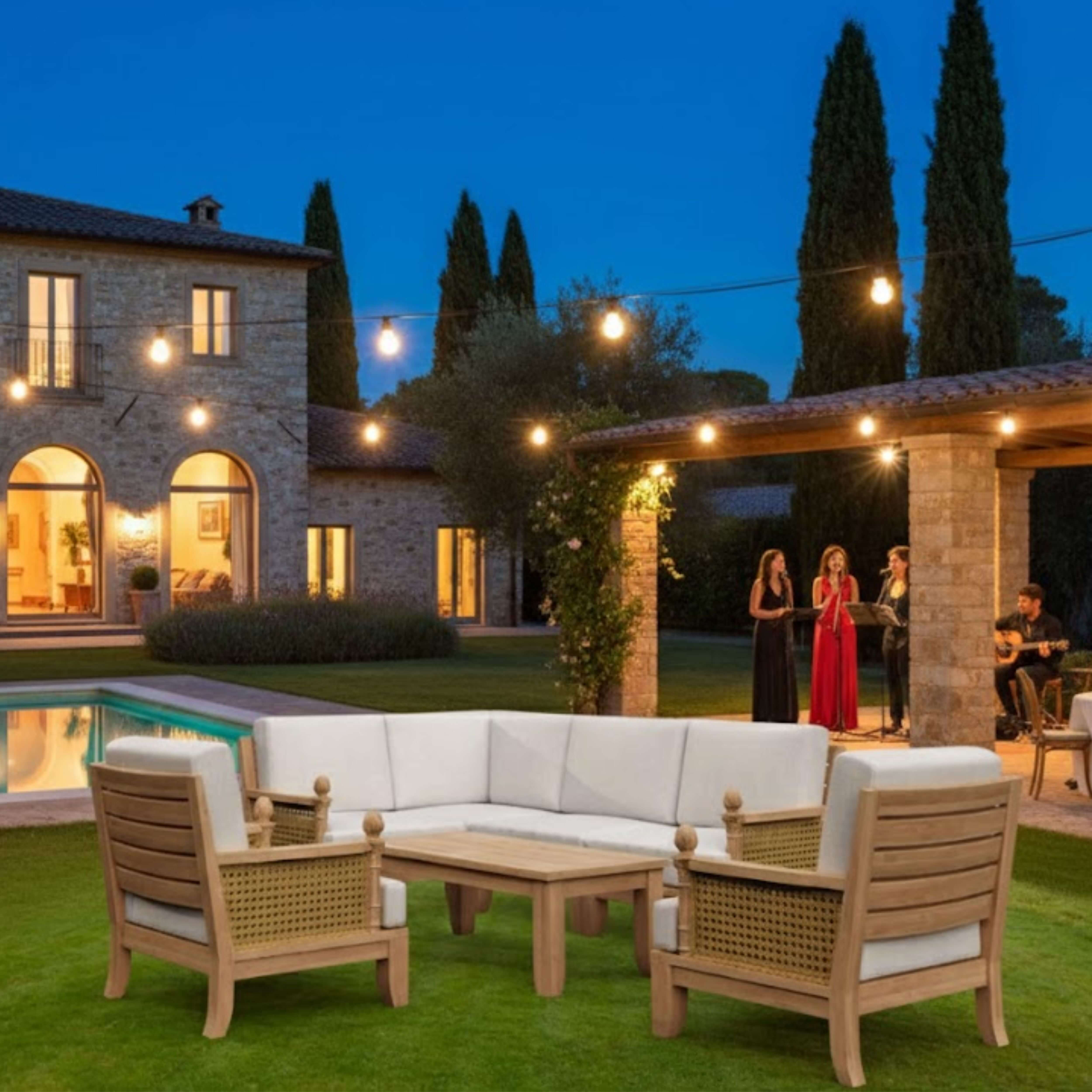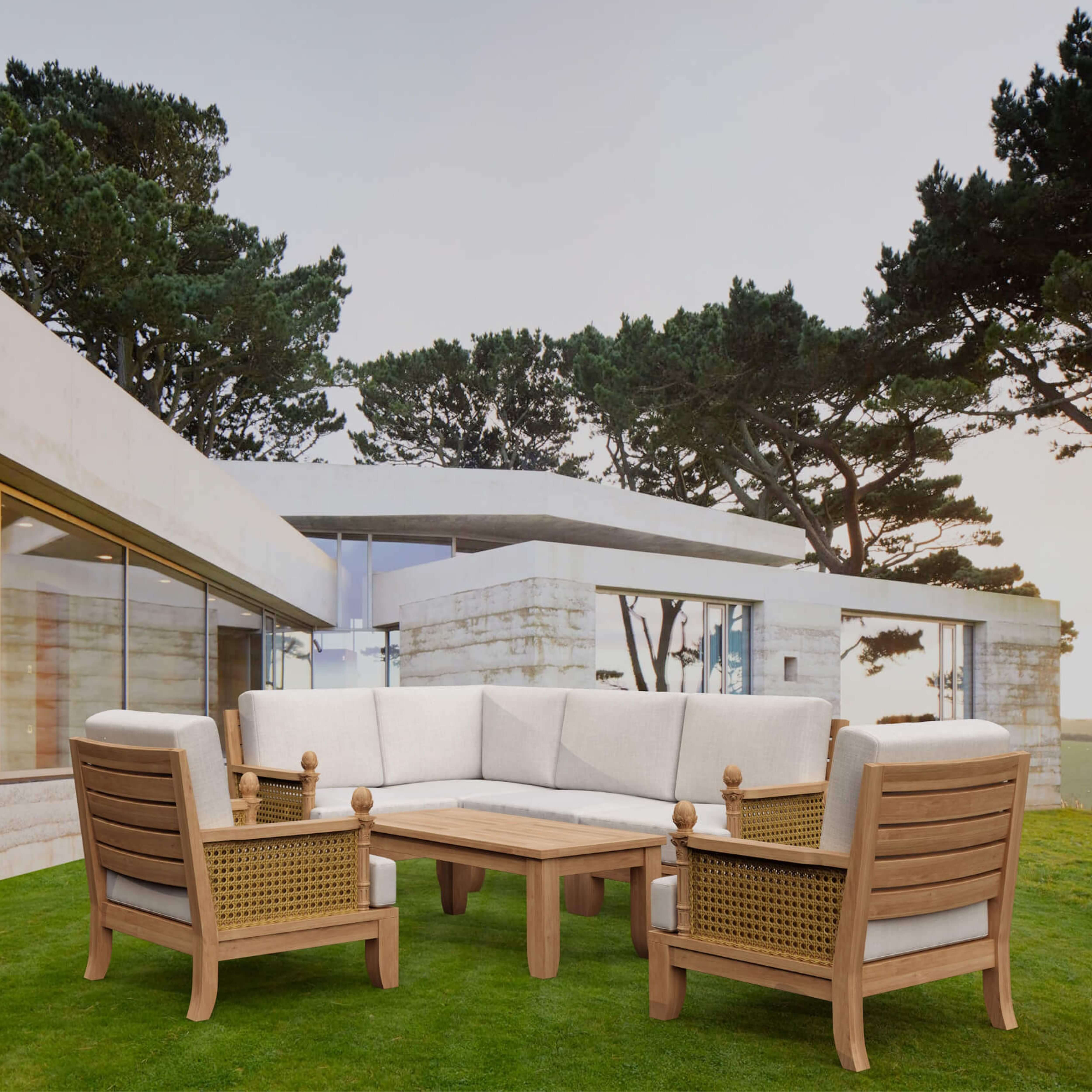 The Luxe Modular Seating Collection exhibits classic elegance with intricate detailing that provides modern comfort. The modular style provides flexibility to accommodate any décor. Built with extra thick Grade A Teak and Sunbrella cushions to last for generations. It comes in knocked down, with easy assembly.