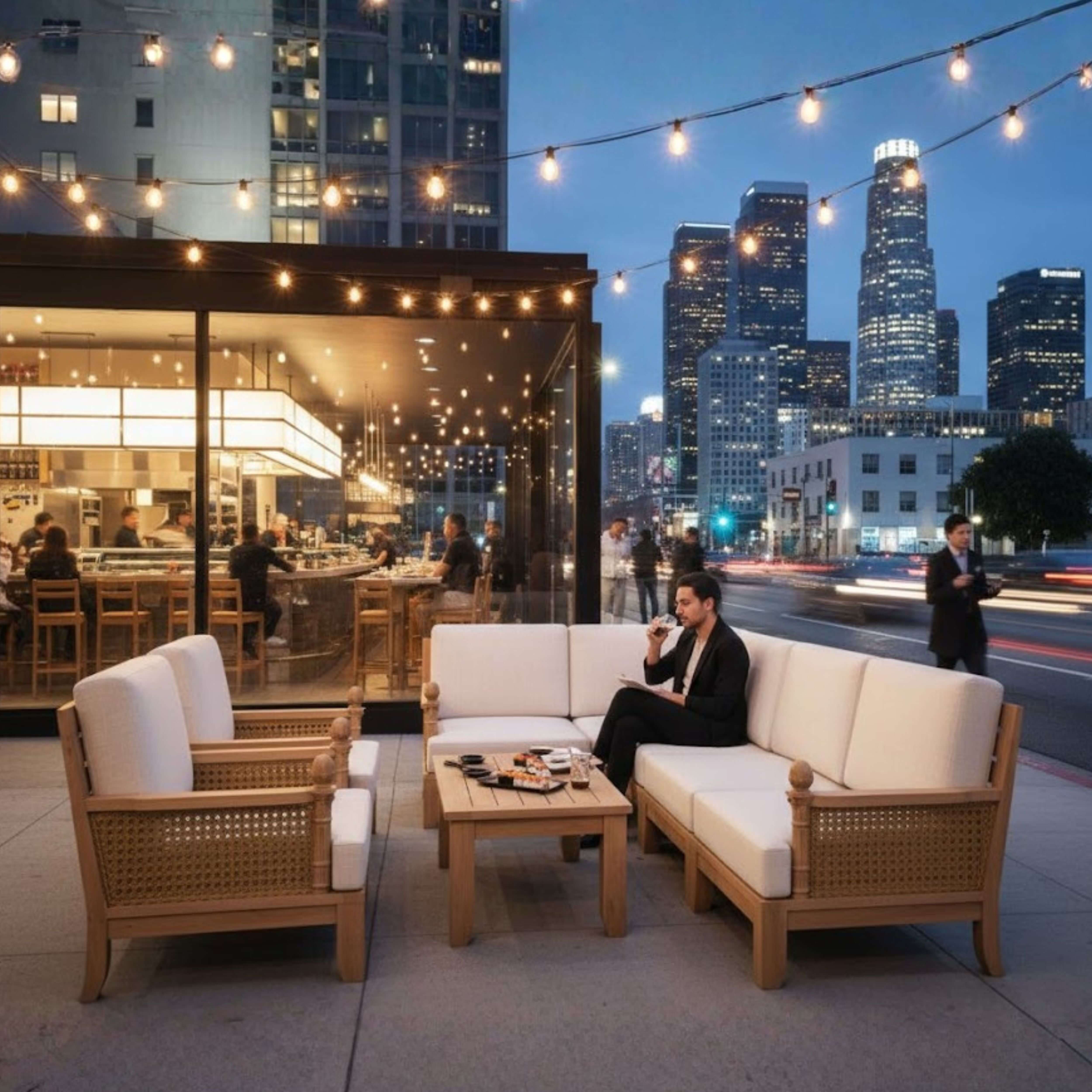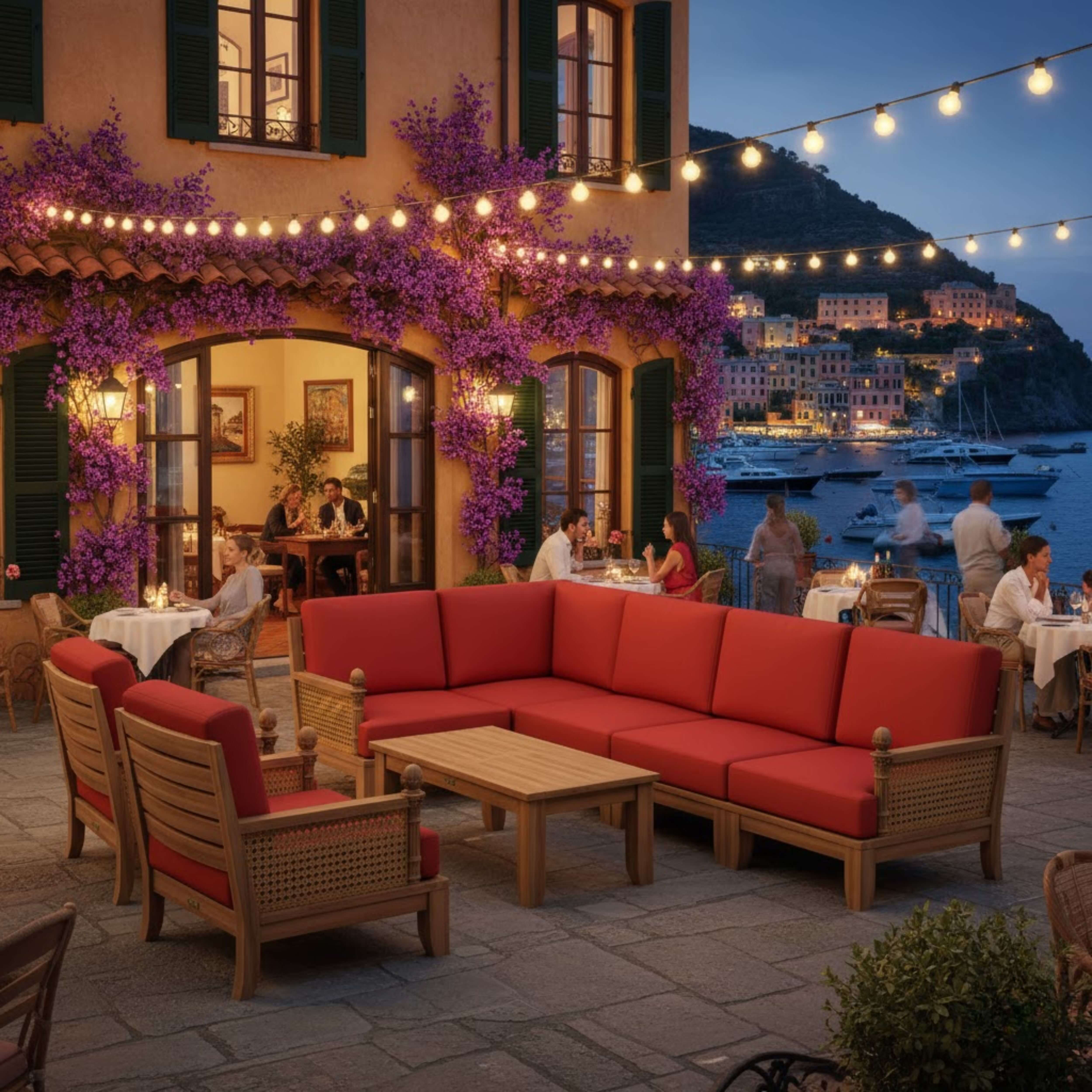 • Expertly Crafted teakwood with synthetic wicker & thick, cozy cushions for a luxurious feel.