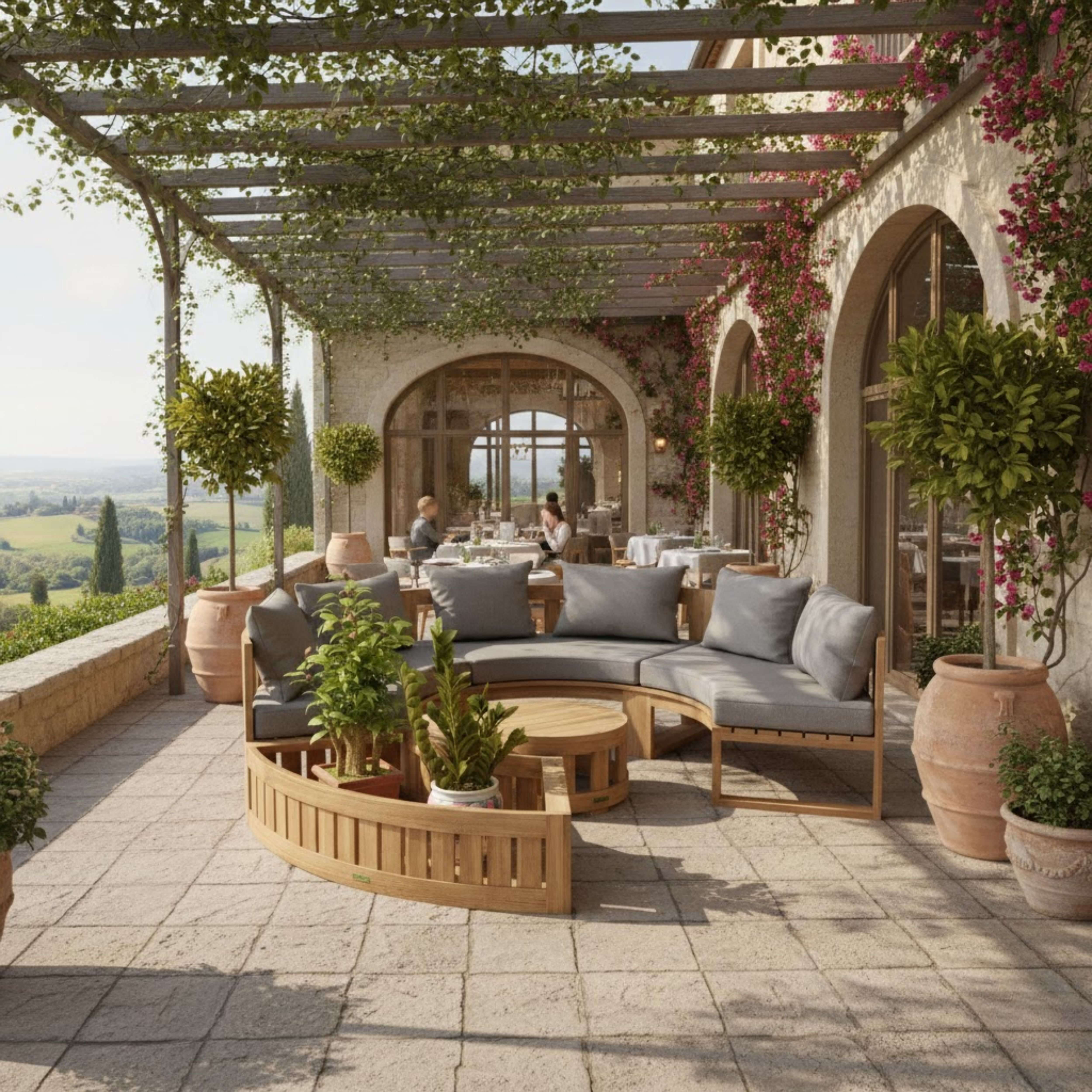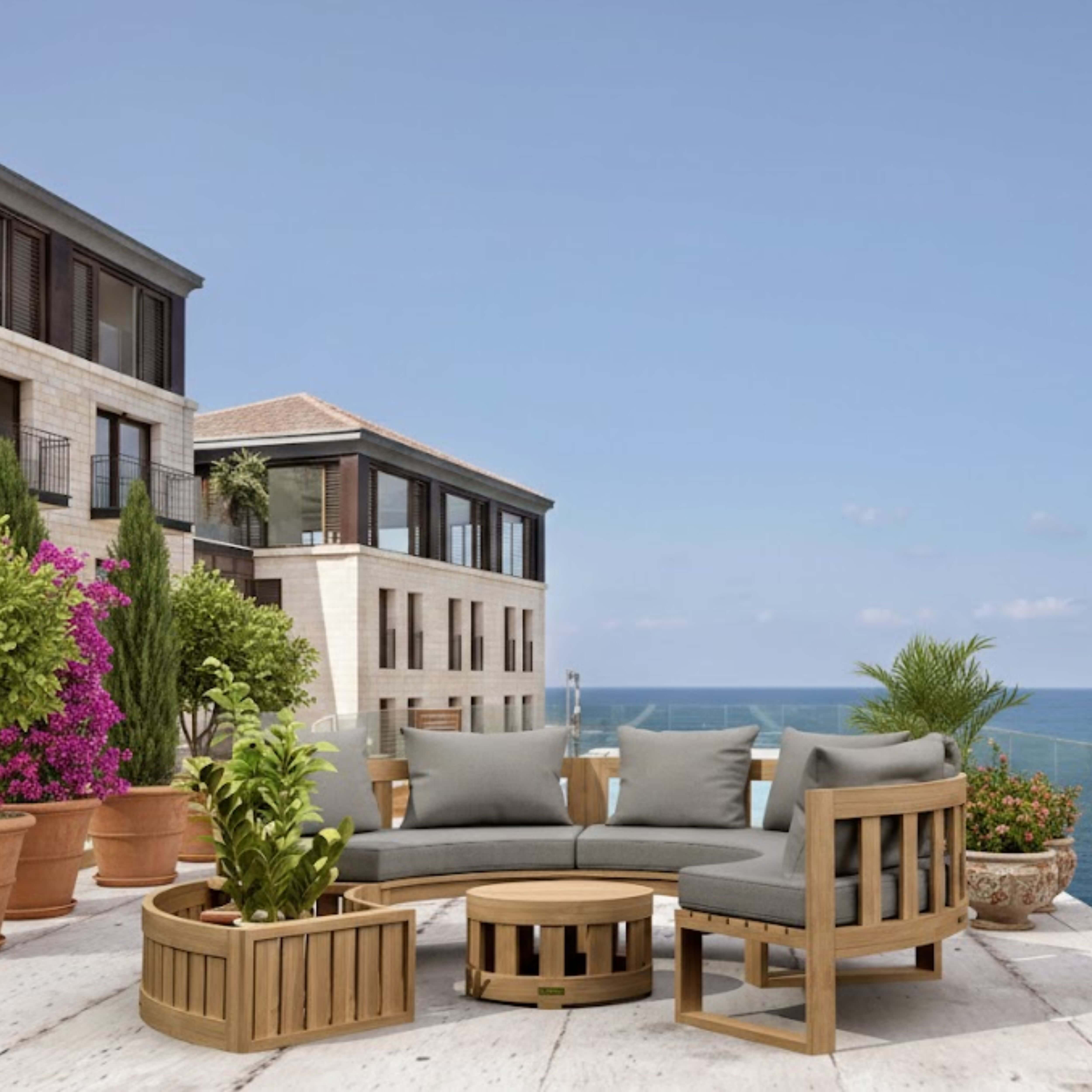 Perfect for public and commercial use, this Circular Modular Bench is the ideal deep seating set for the yard and outdoors. Featuring three benches that seats two, one circular planter and a round side table, the collection is made of premium grade unfinished teak that’s sanded smooth for a clean natural finish. Add additional pieces from the collection such as the straight bench and a straight side table or the circular planter and straight side table, which can be placed on either the edges or the middle of the set. Mix and Match different styles and layouts such as a “c” shape, an “s” shape with seats facing each other, or a fully circular layout. The possibilities are endless the choice yours. Includes 5” thick seating cushions and pillows from All-Weather Sunbrella fabrics with your color option.