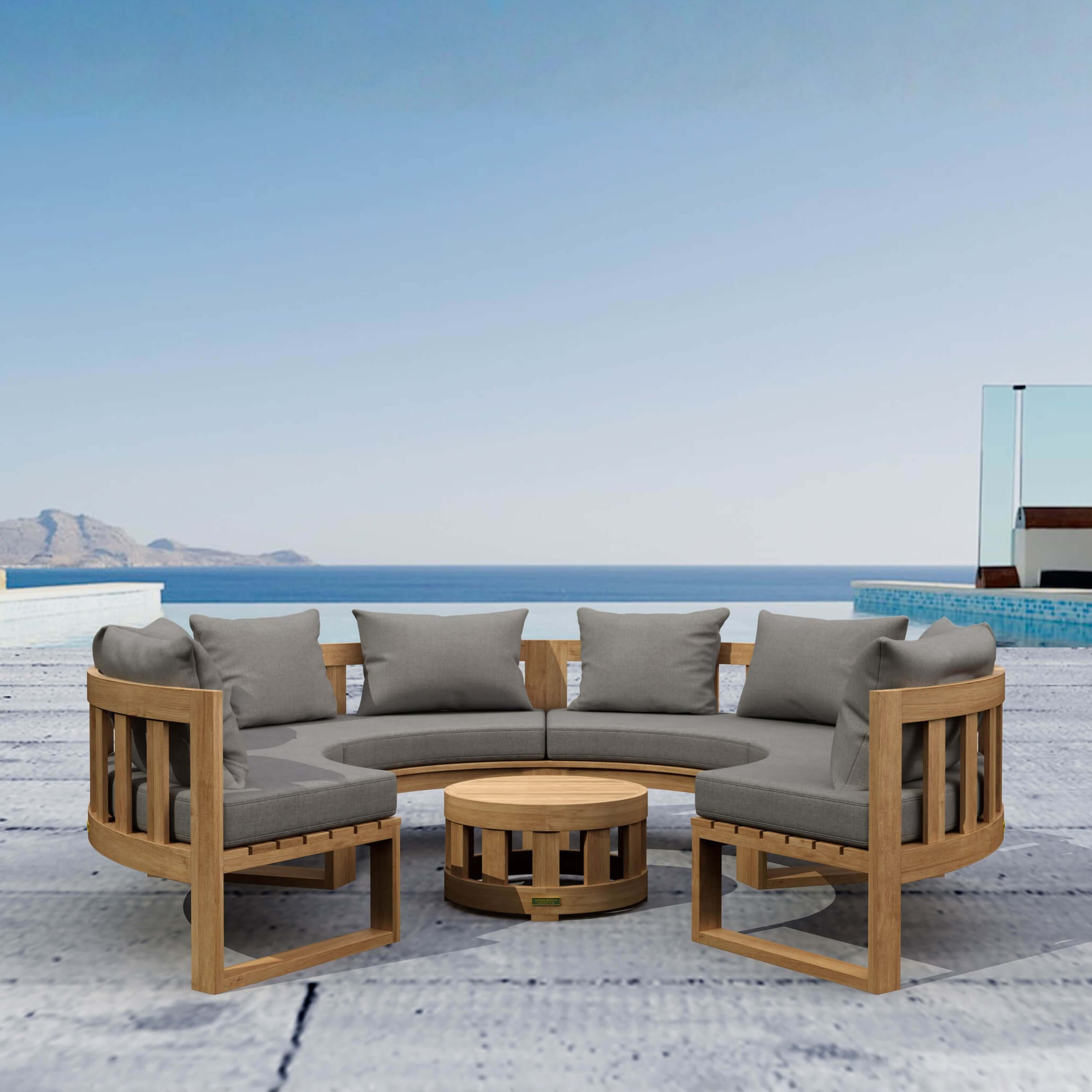 Durable and strong enough for public & commercial use, this Circular Modular Set is also perfect for personal home use for the yard and outdoors. Featuring four circular benches and a round coffee table, it’s made from premium grade unfinished teak; the perfect material for weathering the outdoors through hail, rain or shine. Add additional pieces from the Circular Modular collection such as a circular and straight planter, the straight bench, and the straight side table, which can all be placed on either the edges or middle of the set. Mix and Match different styles and layouts such as this “c” shape, a circular layout, or an “s” shape layout with seats facing