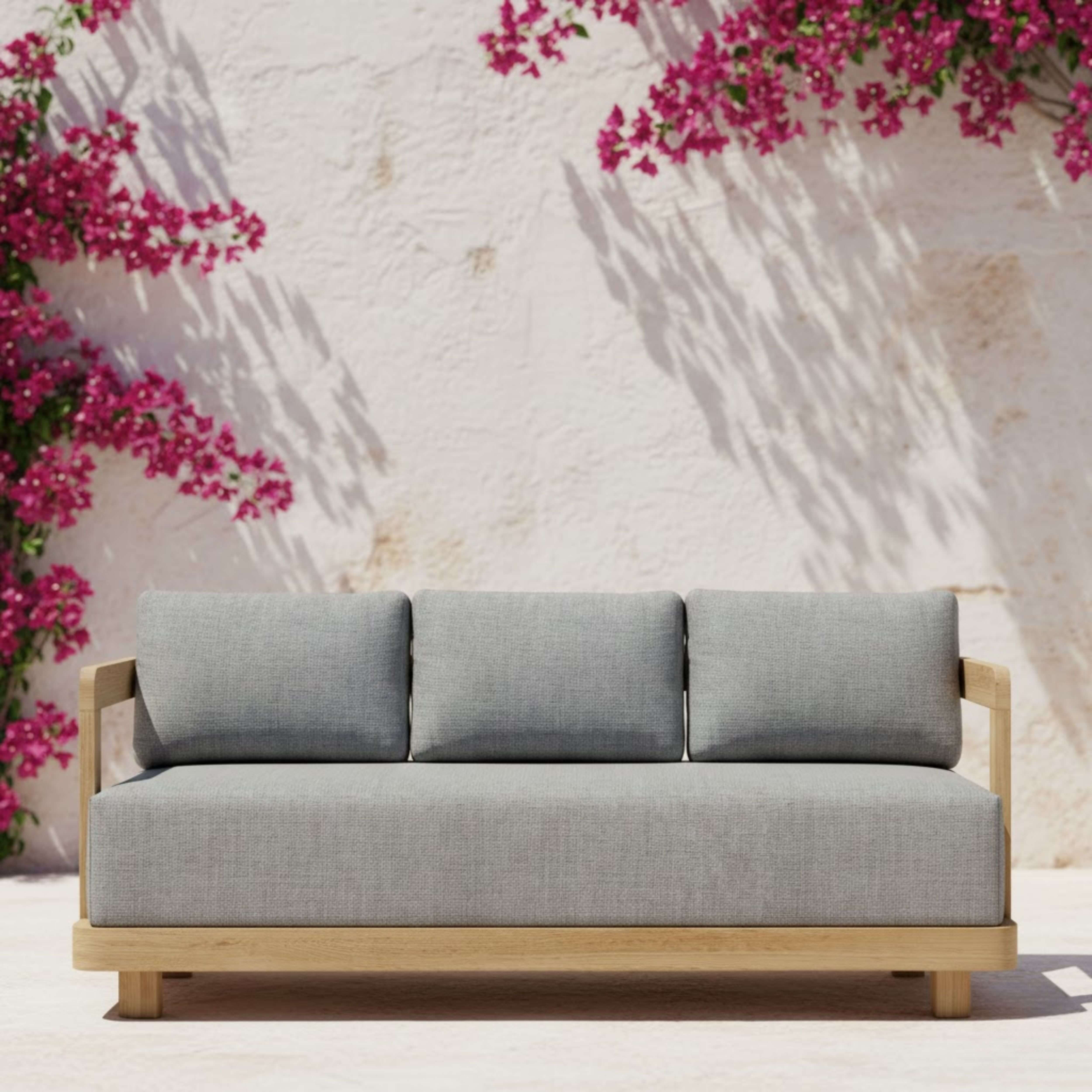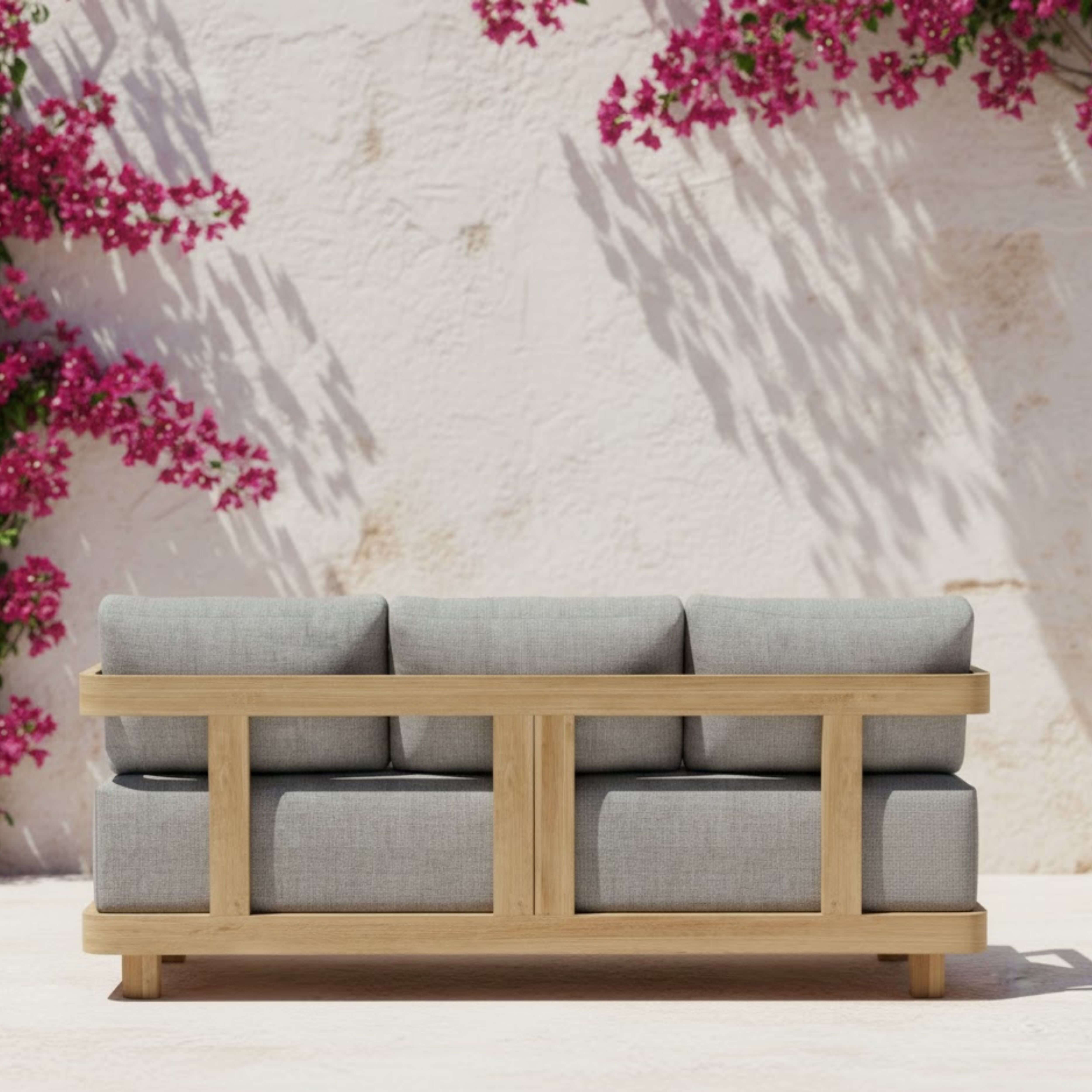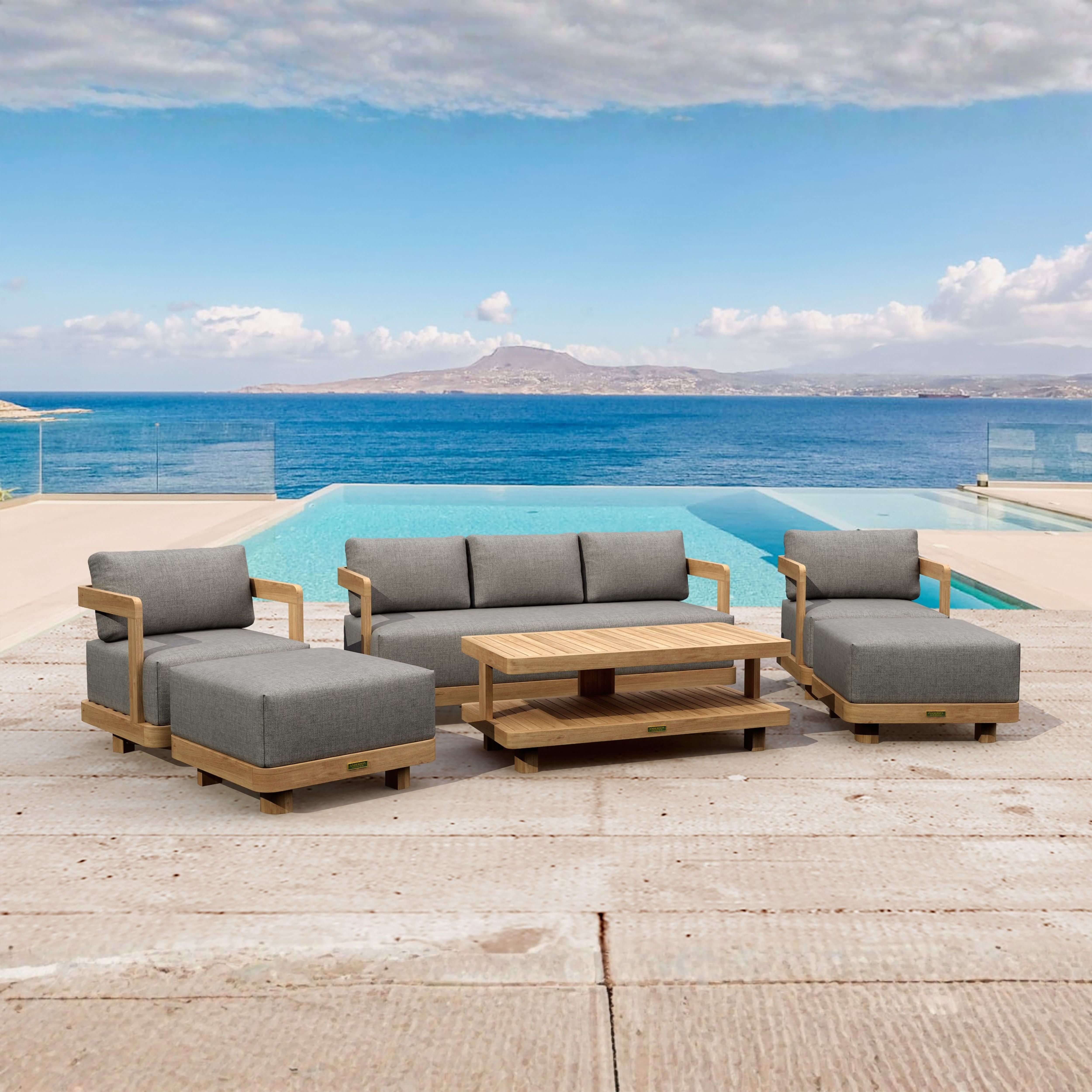 Featuring a sleek modern design and a large wondrous presence, the spaciously wide and quality built Granada Deep Seating Sofa is sure to make any setting or décor pop. With large cushions over 10½” inches in seating thickness; it’s firm yet soft seating makes for a comfortable and satisfying deep seating experience. The set also includes the two-tier Granada Rectangular Coffee Table with two Granada Armchairs and two matching Ottomans, the perfect way to spend a relaxing evening lounging in the comfort of the outdoors. Constructed from premium grade teak wood that’s unfinished and sanded smooth and Cushions from All-Weather Sunbrella Fabrics, it’s the perfect material for extended outdoor as well as indoor use. Cushions included with color and pattern options.