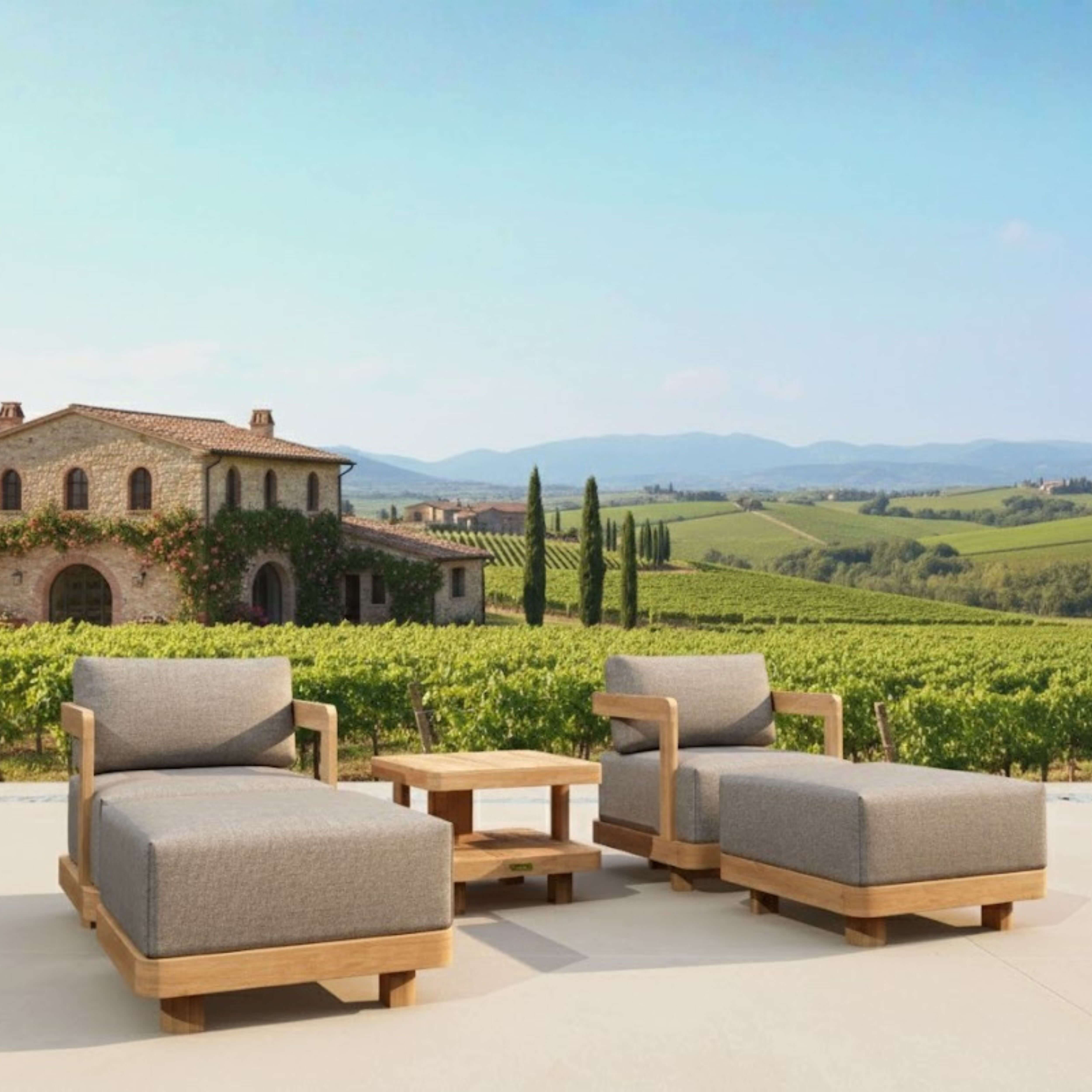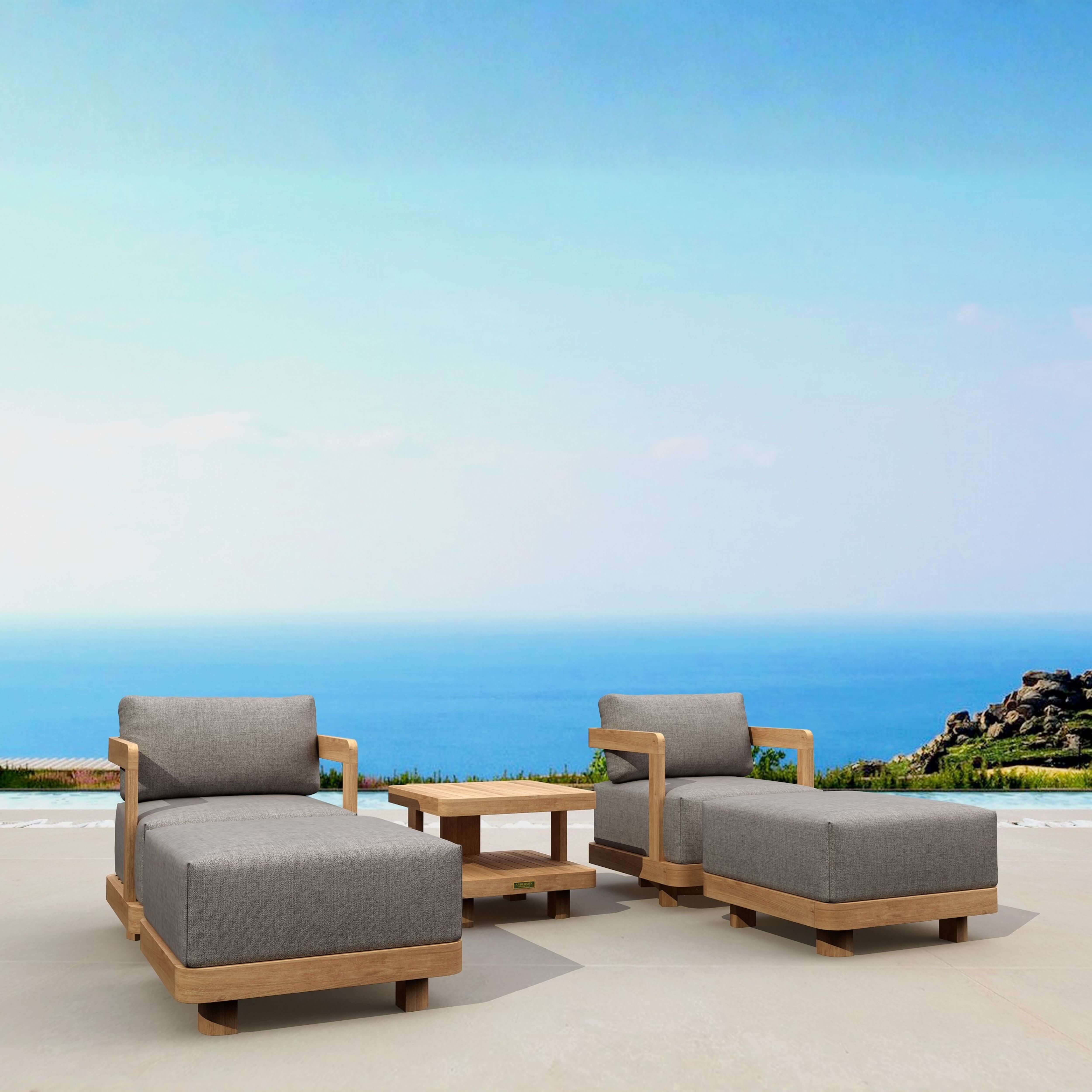Rest your weary legs on the ottoman and relax in deep seating comfort with this 5-Piece Granada Swivel Set. Comfortable and stylish, it’s made from premium grade teak that’s unfinished and sanded smooth for a natural smooth finish. The perfect place to spend a relaxing evening lounging, drinking, and chatting with a partner or friend, this set includes two Granada Swivel Armchairs that rotates up to 360 Degrees of movement and holds firmly in place. Featuring spaciously large seating space measuring 26” by 26½” and large cushions measuring 10½" in thickness, it is a most comfortable seating experience, one that is hard and firm yet the cushions comforting and soft. Also includes two Granada Ottomans and the matching 2-Tier Granada Square Side Table, perfect for placing snacks, drinks, or a book. Cushion color and pattern options from All-Weather Sunbrella fabrics included.