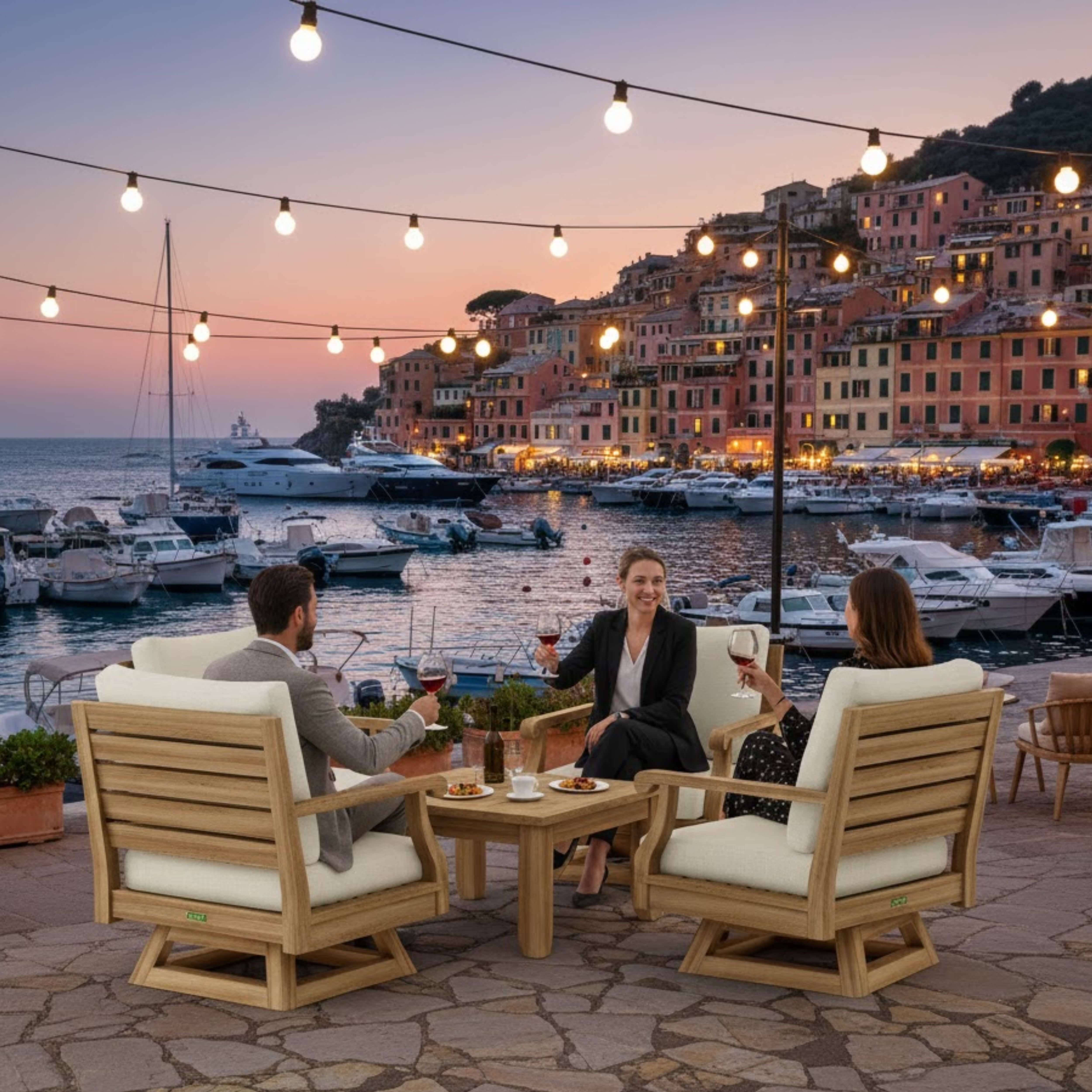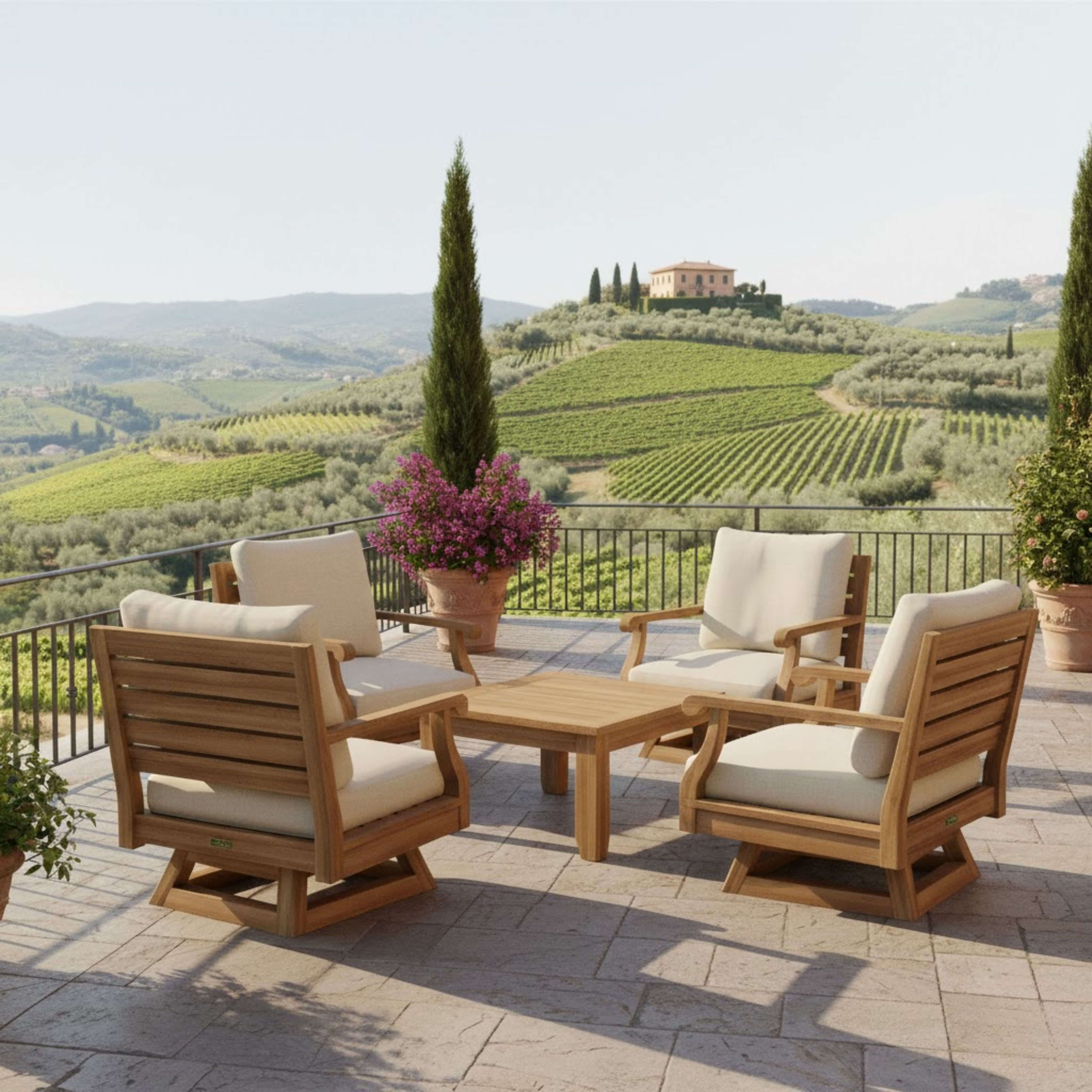 SET-98C which includes four Riviera Swivel Armchairs and one 33″ Square Coffee Table is a standout piece of furniture that blends deep seating comfort with 360 degrees of swivel functionality. The swivel armchairs with its accentuated curve design and armchair whorl complements the 33″ Square Coffee Tables tapered leg for a unique flowing pattern design. Constructed using our finest grade of unfinished natural teak built for quality and thickness, the set also includes 6″ All-Weather Sunbrella Fabric with Cushions of your color choice and pattern.
